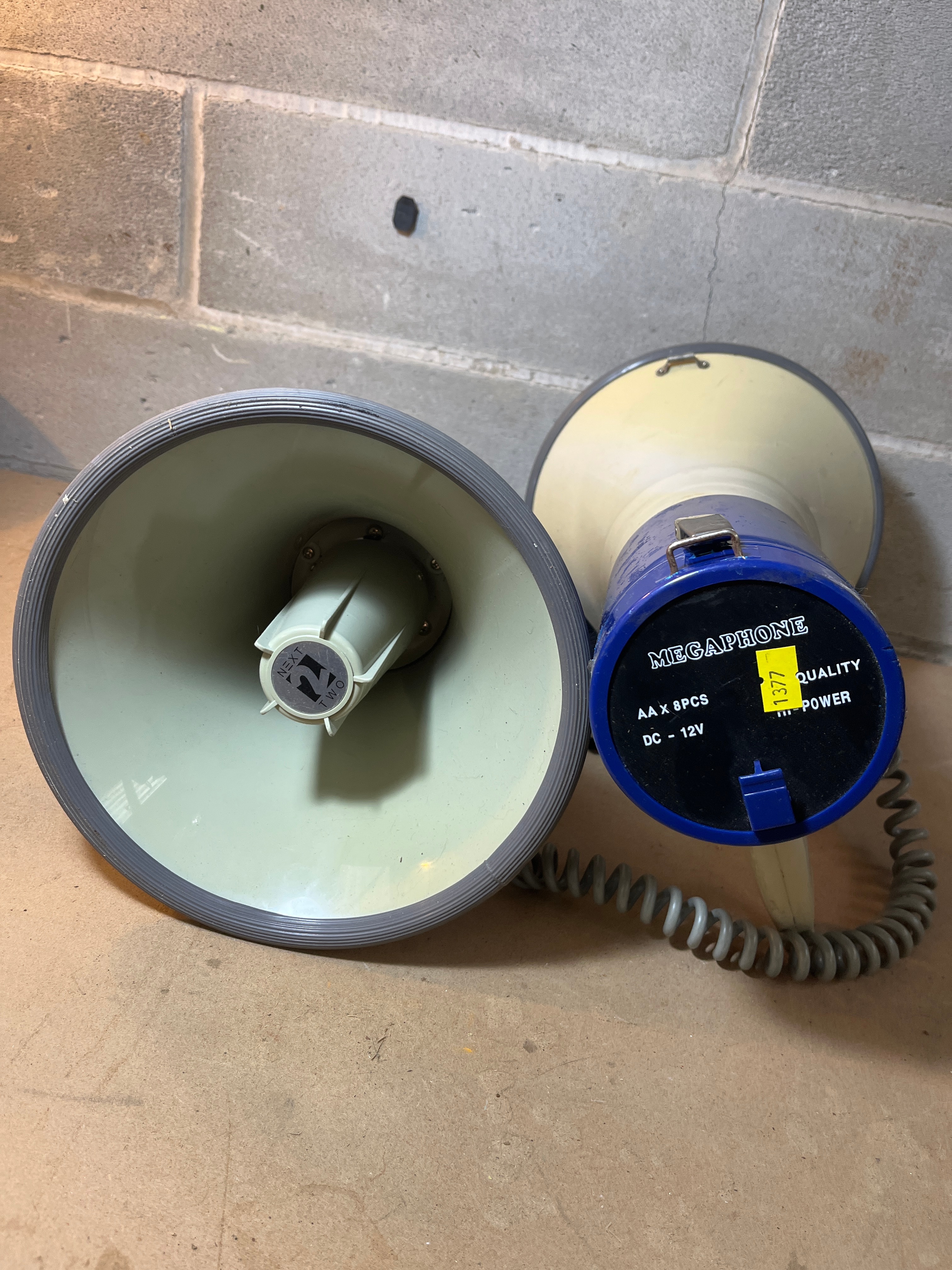 A pair of handheld electronic megaphones, each featuring a cream-colored plastic horn and handle. One unit presents with a light blue upper body and displays a “CE” symbol on its side. The second unit has a darker blue upper section, marked “MEGAPHONE,” “AA x 8PCS,” “DC – 12V,” “QUALITY,” and “TP POWER.” This darker blue megaphone includes a coiled cord connected to a separate handheld microphone unit. A circular label with a stylized “W” or “M” logo is present inside the horn of the darker blue unit. One megaphone bears a yellow sticker inscribed “1377.”
