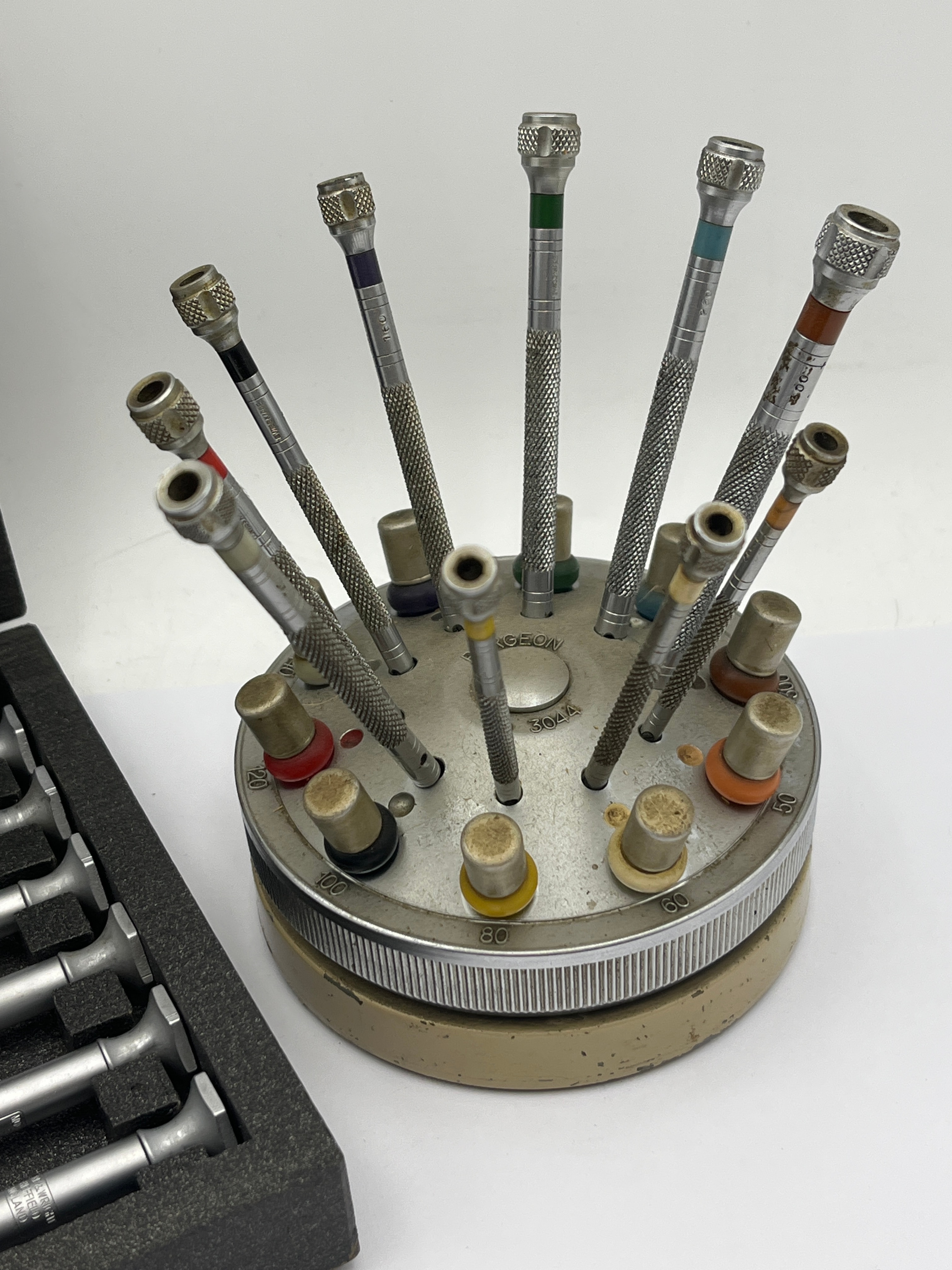 A collection of watchmakers’ precision screwdrivers, comprising two distinct sets. The first is a BERGEON multi-tiered metal stand holding approximately thirteen precision screwdrivers. The stand is visibly marked “BERGEON” around the central tool and displays various millimeter size indicators, such as “0.50,” “0.60,” “0.80,” “1.00,” “1.20,” “1.40,” “1.60,” “2.00,” “2.50,” and “3.00,” correlating with the respective slots. The screwdrivers feature ridged metal handles, with several distinguished by colored bands (e.g., red, yellow, green, blue, purple, black, orange) near their tips. The second component is a rectangular black wooden or particle board box with a textured exterior and a brass-toned clasp, featuring a gold oval logo on the lid displaying “M & W”. Inside, the box is fitted with a dark foam or felt insert cradling a set of eight individual metal precision screwdrivers, each with a ridged handle and various fine tips. These tools are indicative of those used in watchmaking, jewelry repair, or fine instrument maintenance.