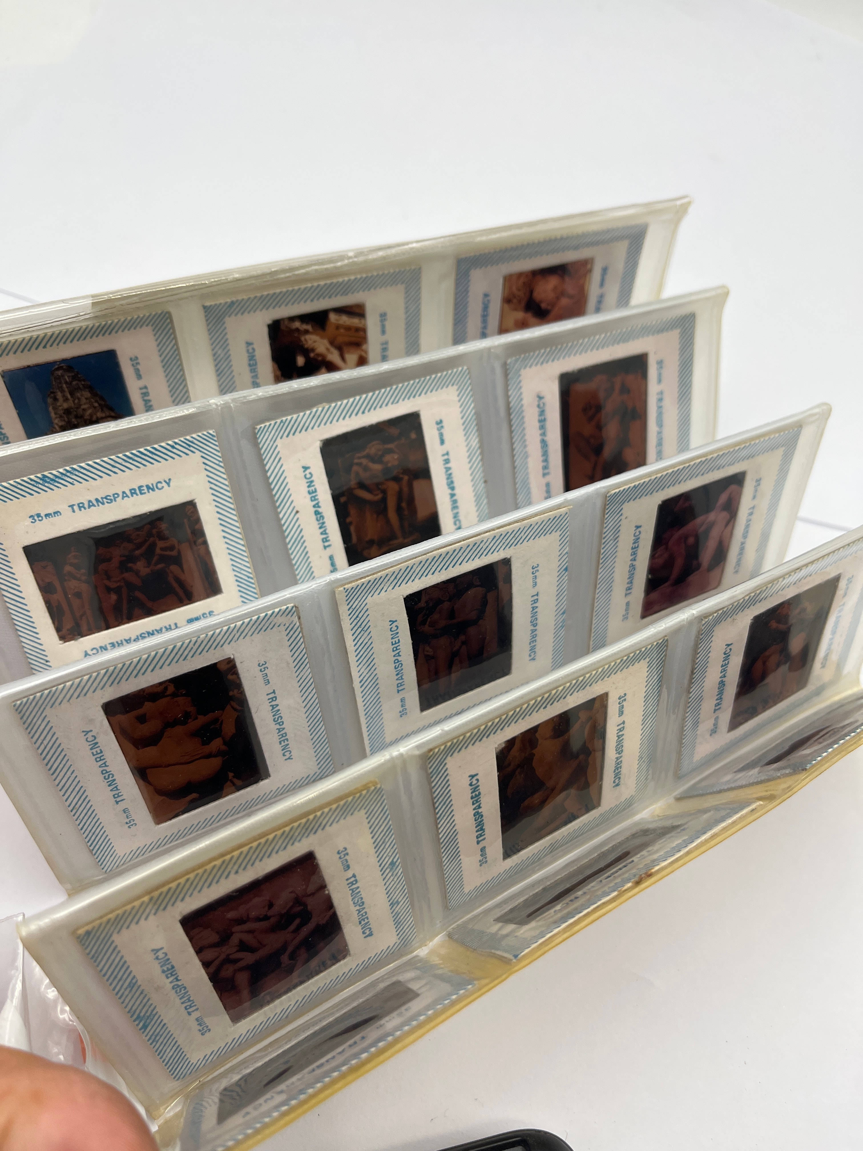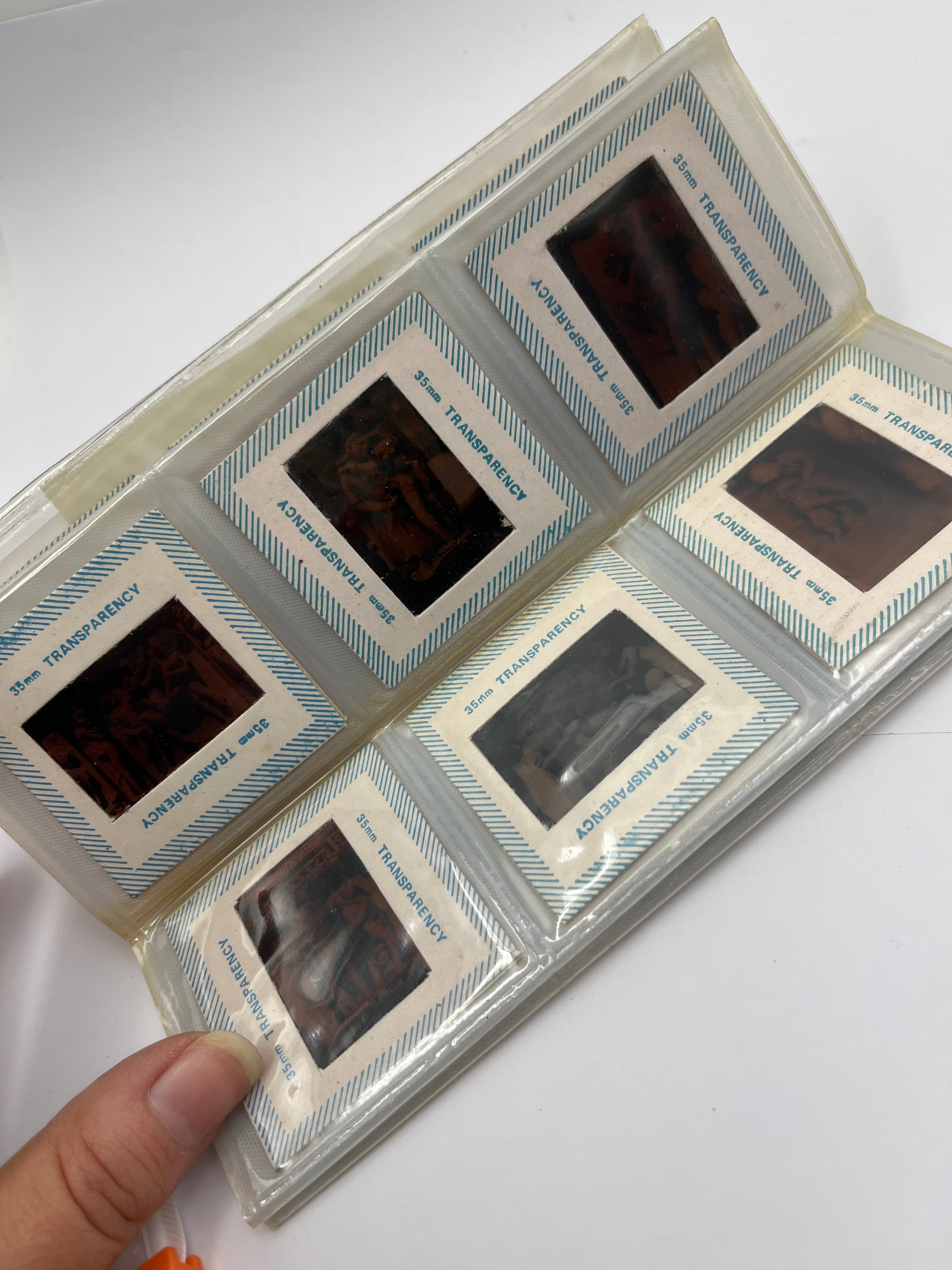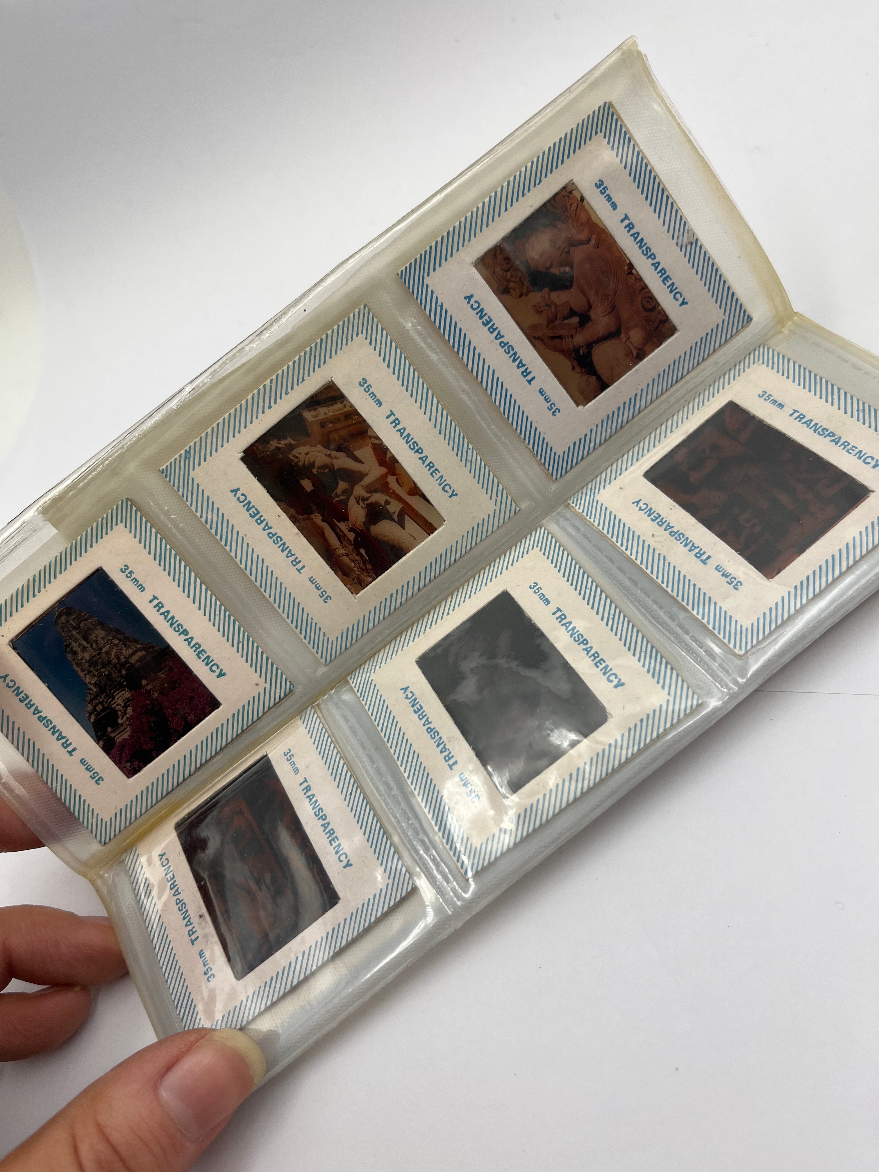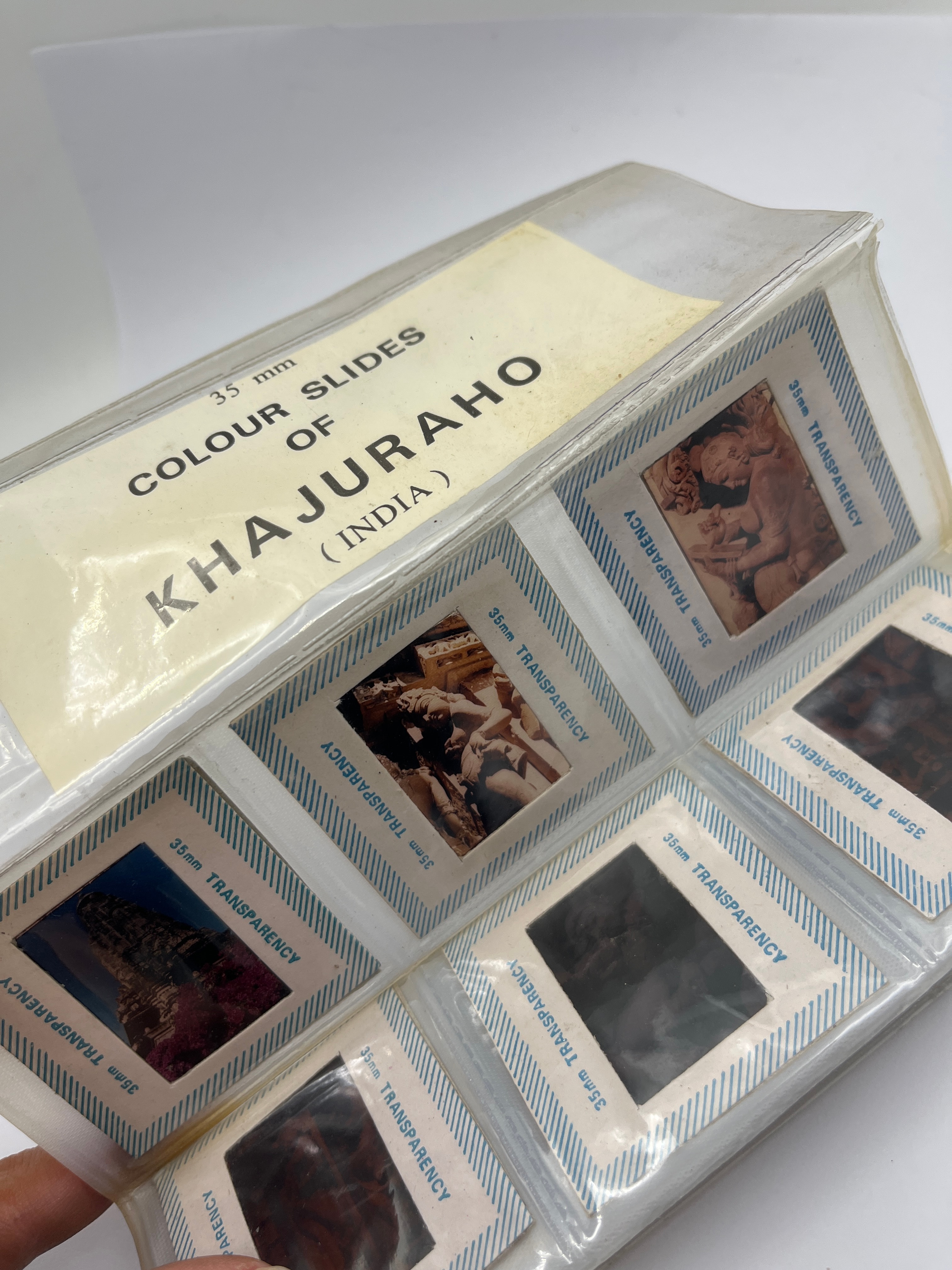 This collection comprises 35 individual 35mm colour photographic transparencies, each mounted in a cardboard frame marked “35mm TRANSPARENCY.” The transparencies are organized within clear plastic sleeves, which are housed in a soft plastic folder or album. A prominent insert within the folder identifies the collection as “35 mm COLOUR SLIDES OF KHAJURAHO (INDIA).” The visible images on the slides depict ancient Indian stone carvings and architectural details, many featuring figural and erotic sculptures consistent with the famous temples of Khajuraho. This collection dates to the mid-to-late 20th century.