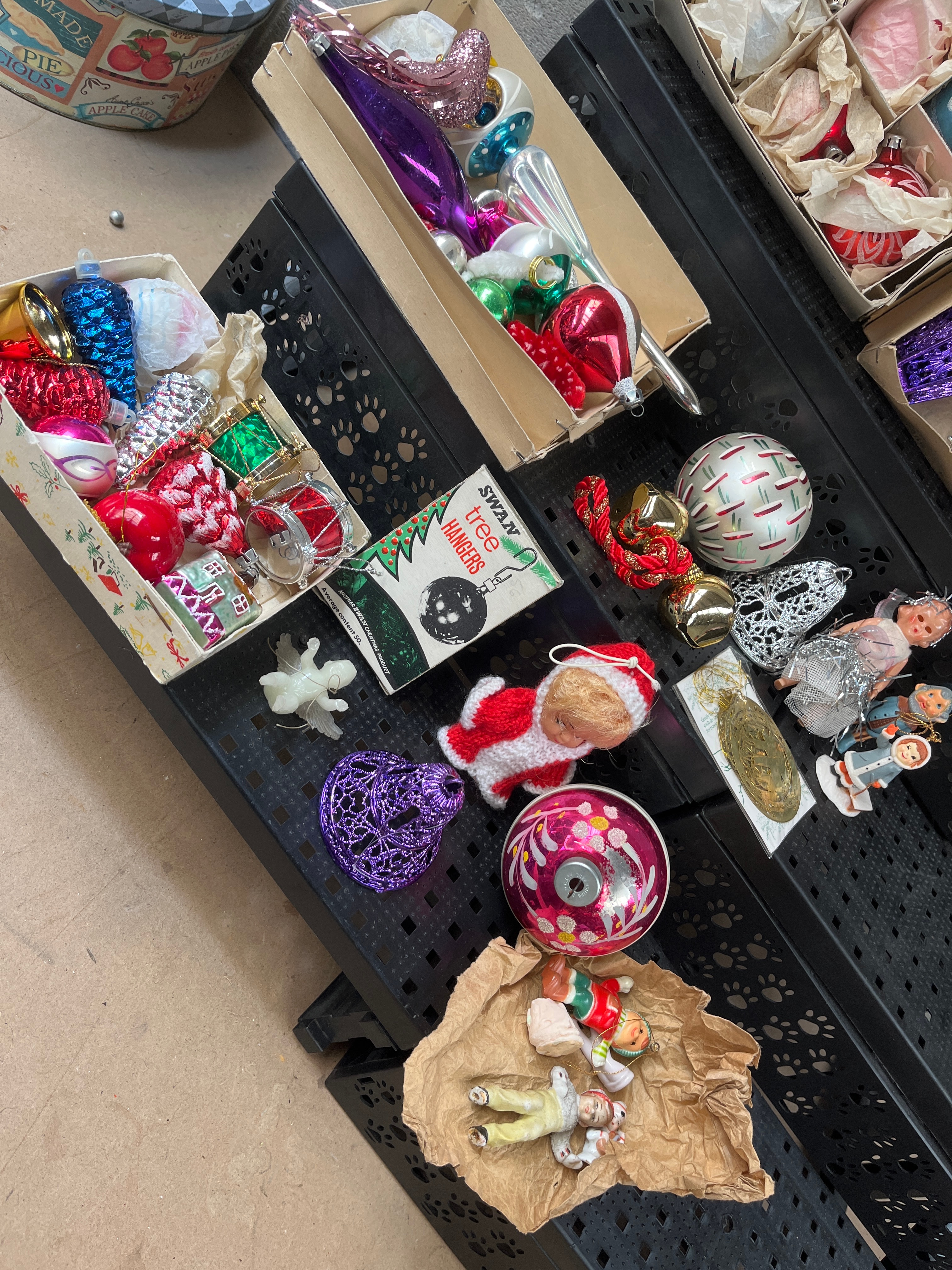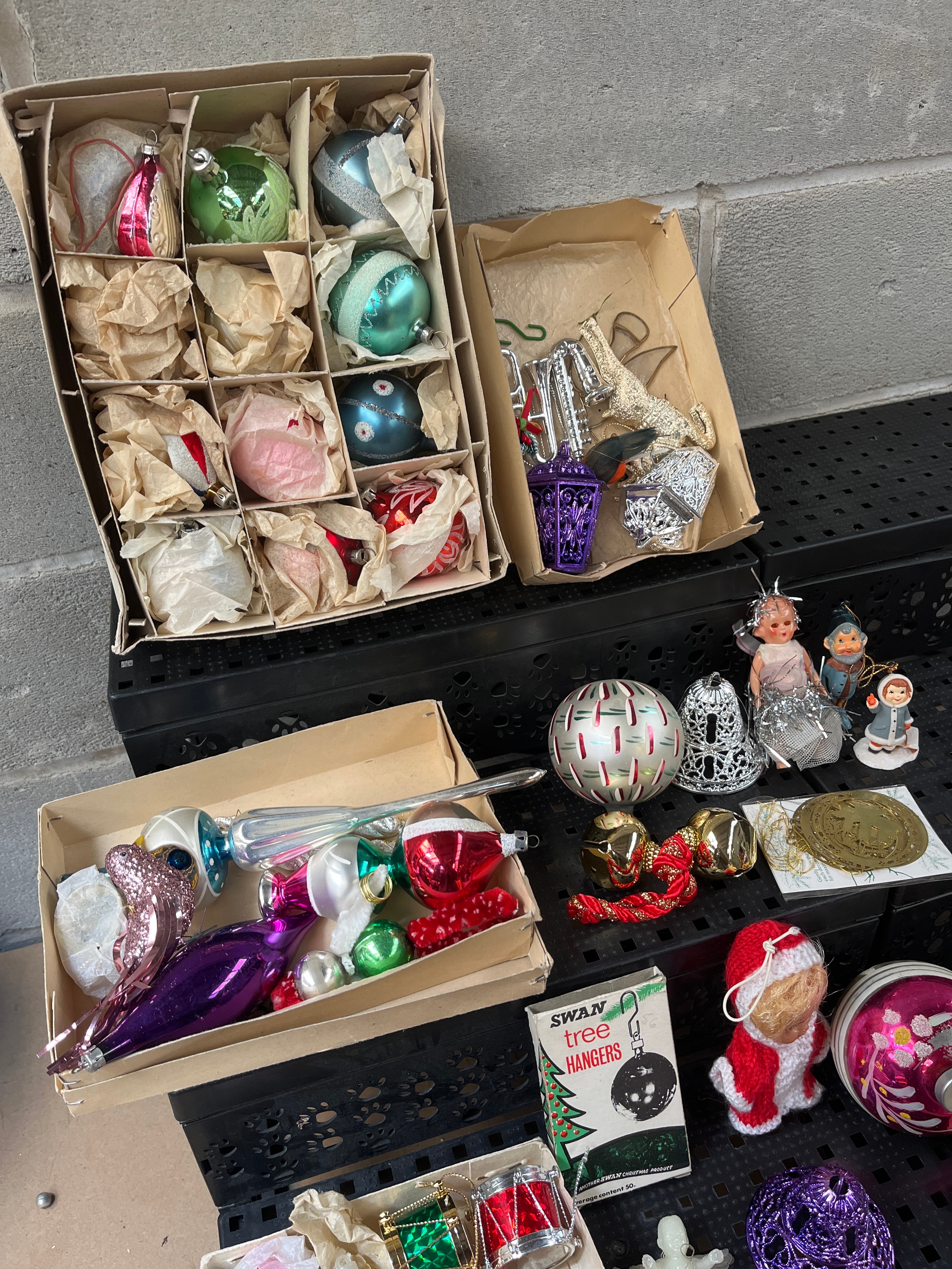 A large collection of vintage Christmas ornaments and decorations, primarily dating from the mid-20th century. The assortment includes numerous blown glass ornaments of various shapes, including spheres, teardrops, bells, and finials, in a wide array of colors such as silver, gold, red, green, blue, pink, purple, and striped patterns. Many of these glass ornaments are presented within original compartmentalized cardboard boxes, often wrapped in tissue paper. Also present are a group of ceramic and plastic figurines, depicting Santa-like figures, angels, children, and a baby doll dressed in a Santa suit. The collection further comprises metallic bells, tinsel garlands, and other mixed festive items. A small box is visible with text reading “SWAN tree hangers.” Materials observed across the collection include glass, ceramic, plastic, fabric, paper, and various metals.