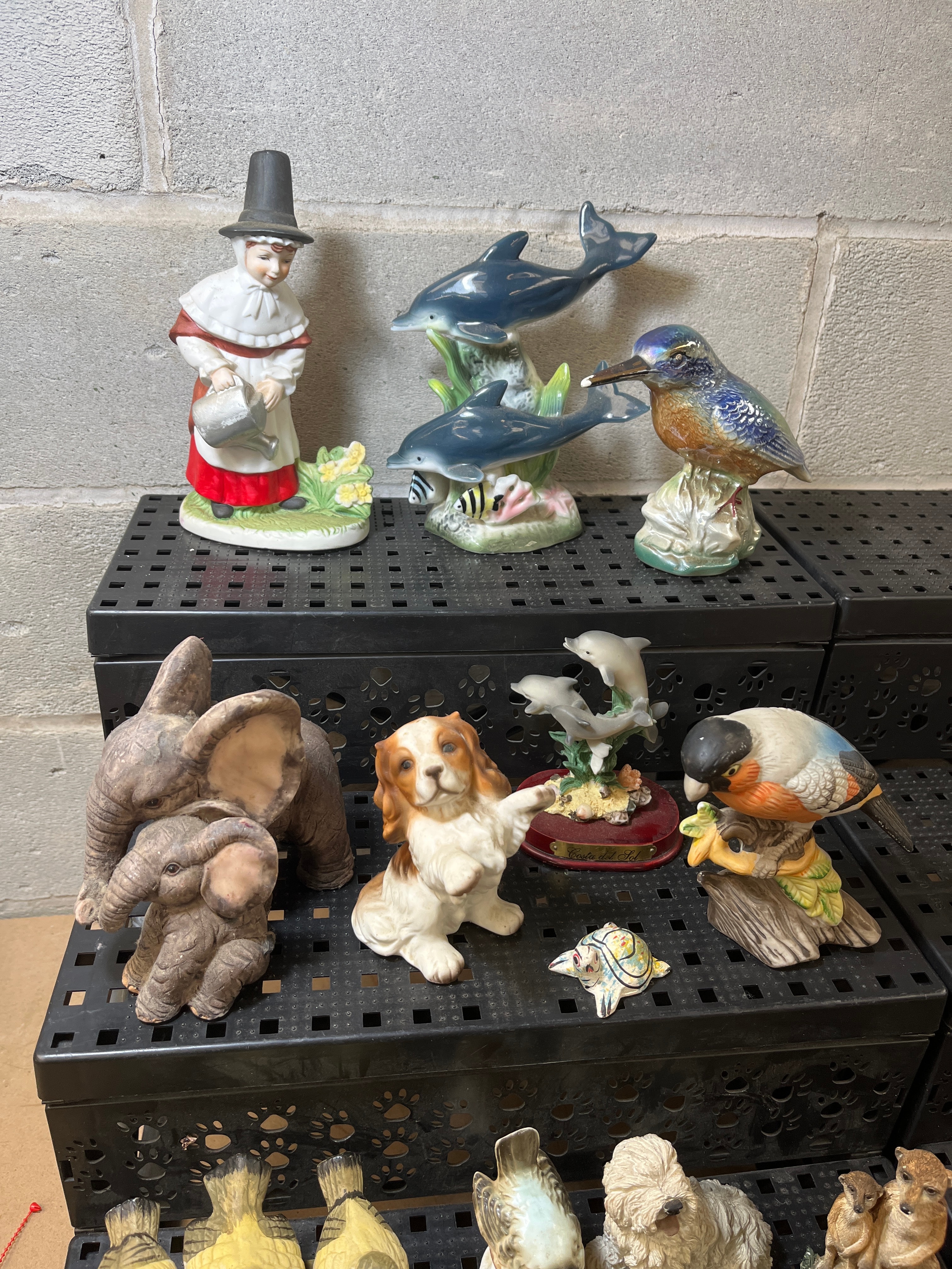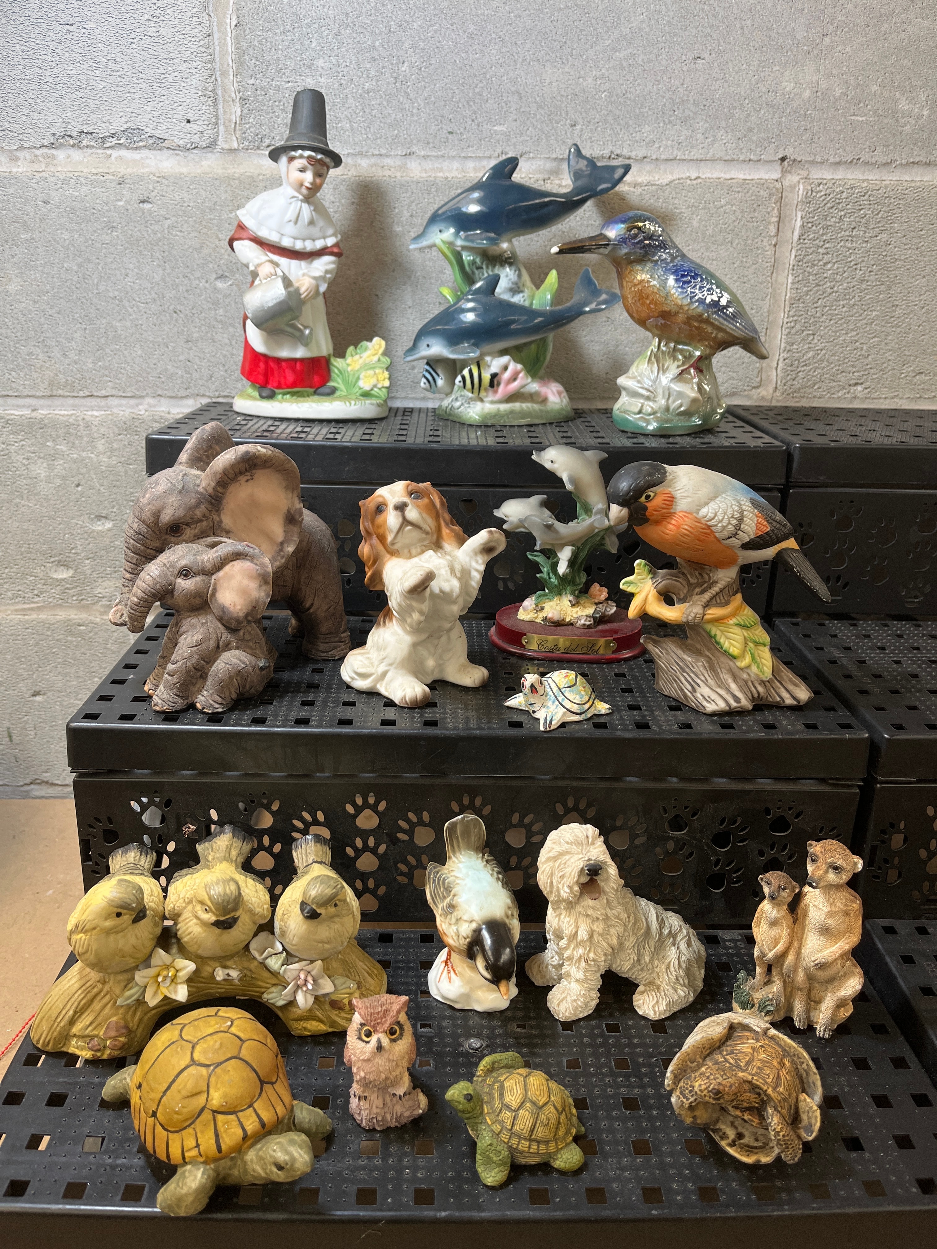A collection of approximately twenty-one assorted decorative ceramic and porcelain figurines, predominantly depicting various animal subjects. The figures include multiple birds (such as a kingfisher, a robin, and smaller songbirds), several turtles or tortoises, a pair of elephants (adult and calf), two distinct dog breeds (one resembling a Cavalier King Charles Spaniel), multiple dolphins, an owl, and a grouping of meerkat-like creatures. Also present is a single human figurine portraying a woman in traditional costume, characterized by a tall black hat. No discernible text or maker’s marks are visible.