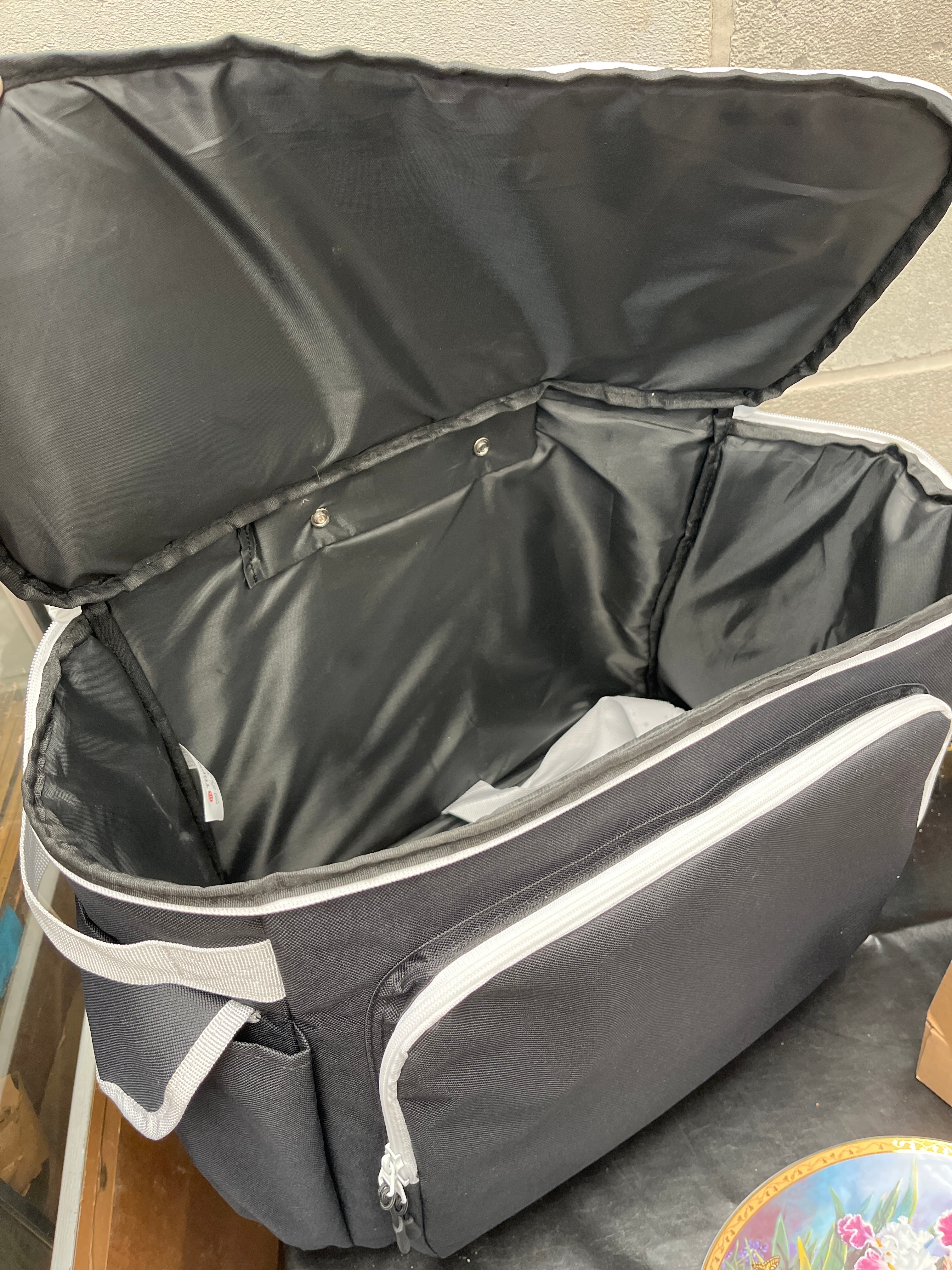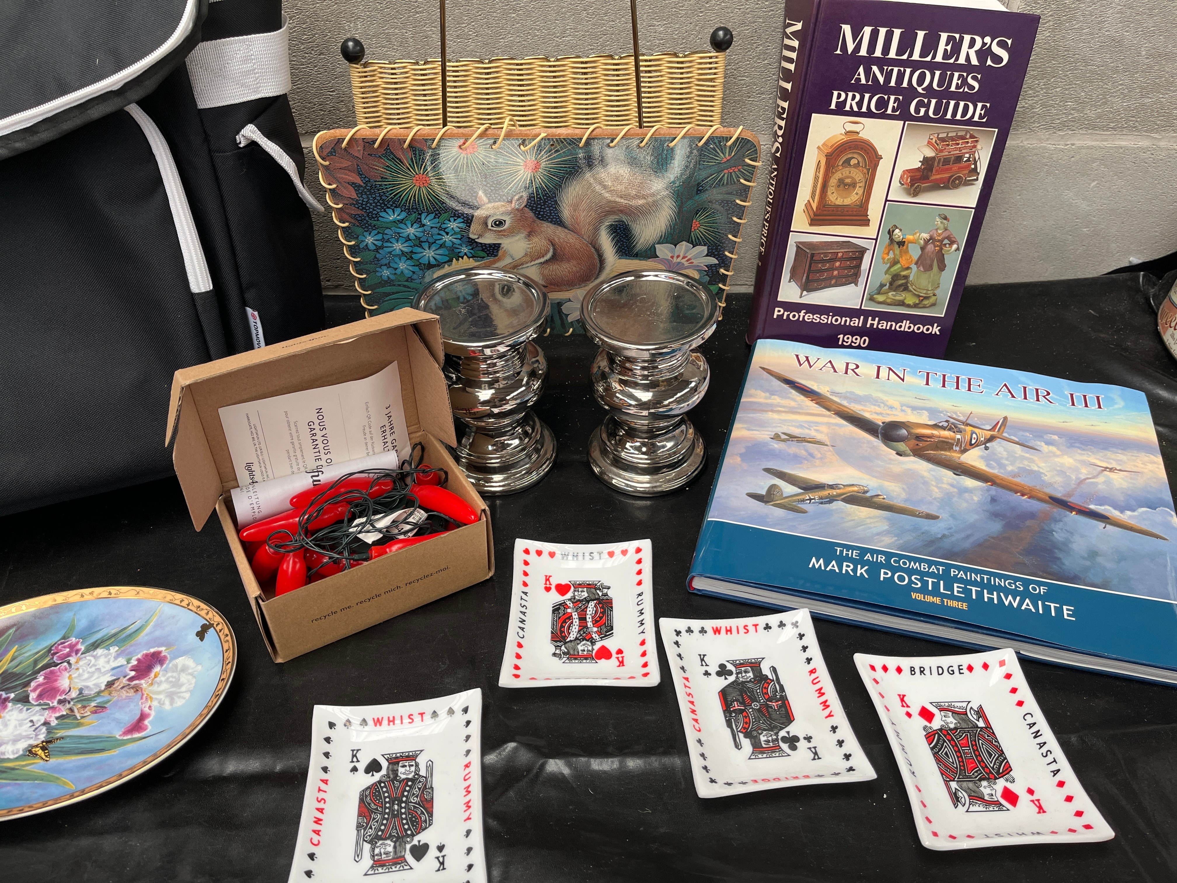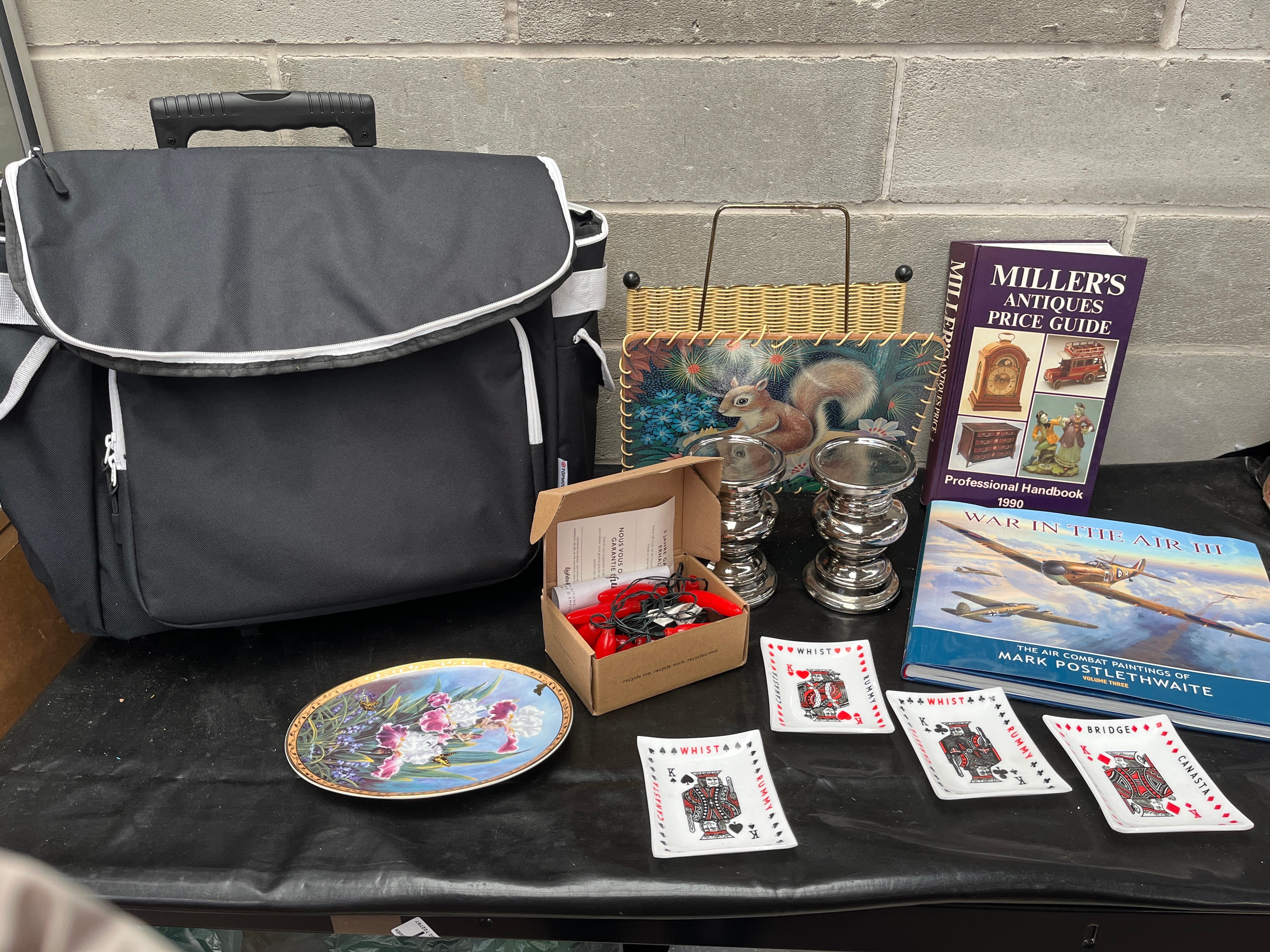 This diverse collection comprises a large, black, soft-sided trolley bag with white trim, featuring multiple zippered compartments, a top handle, and integrated wheels. Accompanying this is a decorative woven plaque with a central image of a squirrel amidst stylized foliage. A pair of silver-toned metal candle holders with a stacked ring design are also included. The lot features two hardcover books: “Miller’s Antiques Price Guide Professional Handbook 1990” and “War in the Air III: The Air Combat Paintings of Mark Postlethwaite Volume Three.” A set of red and black mini jumper cables is presented in an open cardboard box branded “Whisper,” with French text on the interior flap. Completing the collection are an oval porcelain or ceramic plate with a floral design in purple, white, and green with gold accents, and a set of four small rectangular white ceramic plates, each depicting a playing card king and marked “WHIST,” “RUMMY,” “BRIDGE,” and “CANADA.”