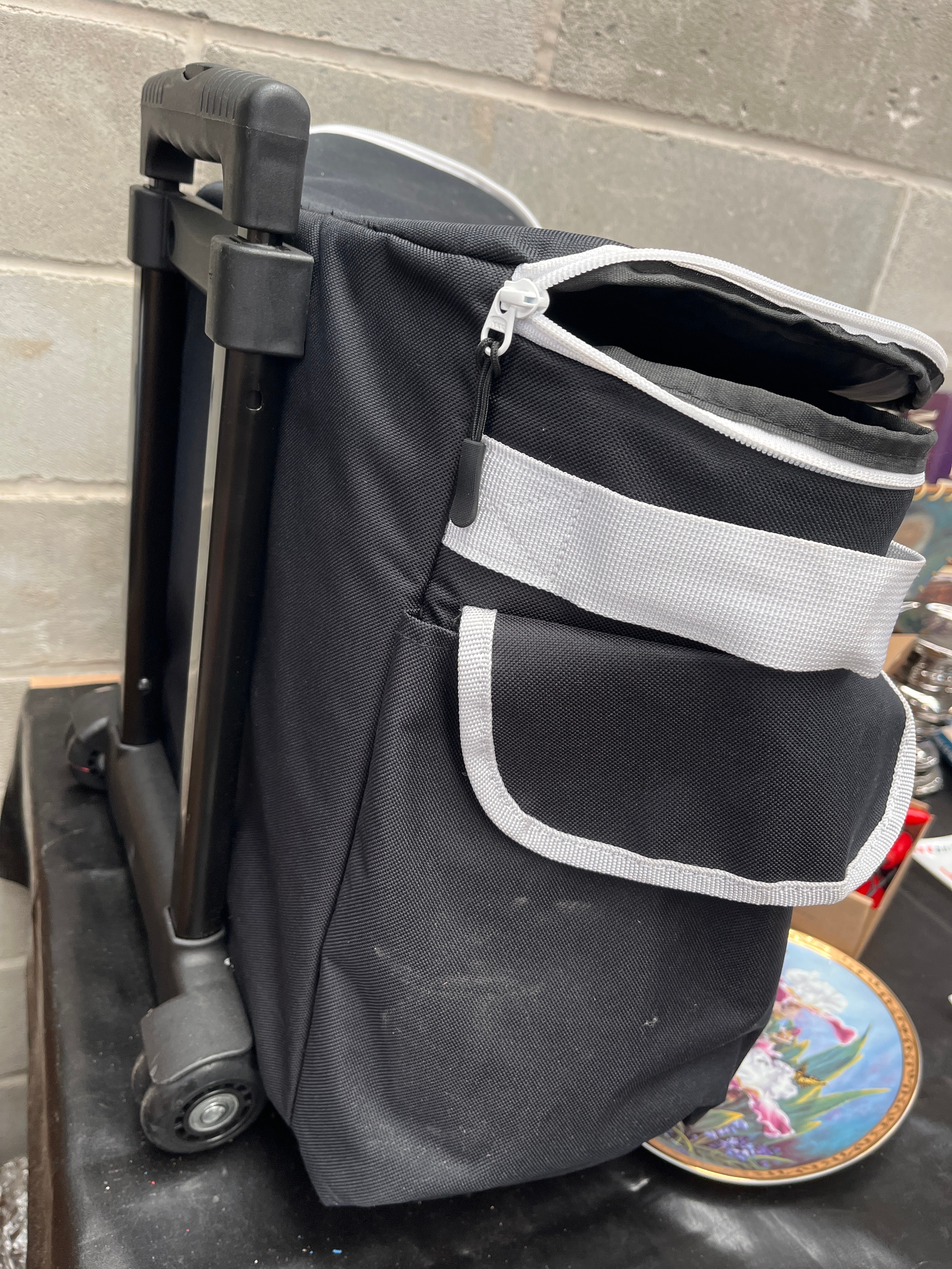 Lot 631: A Collection of Household and Decorative Items, Including a Wheeled Trolley Bag, Books, and Ceramic Plates
