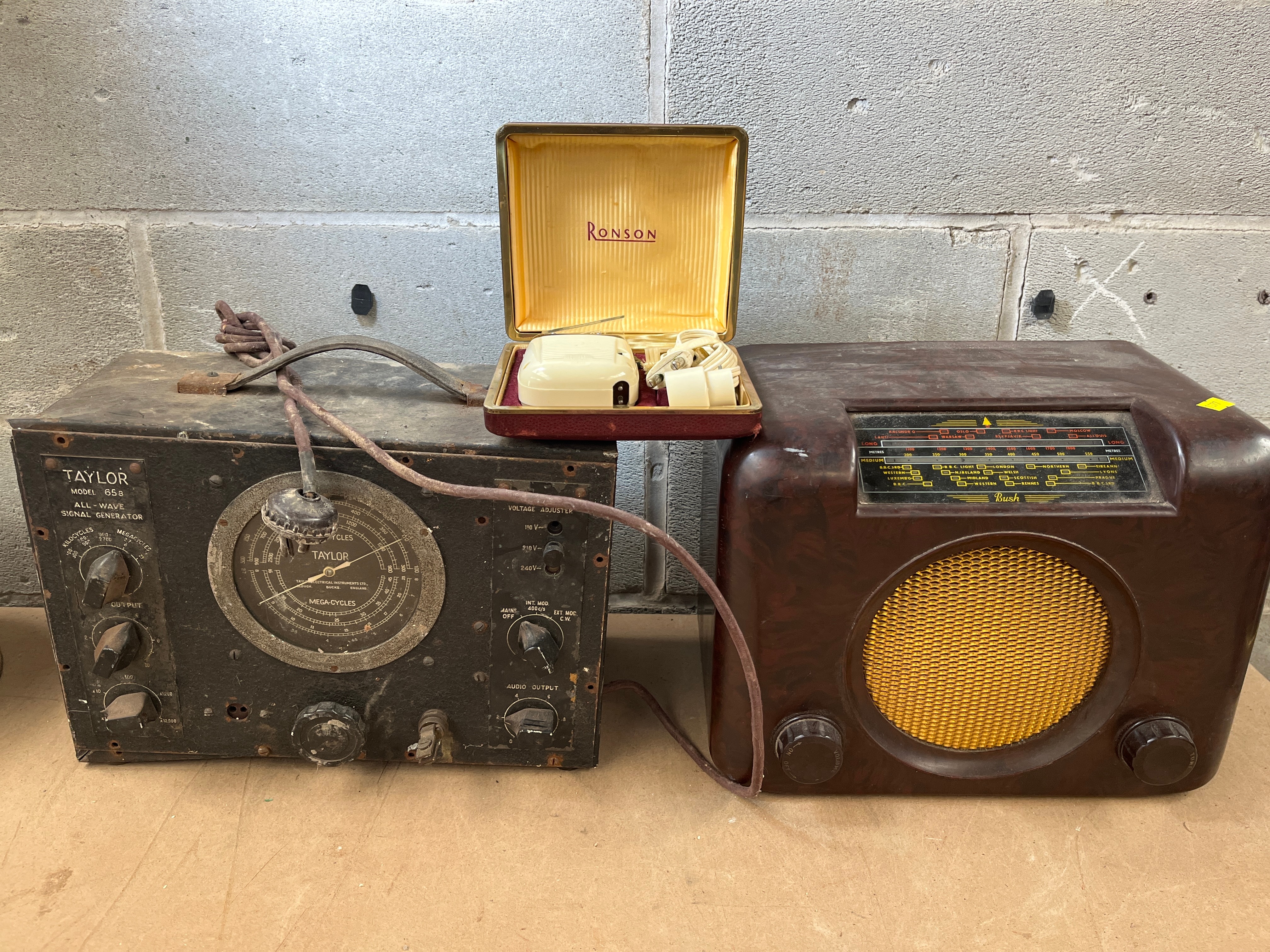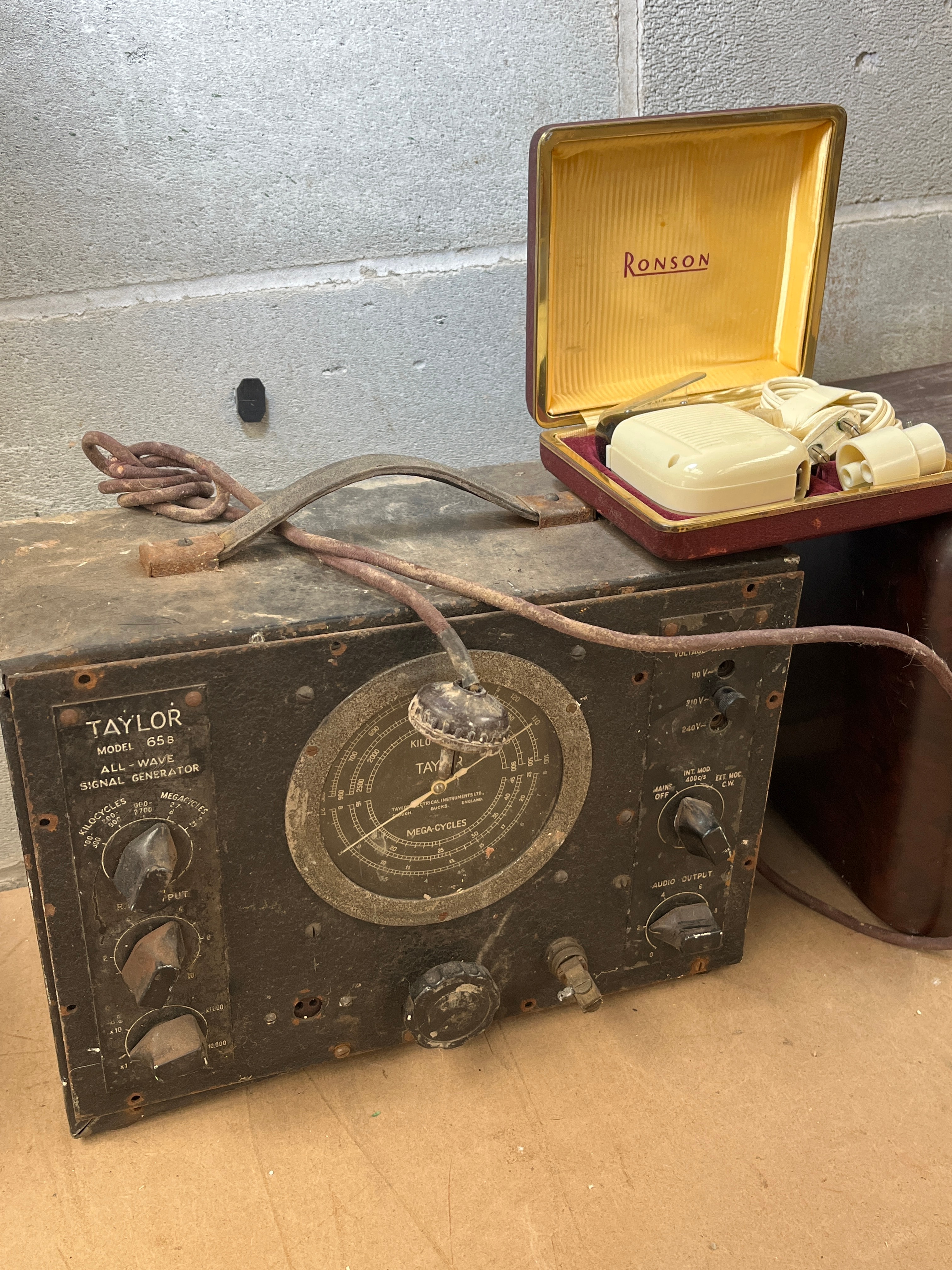 Also included is a TAYLOR MODEL 100 ALL-WAVE SIGNAL GENERATOR, housed in a dark, rectangular metal case, with a large central dial marked “MEGA-CYCLES” and “KILO-CYCLES,” and multiple control knobs for “OUTPUT,” “ATTENUATION,” “AUDIO OUTPUT,” and “MAINS VOLTAGE ADJUSTER” for 200-250V settings.
