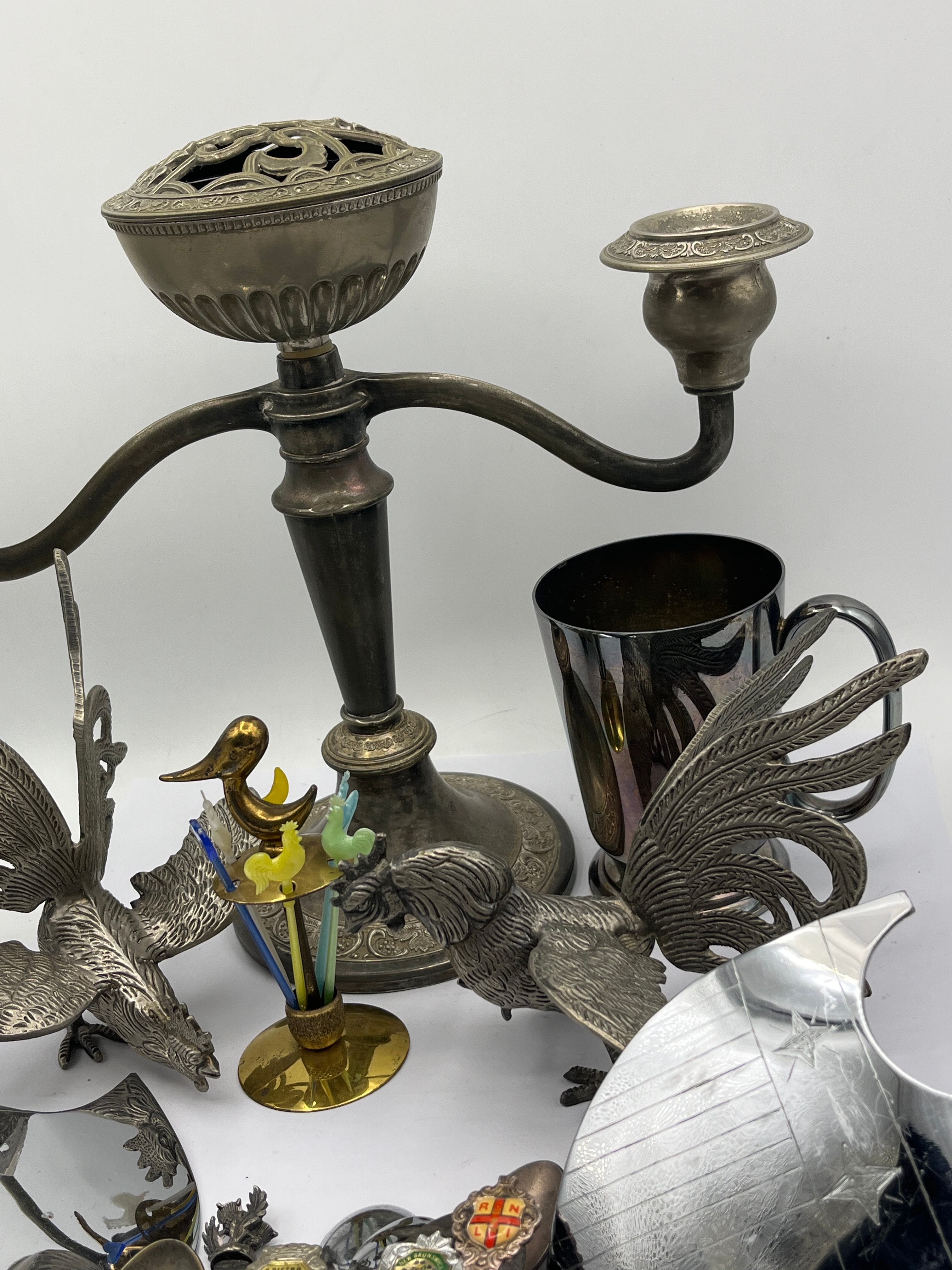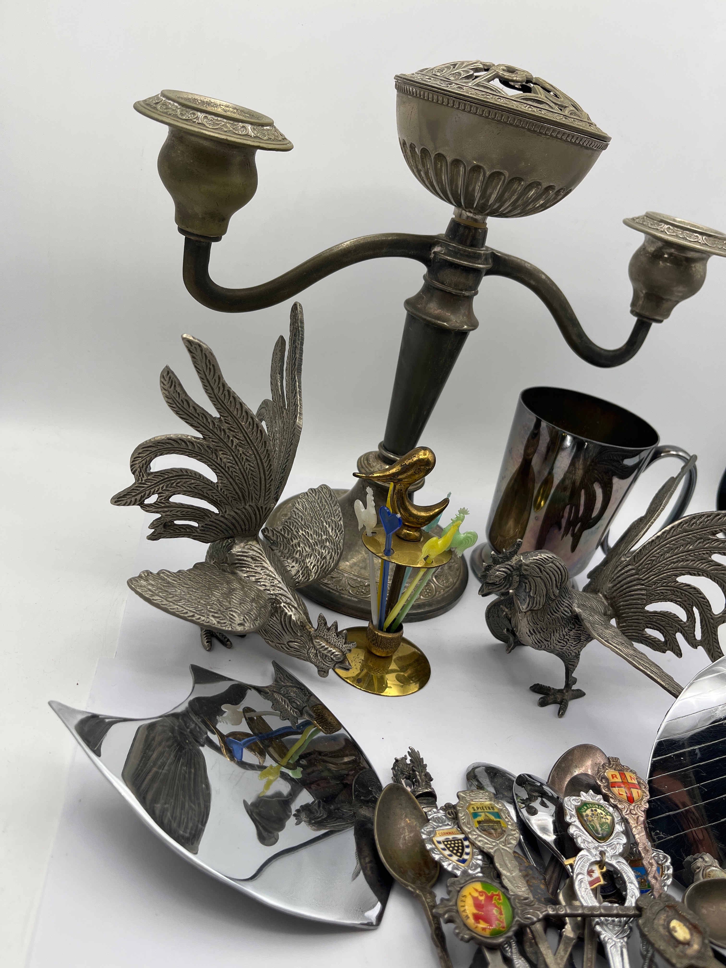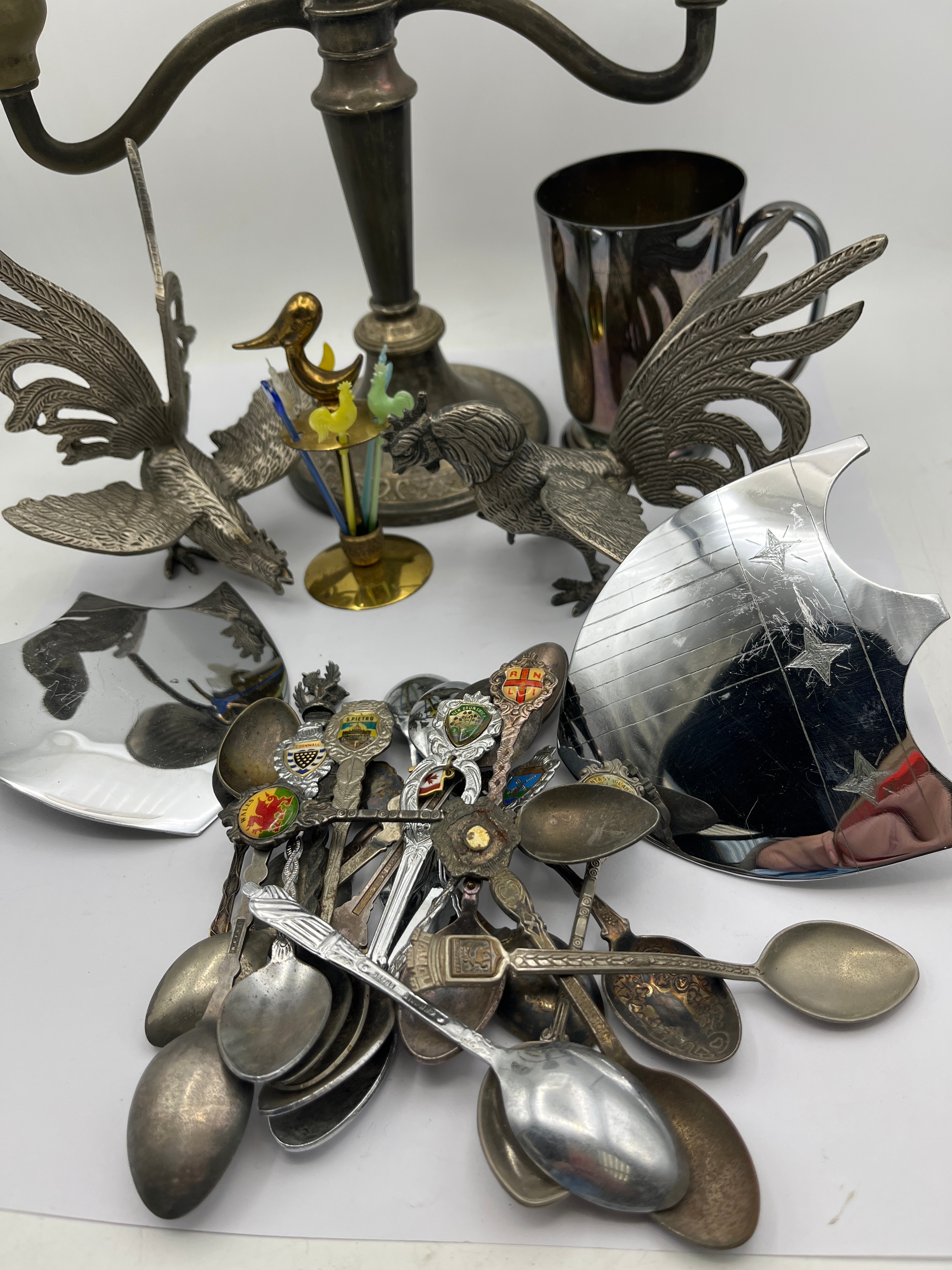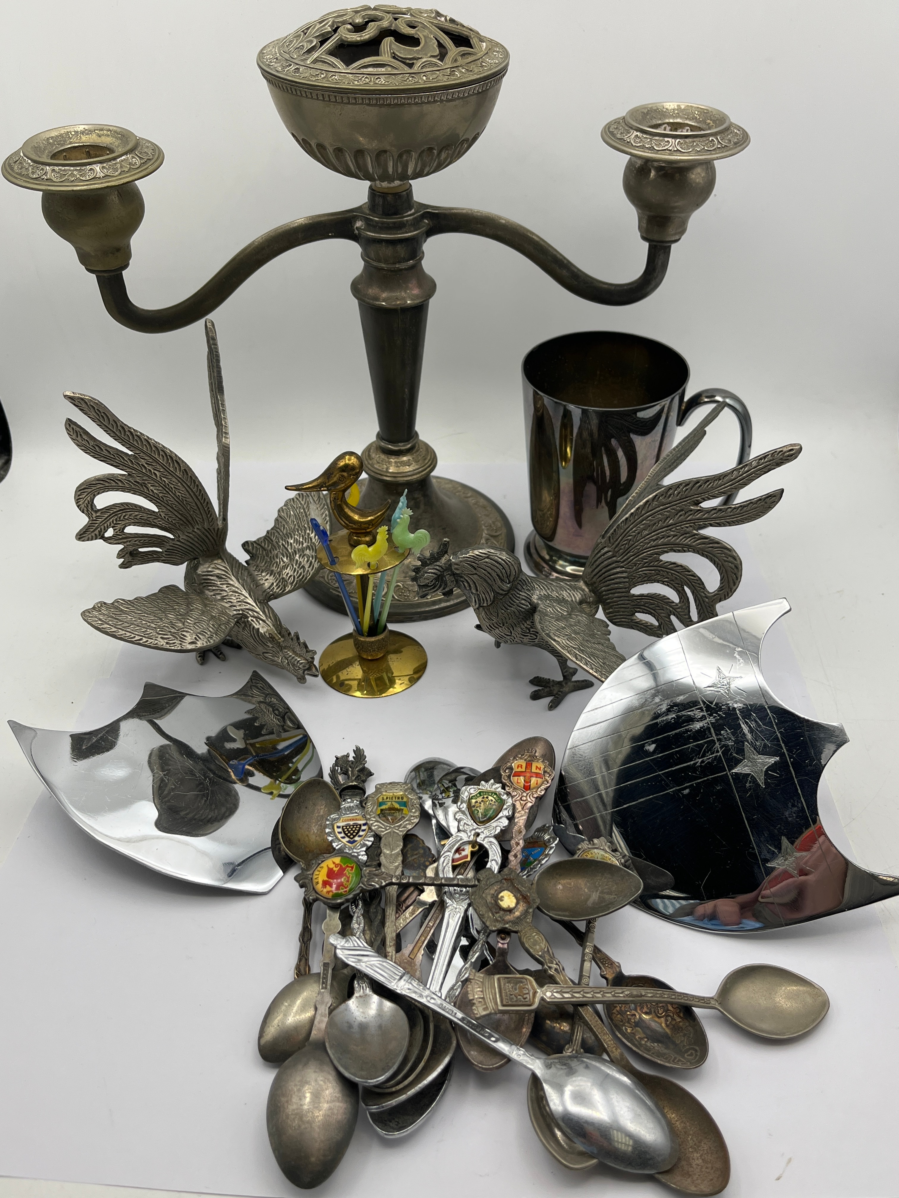 A silverplate three-arm candelabra, also functioning as an incense burner, featuring a pierced central bowl. The candelabra is crafted from a darkened base metal, consistent with tarnished silverplate, and features three arms terminating in candleholders. Accompanying this are two matching silver-toned rooster figurines, a reflective single-handled metal mug, and two irregular, shield-shaped reflective metal dishes, one with faint etched detailing. Also included is a collection of souvenir spoons, many adorned with enamelled crests or coats of arms, displaying diverse heraldic and regional motifs. A small glass bird ornament on a brass-toned base completes the collection. Materials across the collection include silver-colored metals (likely silver-plate, pewter, or stainless steel), glass, and enamel elements.