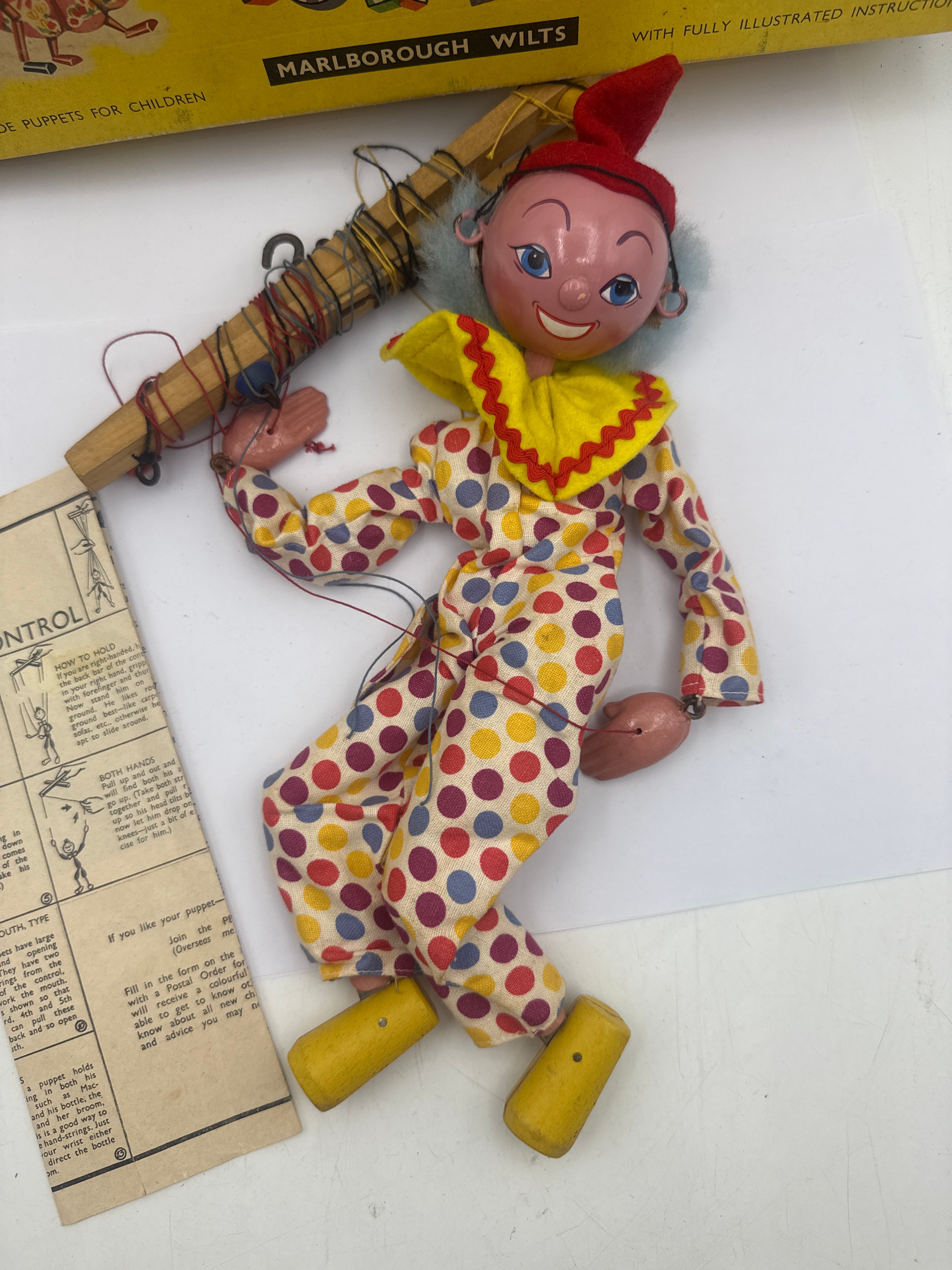 A Vintage Pelham Puppets ‘BUMPY JO’ Marionette, comprising a painted wooden head with a pink skin tone, blue eyes, and a red conical hat. The fabric body is adorned in a colorful polka-dot jumpsuit with a yellow ruffled collar, and features wooden hands and feet, all connected by strings to a wooden control bar. The puppet is accompanied by its original yellow cardboard box, decorated with illustrated figures and bearing the text ‘Pelham Puppets,’ ‘MARLBOROUGH WILTS,’ ‘HAND MADE PUPPETS FOR CHILDREN,’ and ‘FULLY ILLUSTRATED INSTRUCTIONS.’ An aged paper instruction sheet, with diagrams and text including ‘HOW TO HOLD,’ is also present.