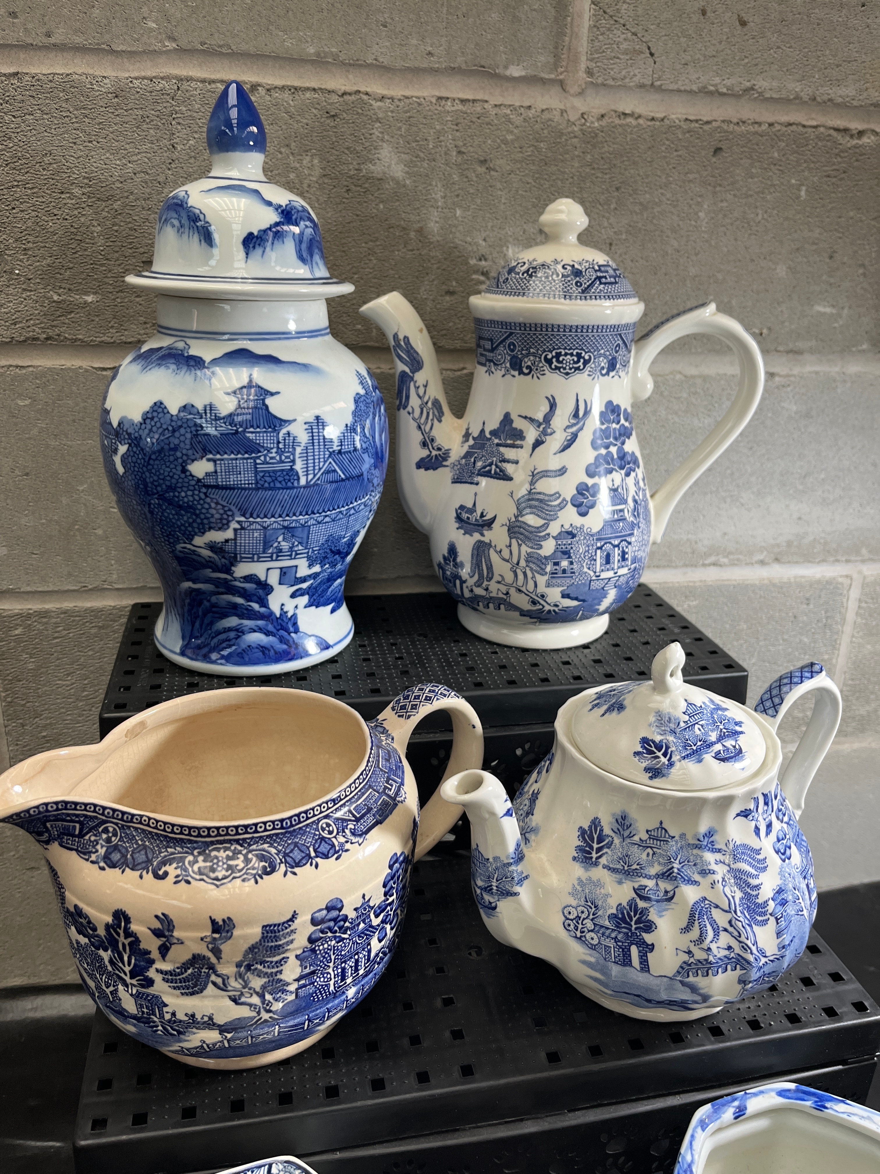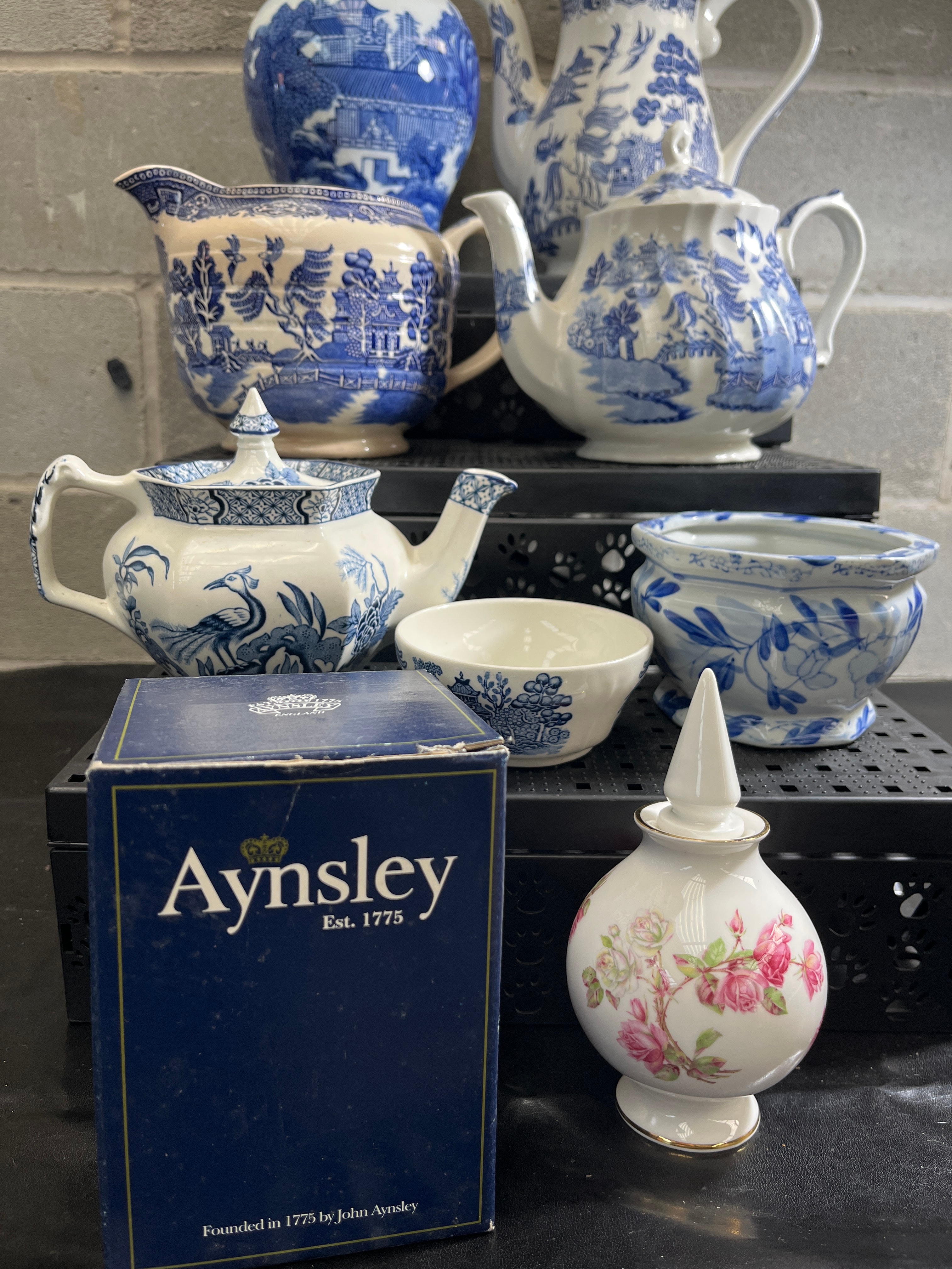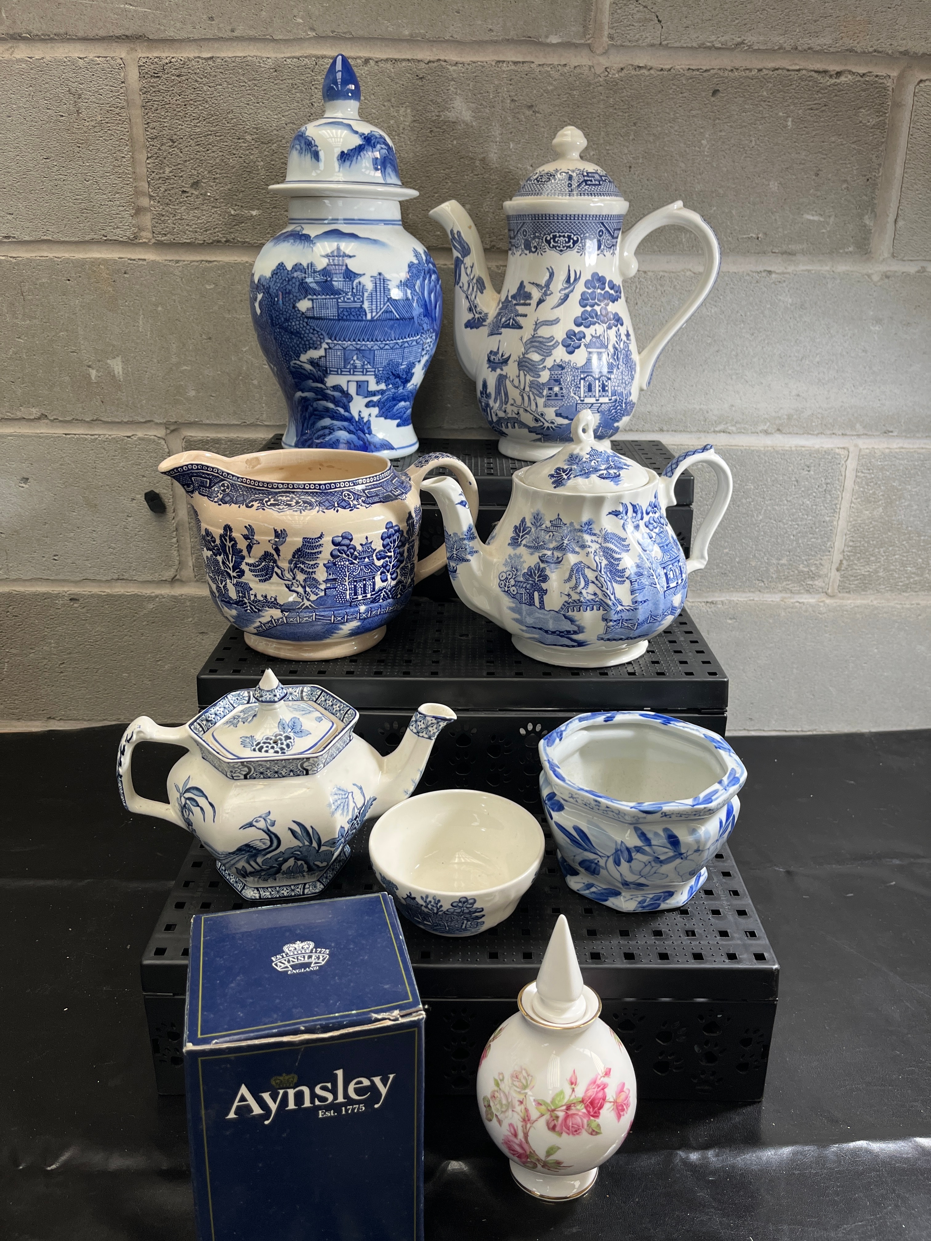 A collection of mid-20th century Japan Blue Willow ceramic and porcelain wares, comprising nine items. The group includes three lidded teapots of varying sizes, a tall lidded ginger jar or vase, a creamer or milk jug, and two small bowls, one with a fluted rim. All items are predominantly decorated in blue and white Chinoiserie or traditional “Willow pattern” styles. One additional small white bottle or decanter with a stopper, decorated with pink floral motifs and gold accents, is also present. A blue cardboard box, marked “Aynsley Est. 1775” and “Founded in 1775 by John Aynsley,” is also present.