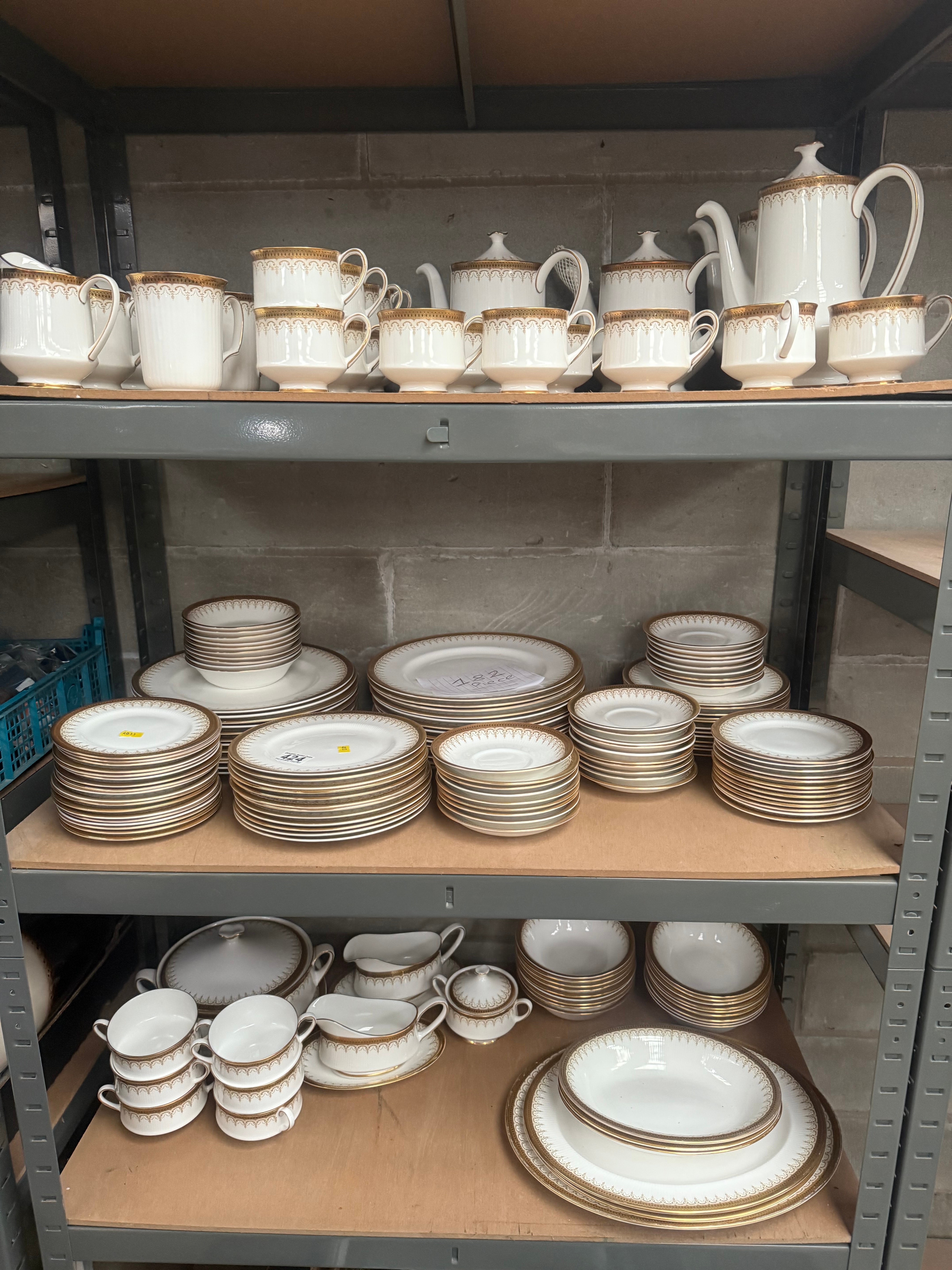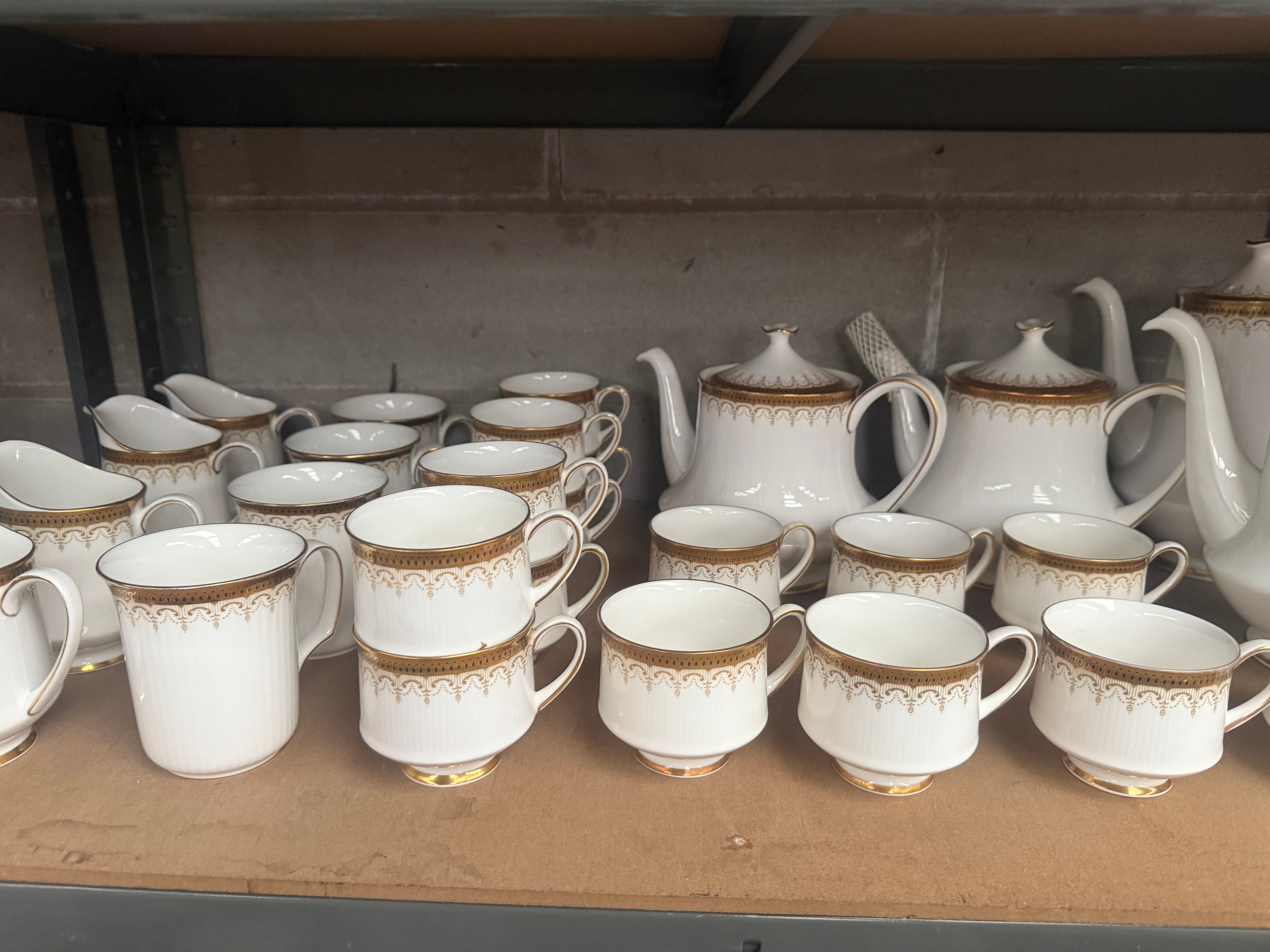 A 184-piece Paragon ‘Athena’ dinner and tea/coffee service. Crafted from fine bone china, the set features a traditional, elegant style with a wide gold band adorned with intricate scroll and dot patterns, often paired with subtle fluted details on the white body. The backstamp reads ‘BY APPOINTMENT TO H.M. THE QUEEN CHINA POTTERS,’ ‘PARAGON CHINA LTD., STOKE-ON-TRENT, FINE BONE CHINA, MADE IN ENGLAND, REC’D L/L,’ and ‘Athena.’ The collection includes various plates (dinner, salad, bread, oval serving), bowls (soup, fruit), saucers, teacups, teapots, coffee pots, creamers, sugar bowls, gravy boats, and a lidded tureen.
