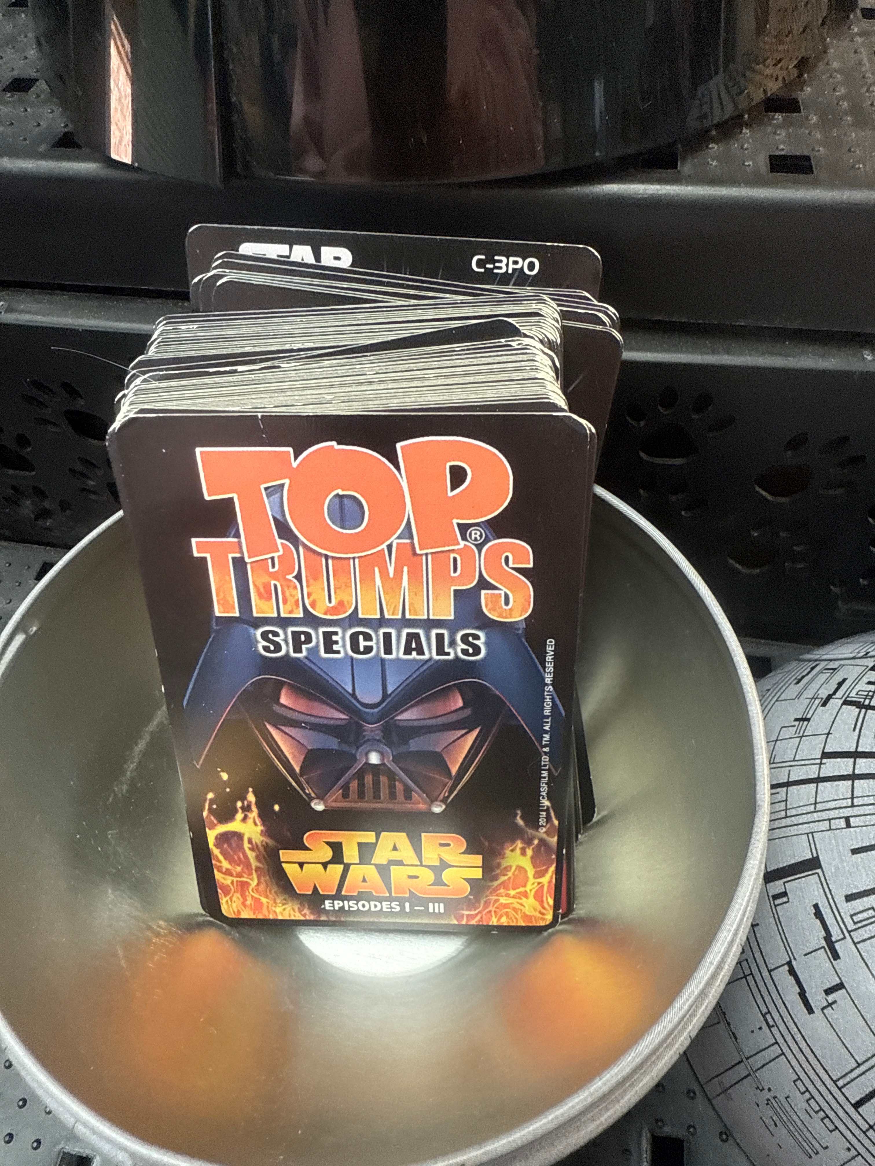 A collection of Star Wars-themed memorabilia. The primary item identified is a Star Wars Darth Vader Voice Changer Helmet, likely plastic. The assortment further includes a large hardcover reference book titled “STAR WARS ULTIMATE EVERYTHING YOU NEED TO KNOW,” and a framed photographic print depicting C-3PO and R2-D2. Also present are two large LEGO-style plastic figures of Darth Vader and a Stormtrooper, possibly functioning as clocks, a spherical Death Star model, and a black ceramic or plastic mug adorned with Darth Vader. Smaller collectibles comprise a carded Pepsi promotional action figure from “STAR WARS EPISODE I” depicting young Anakin Skywalker, a stack of “TOP TRUMPS SPECIALS STAR WARS EPISODES I – III” playing cards (bearing a copyright © 2011 LUCASFILM LTD. & TM.), and two clear acrylic display cases containing a miniature Boba Fett helmet and an X-wing fighter model.