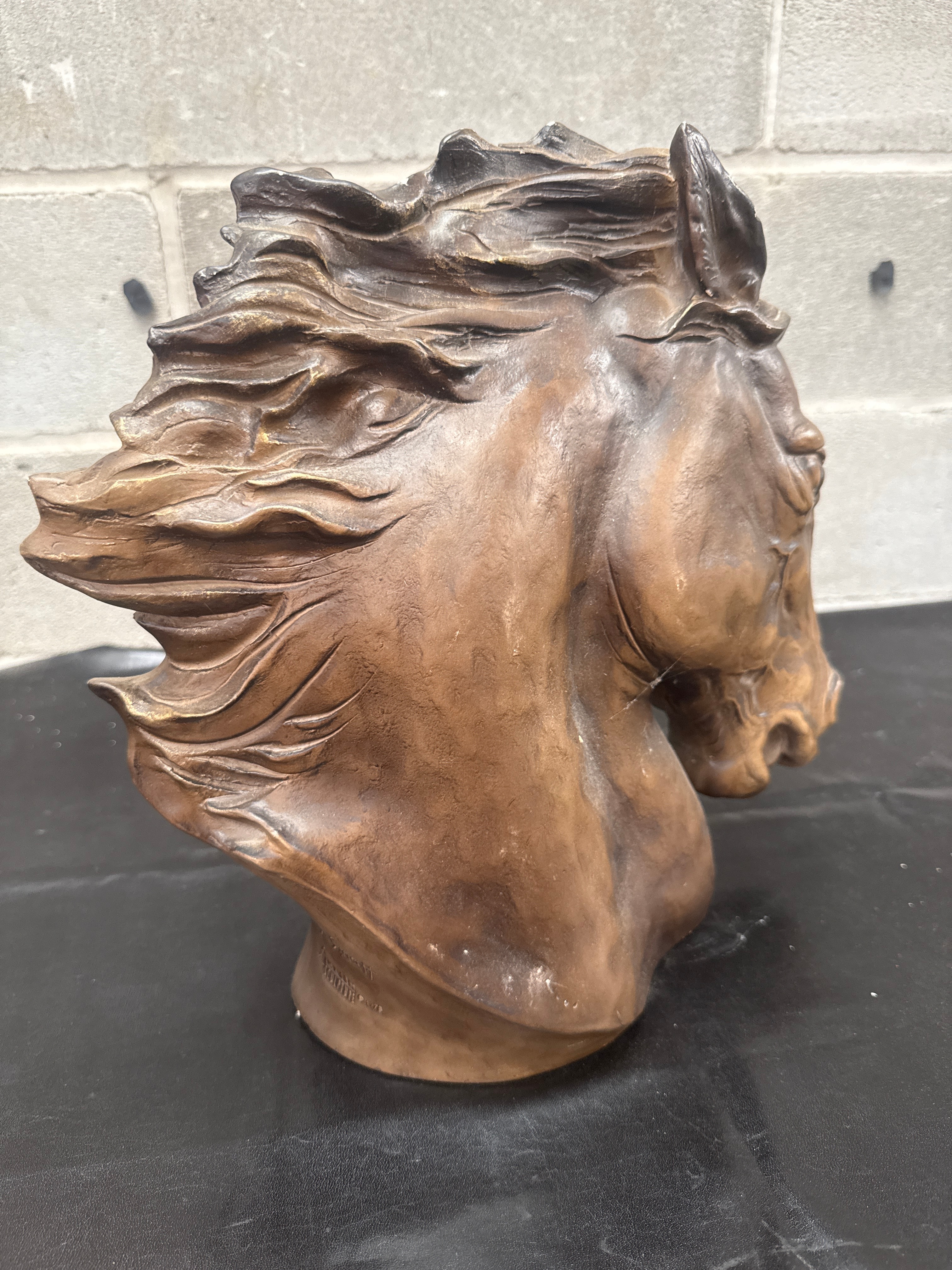 A ‘Flaming Mane’ horse head sculpture by James Spratt for Austin Productions, dated 1978. Constructed from chalk with a dark, reddish-brown patinated finish. The bust depicts a horse’s head and neck in a dynamic and realistic style with a flowing mane. An impressed inscription, partially decipherable as “FRANK…” followed by unclear characters, is visible on the proper left side of the base. A white rectangular sticker bearing the number “370” is affixed to the front lower section.