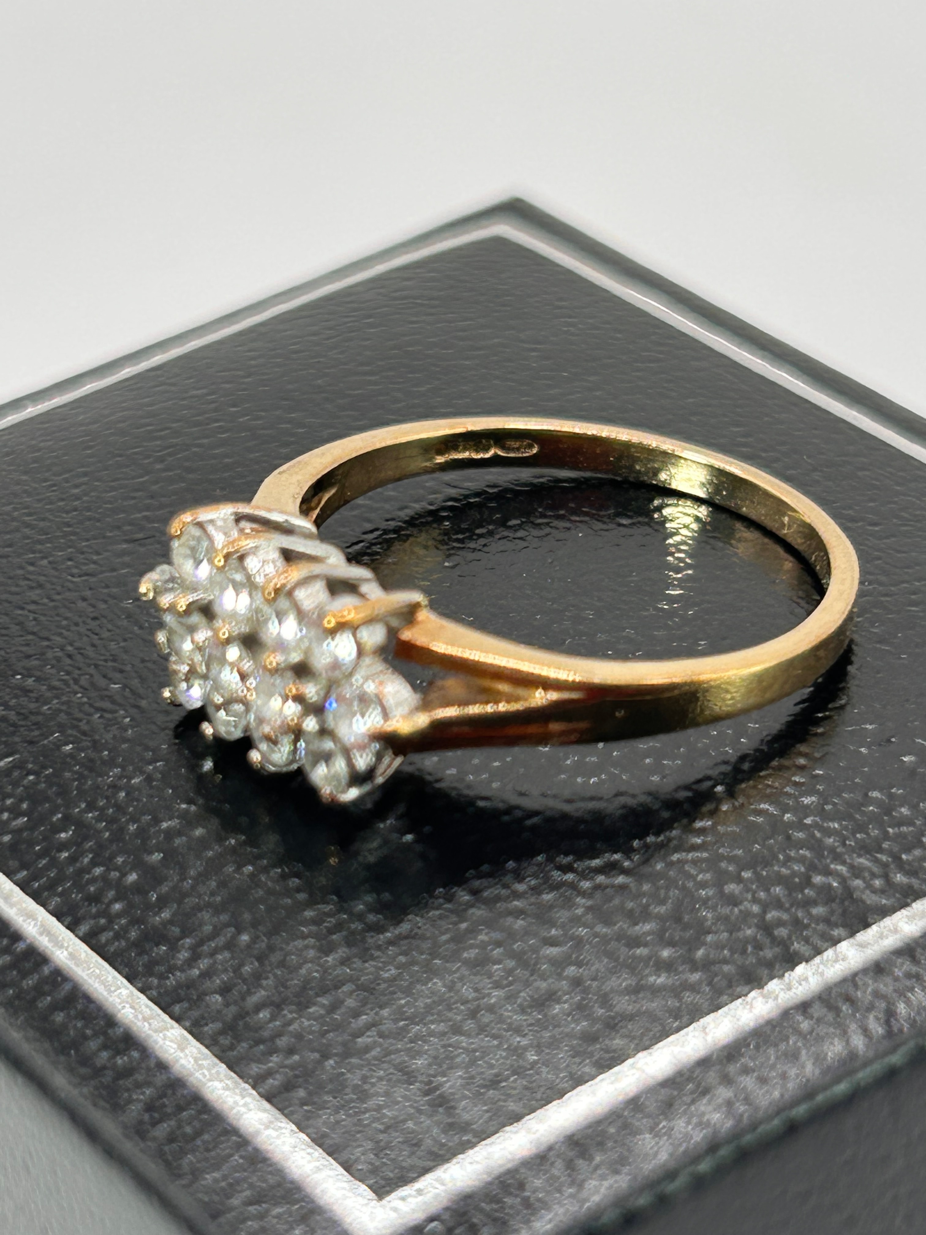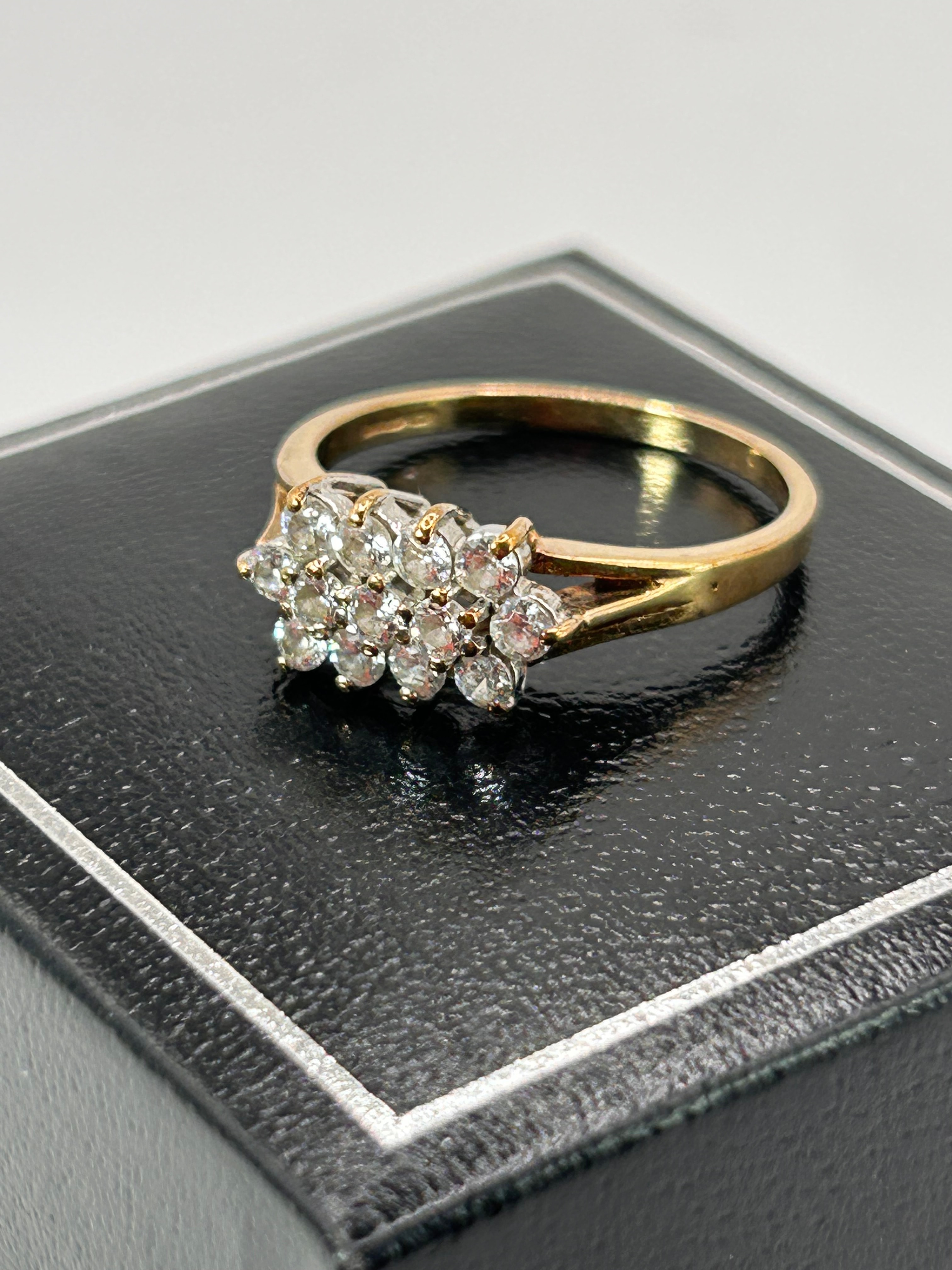A 9ct yellow gold cluster ring featuring a multi-stone design. The head of the ring is set with numerous round, colorless faceted cubic zirconia stones, arranged in two prominent groups within a white metal setting that integrates with the yellow gold split-shoulder band. A small, unidentifiable rectangular hallmark is visible on the interior surface of the band.