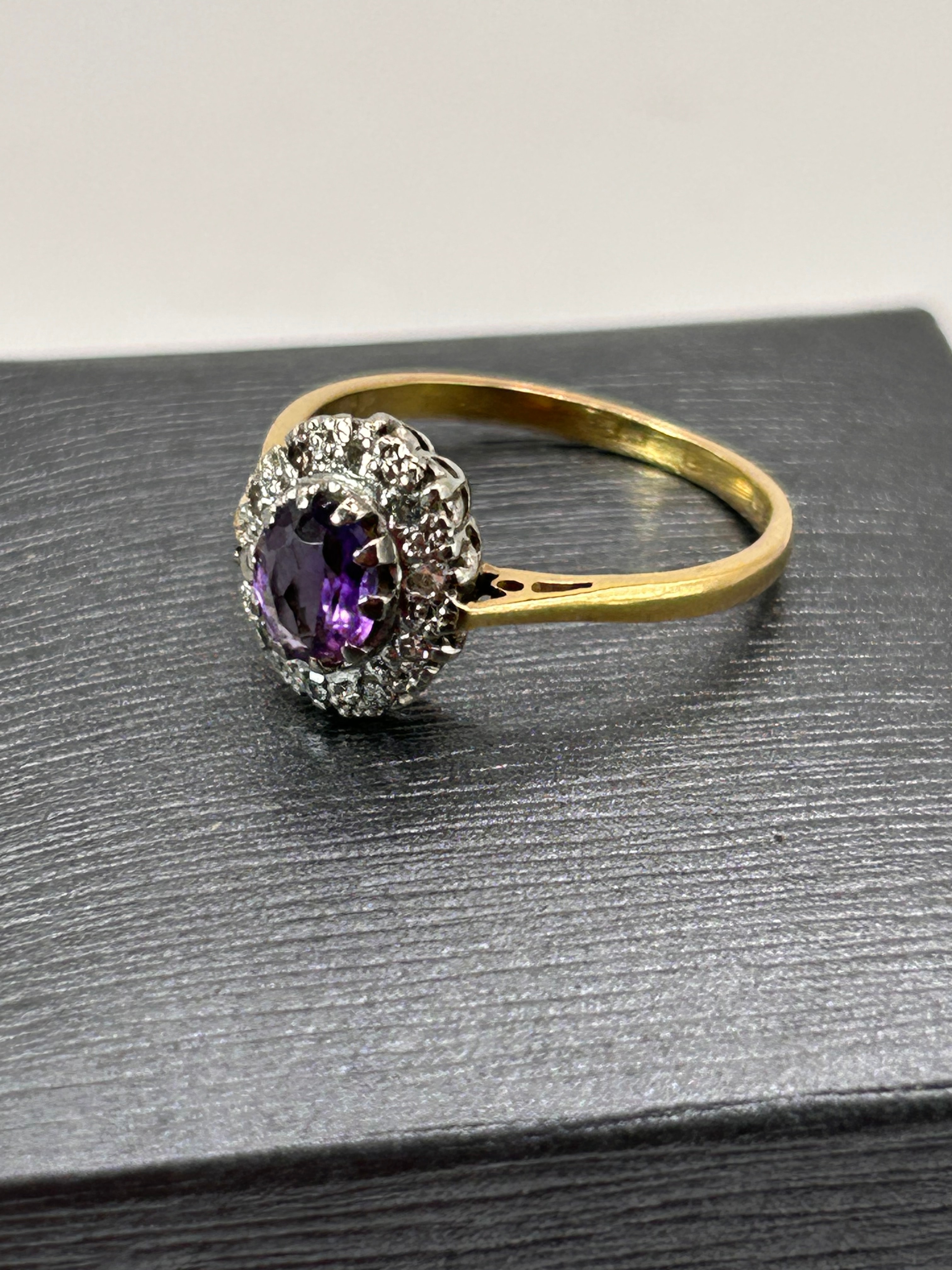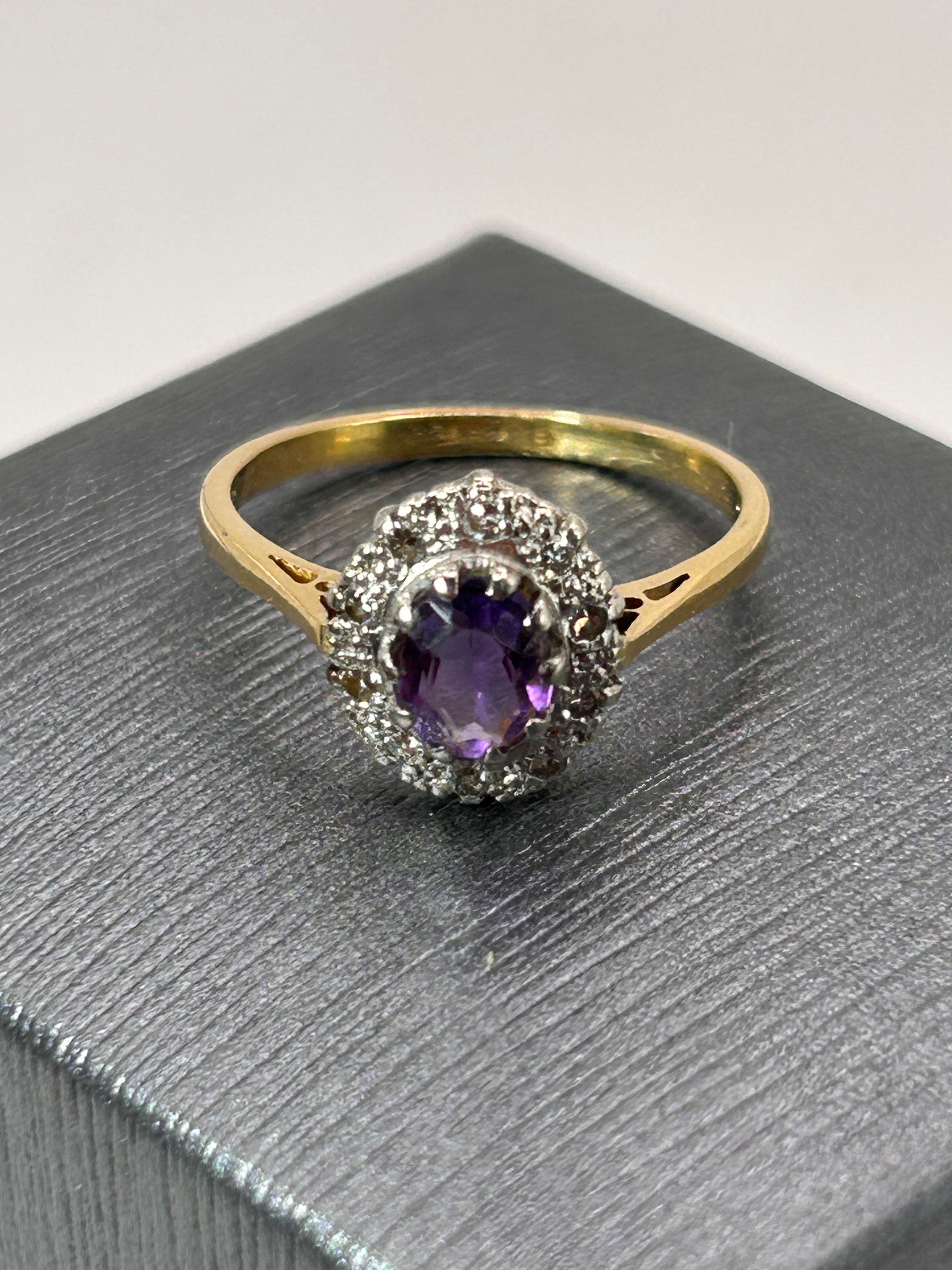 A 9ct yellow gold amethyst and diamond cluster ring. This vintage-style ring features a central oval-cut amethyst, encircled by a halo of small, round, clear faceted diamonds set in white metal. The band is crafted from yellow gold, with decorative openwork detailing on the shoulders. No visible hallmarks or inscriptions are apparent.