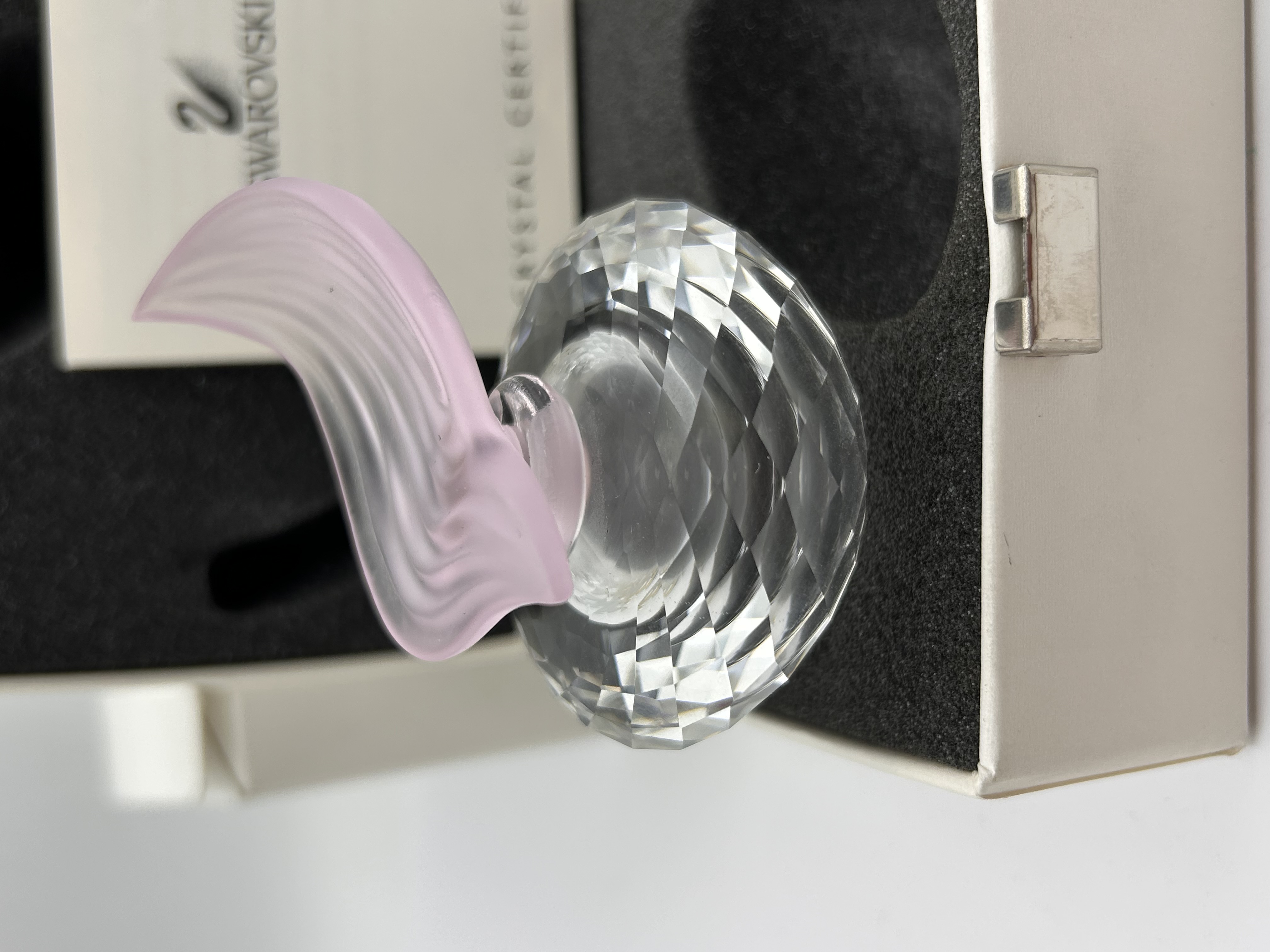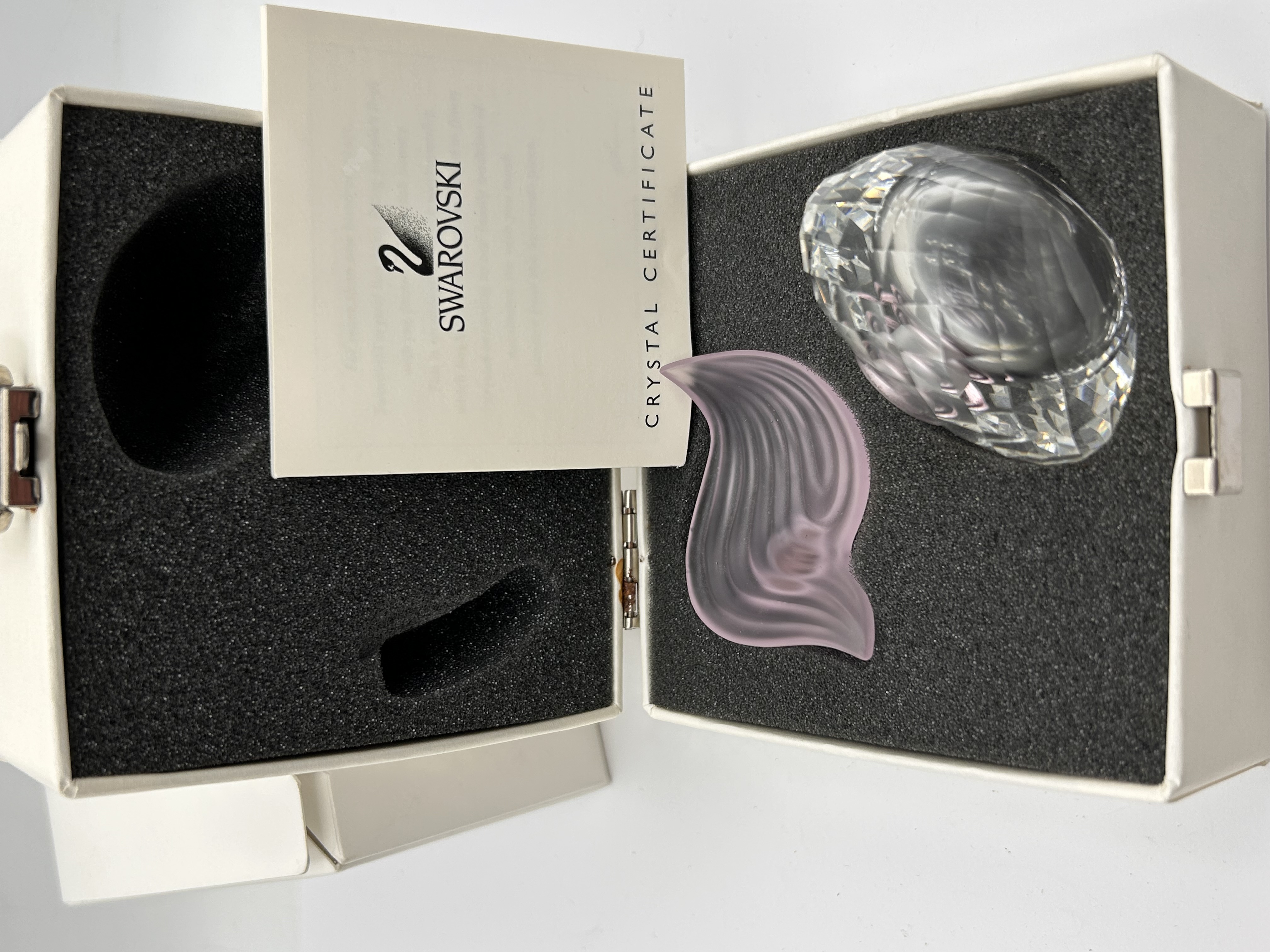 A Swarovski Silver Crystal Rose Flacon Perfume Bottle, identified by market consensus as model number 236693 or 7482. The piece is constructed of two primary components designed to form a unified sculptural shape. The base component, which serves as the perfume bottle, is crafted from clear, heavily faceted crystal, forming an oval or rounded body. The stopper component is made of frosted pink crystal or glass, shaped into an upward-sweeping, stylized element. The lot includes the original white hinged presentation box with fitted black foam inserts, a small metallic pin component, and the official Swarovski Crystal Certificate displaying the swan logo. The certificate confirms the item’s authenticity.