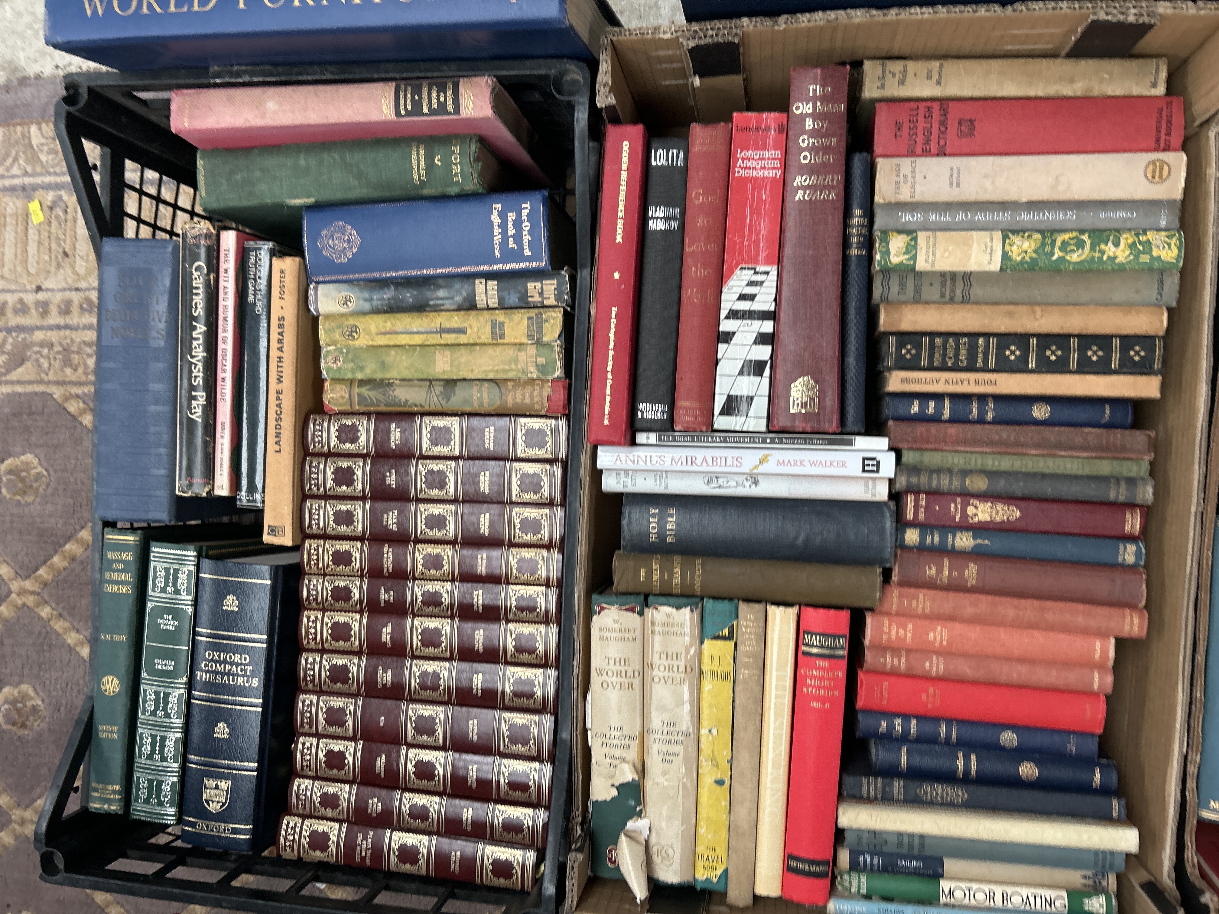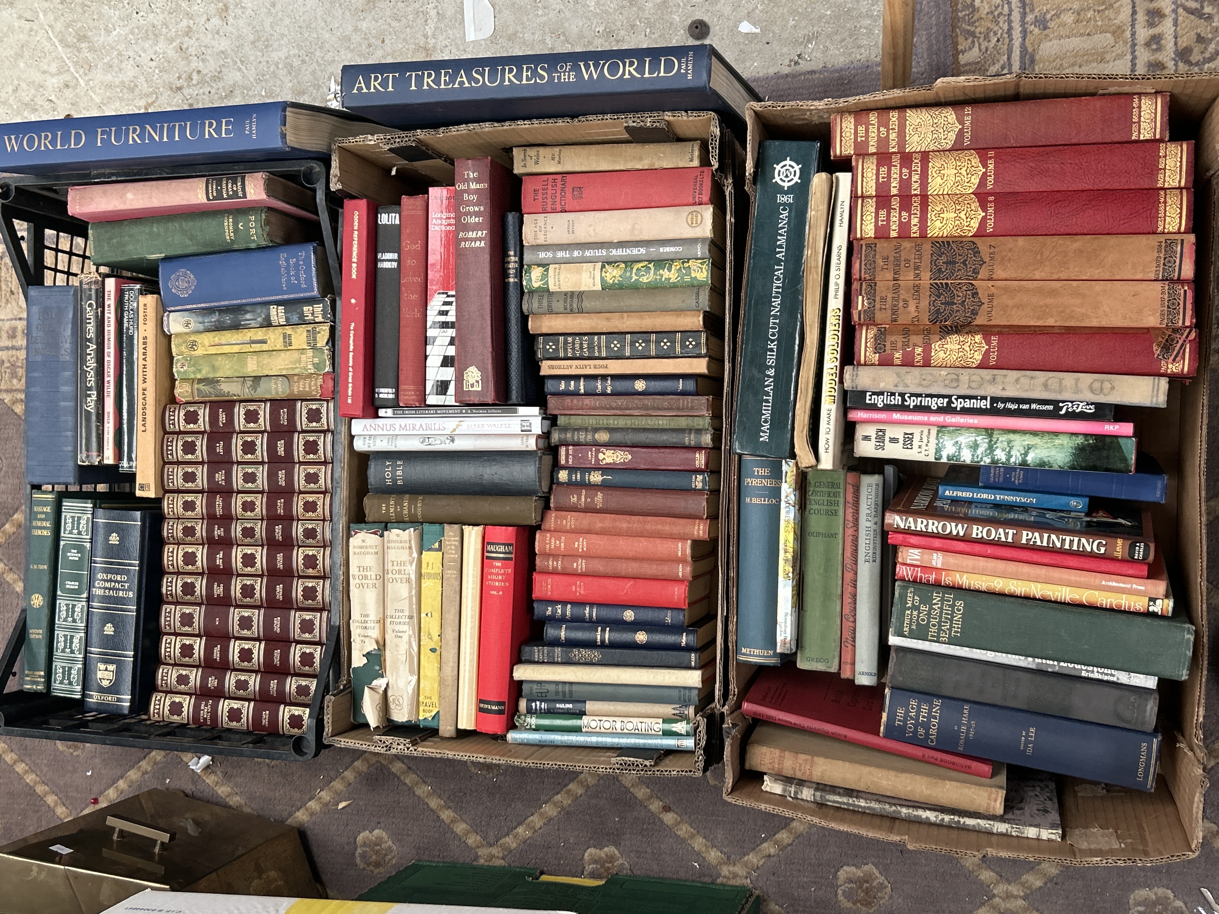 A large collection of hardback books housed in three containers: one black plastic crate and two corrugated cardboard boxes. The collection is highly mixed, comprising volumes of classic literature, reference works, academic titles, encyclopedic sets, and almanacs, dating predominantly from the 20th century, with some volumes potentially earlier.