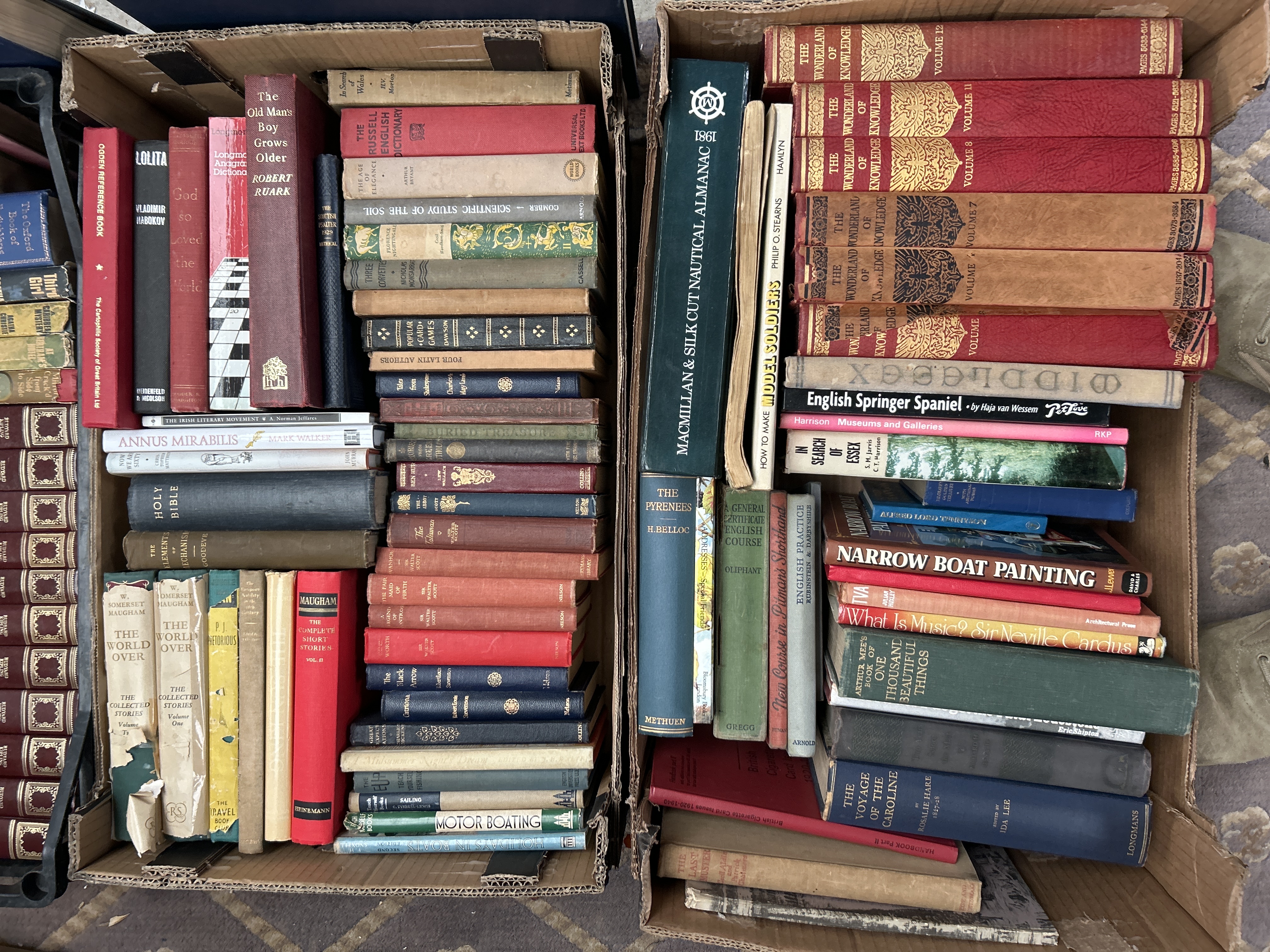 Key identifiable contents include a substantial decorative set of 24 volumes by Rudyard Kipling, bound in burgundy cloth with gilt-tooled spines. Other notable titles include a “HOLY BIBLE,” several volumes of “THE WONDERLAND OF KNOWLEDGE,” and a “MACMILLAN & SILK CUT NAUTICAL ALMANAC 1988.” The books feature various bindings, primarily cloth or bound boards, displaying a mix of colorful and uniformly designed spines. The lot includes general fiction, non-fiction, and reference material such as dictionaries and historical texts. The collection is sold as a single lot in the three containers shown.