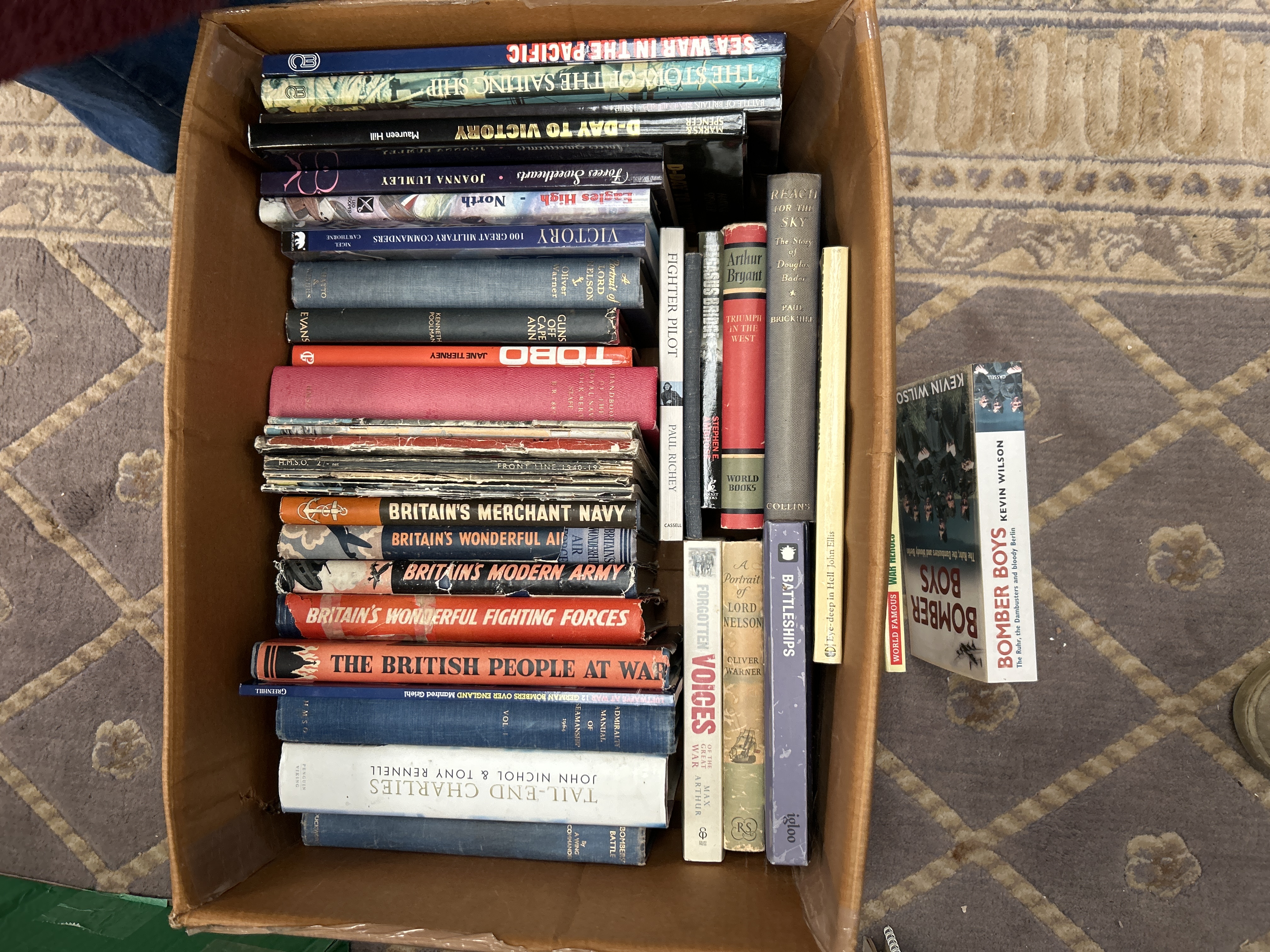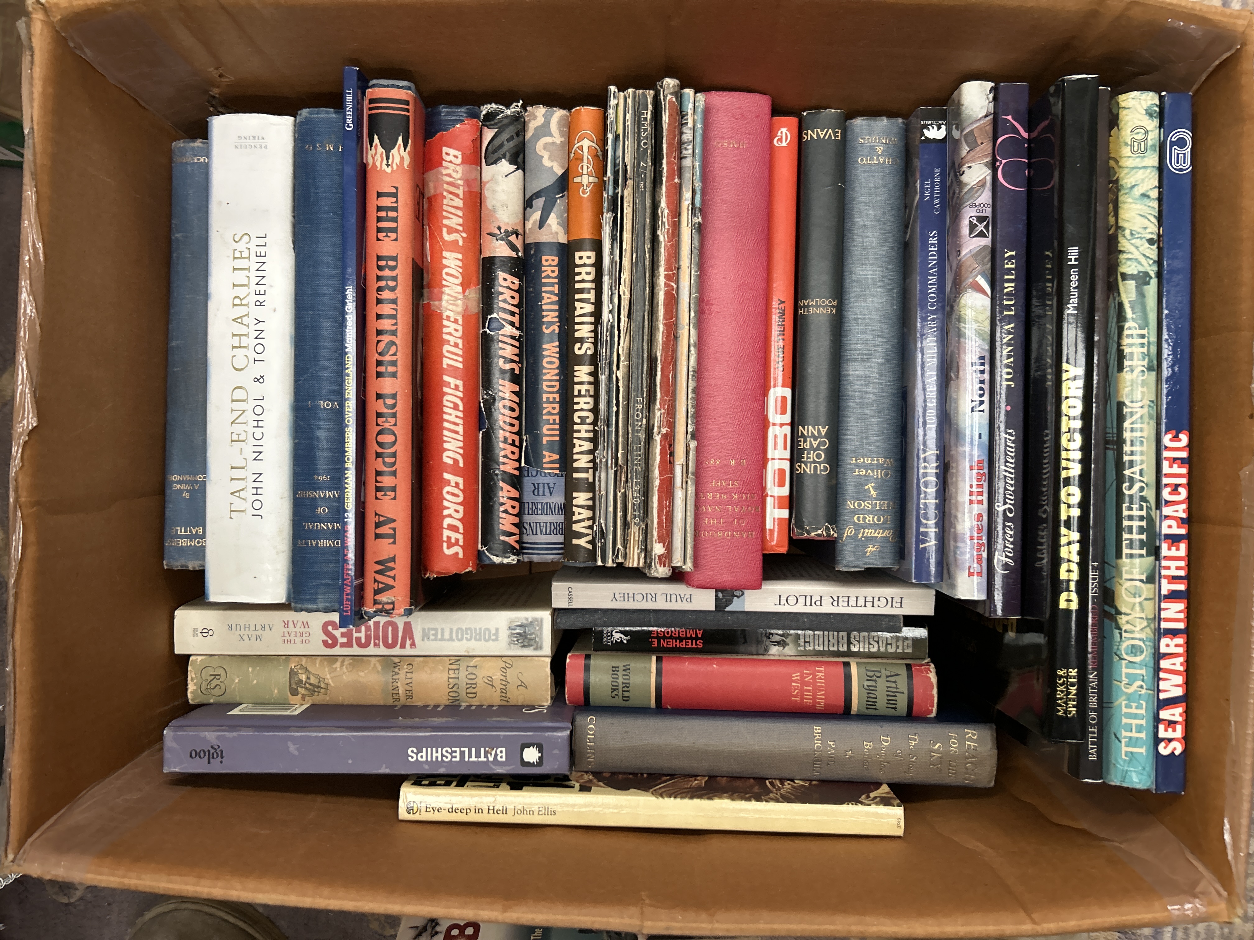 A large collection comprising 56 bound volumes and pamphlets, predominantly focused on 20th-century military history, naval warfare, and biography. The collection features mixed formats, including hardcovers, thick trade paperbacks, and approximately 25 thin, periodical-style volumes. Visible titles include Bomber Boys, D-Day to Victory, Fighter Pilot, Forgotten Voices, The British People at War, Battleships, The Story of the Sailing Ship, and multiple volumes detailing Britain’s Merchant Navy and Britain’s Wonderful Fighting Forces. The spines display a variety of colors and materials, including solid red, blue, gray, black, and tan. The collection is housed in a large brown cardboard storage box.