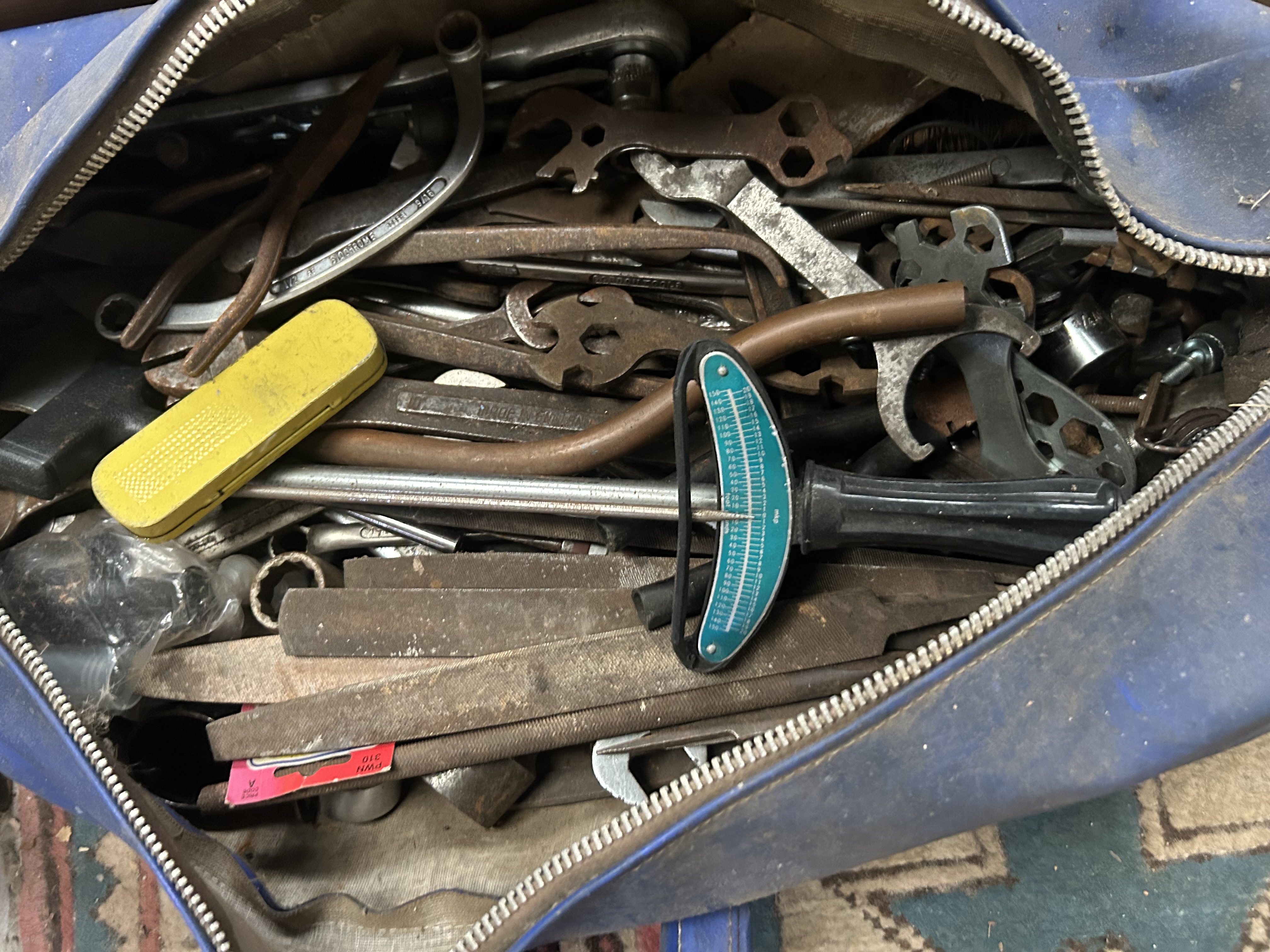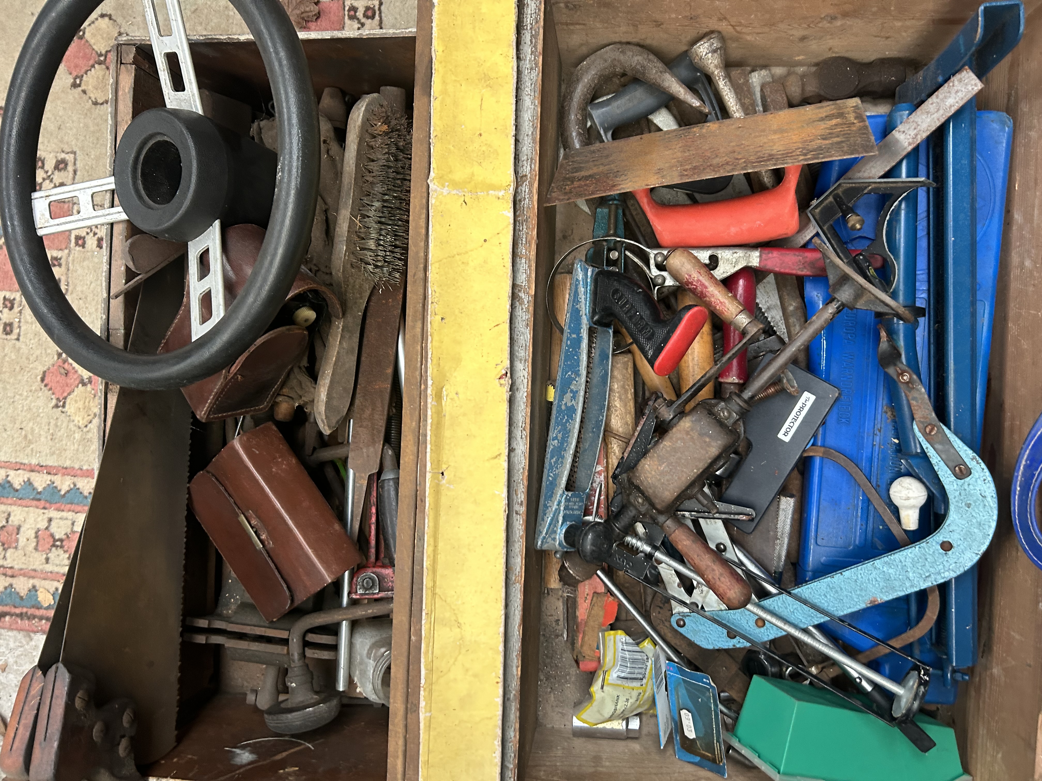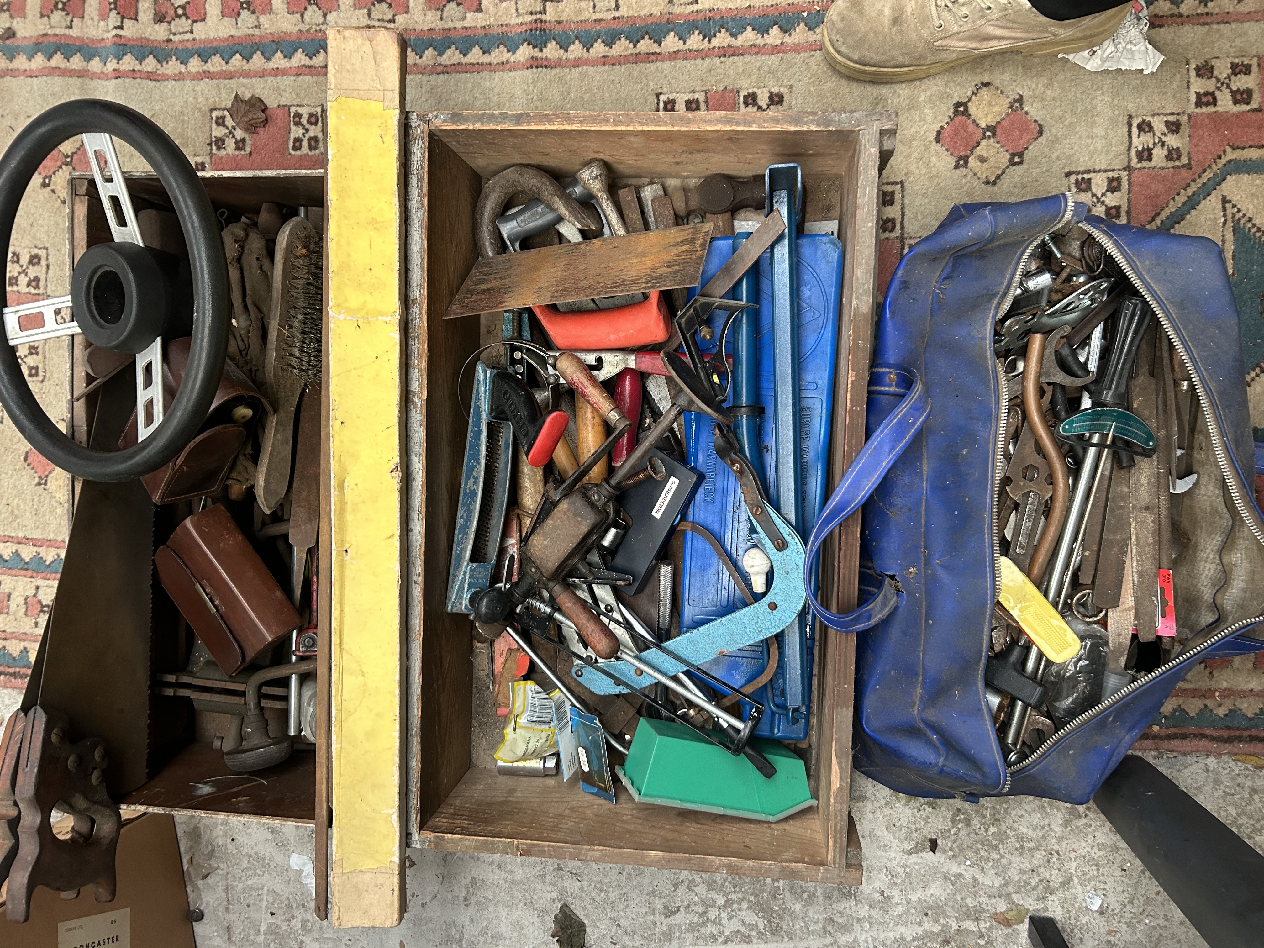 A large collection of general-purpose workshop tools, hardware, and utility items presented across nine major units, including three primary storage containers and six loose items. The containers consist of two stacked wooden boxes and one blue zippered duffel bag. Contents are diverse, spanning hand tools such as files, various wrenches, screwdrivers, and hammers, alongside specialized items including a beam torque wrench featuring a turquoise scale, and a three-spoke automotive steering wheel. Also included is a large wooden-handled saw. The six loose items comprise a red and black portable lantern, a gray electronic device (likely a charger or scale), a small electric rotary tool, and two compartmentalized orange/red plastic cases, one containing visible fasteners. A blue case visible within the middle wooden box bears a partial label reading PROT[ECTION]. Materials are mixed, including steel, wood, plastic, and rubber.
