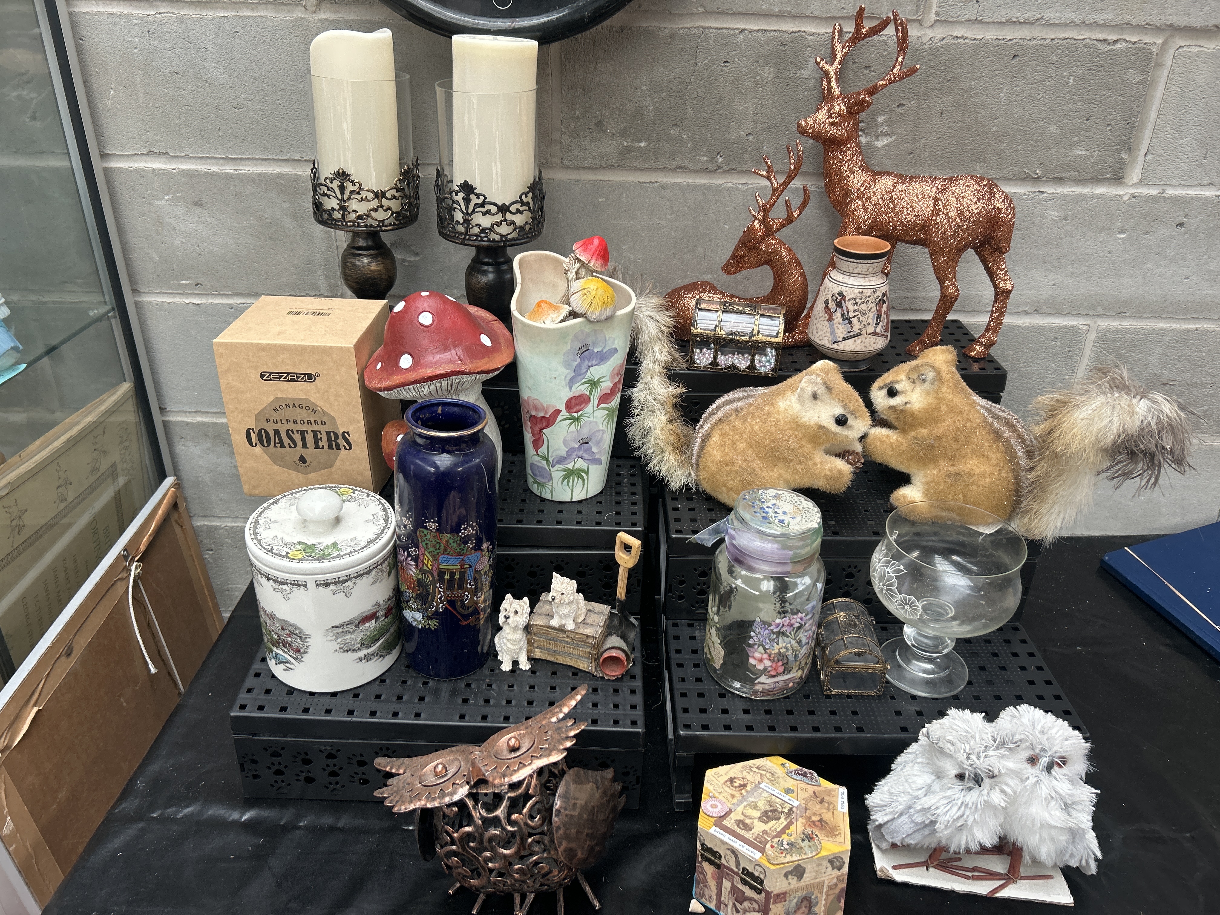 A large collection of mixed decorative and household objects. The assemblage includes a variety of materials such as metal, glass, ceramic, resin, faux fur, and cardboard.