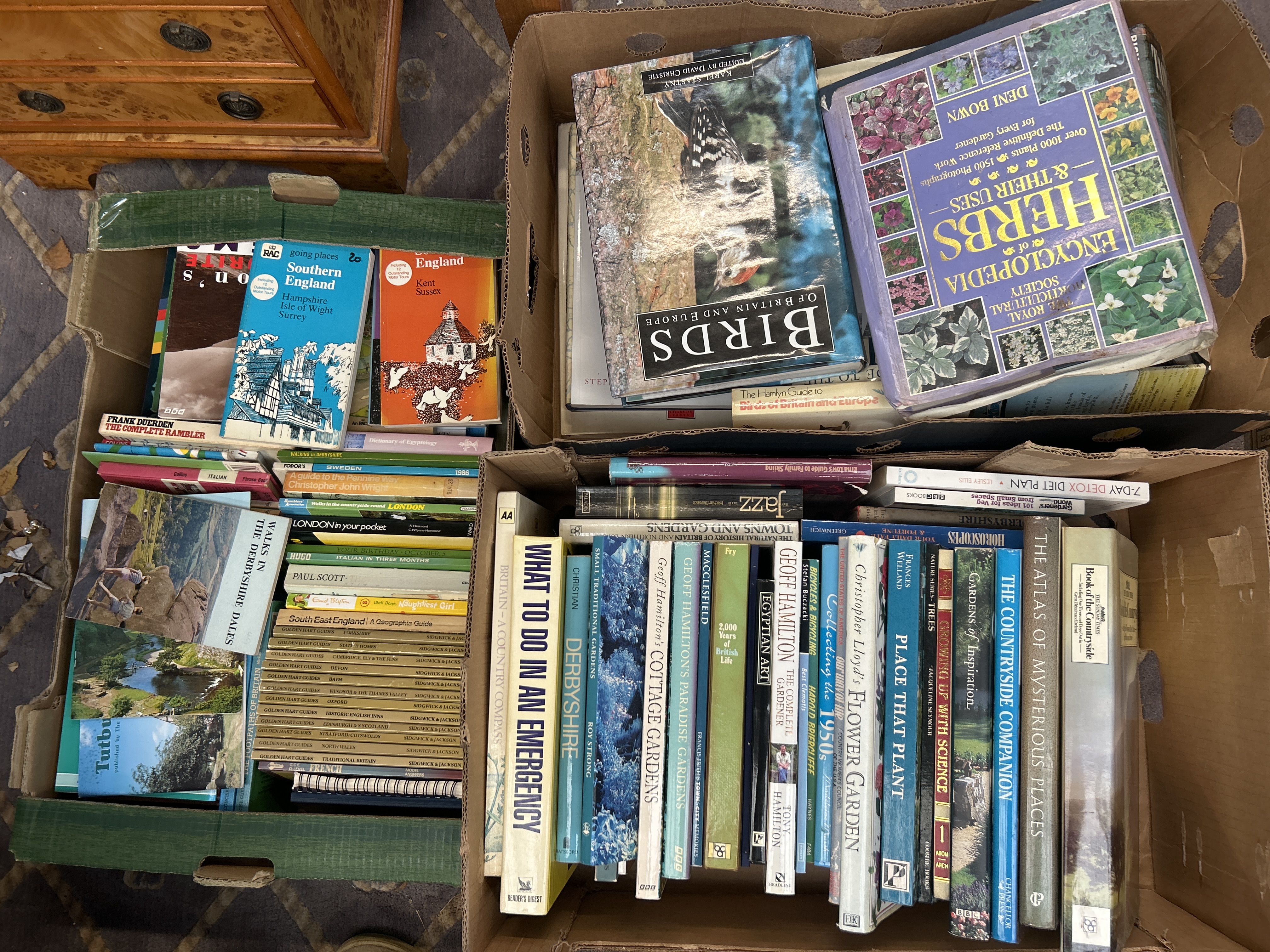 A large collection of 98 non-fiction reference books, guides, and encyclopedias, primarily focusing on British natural history, gardening, geography, travel, and local interest. The collection is packed into four corrugated cardboard boxes. Notable titles include The Royal Horticultural Society Encyclopedia of Herbs & Their Uses, Birds of Britain and Europe, The Atlas of Mysterious Places, and What To Do In An Emergency (Reader’s Digest). The collection features numerous regional guides covering areas such as Derbyshire, Kent, Sussex, and London, alongside specialist gardening volumes (e.g., Christopher Lloyd’s Flower Garden, Geoff Hamilton’s Cottage Gardens). Also present are various educational and travel guides, including multiple thin volumes from the Sidgwick & Jackson series and Golden Hart Guides. Materials are predominantly paper and cardboard bindings (hardback and paperback).