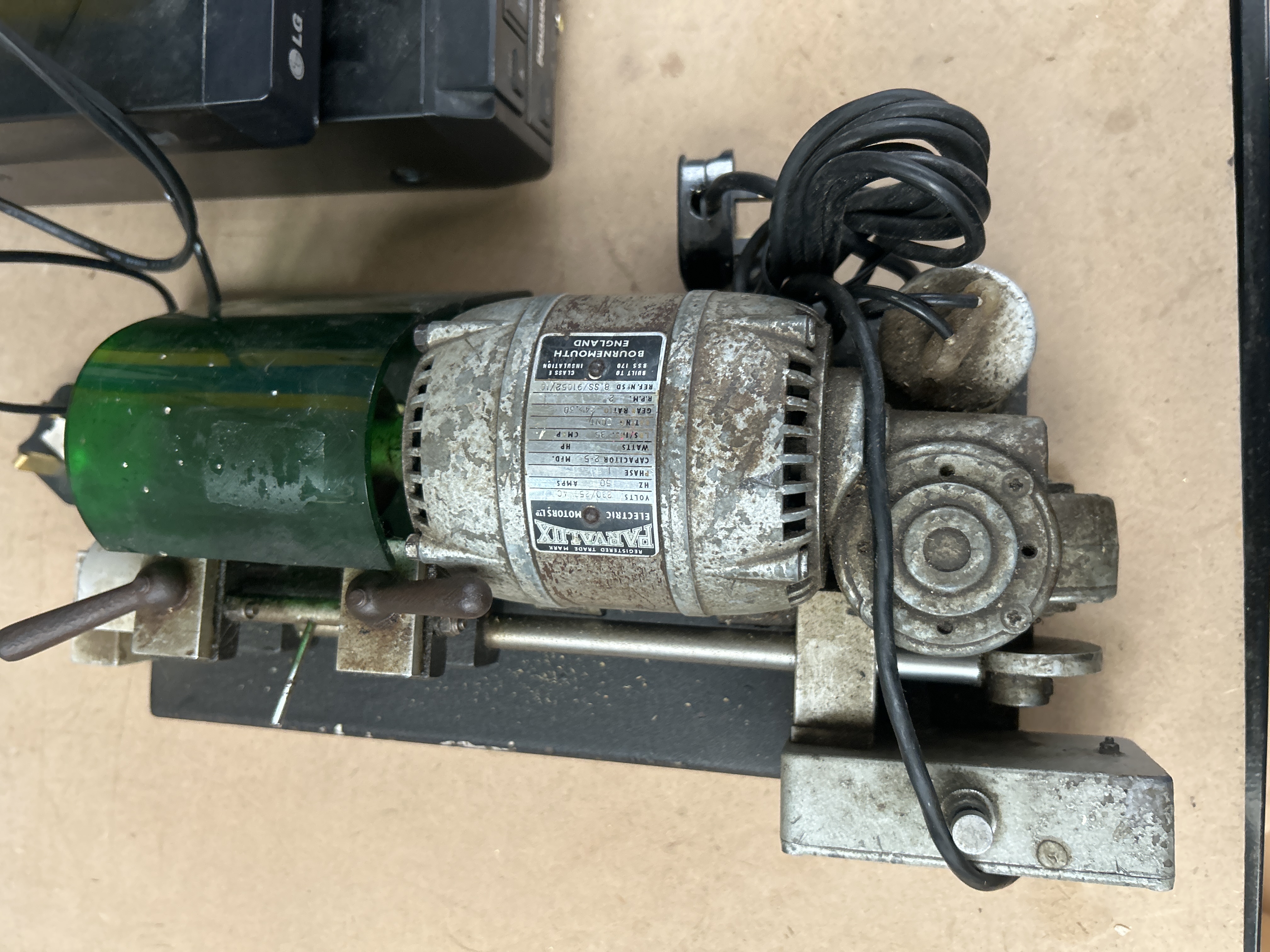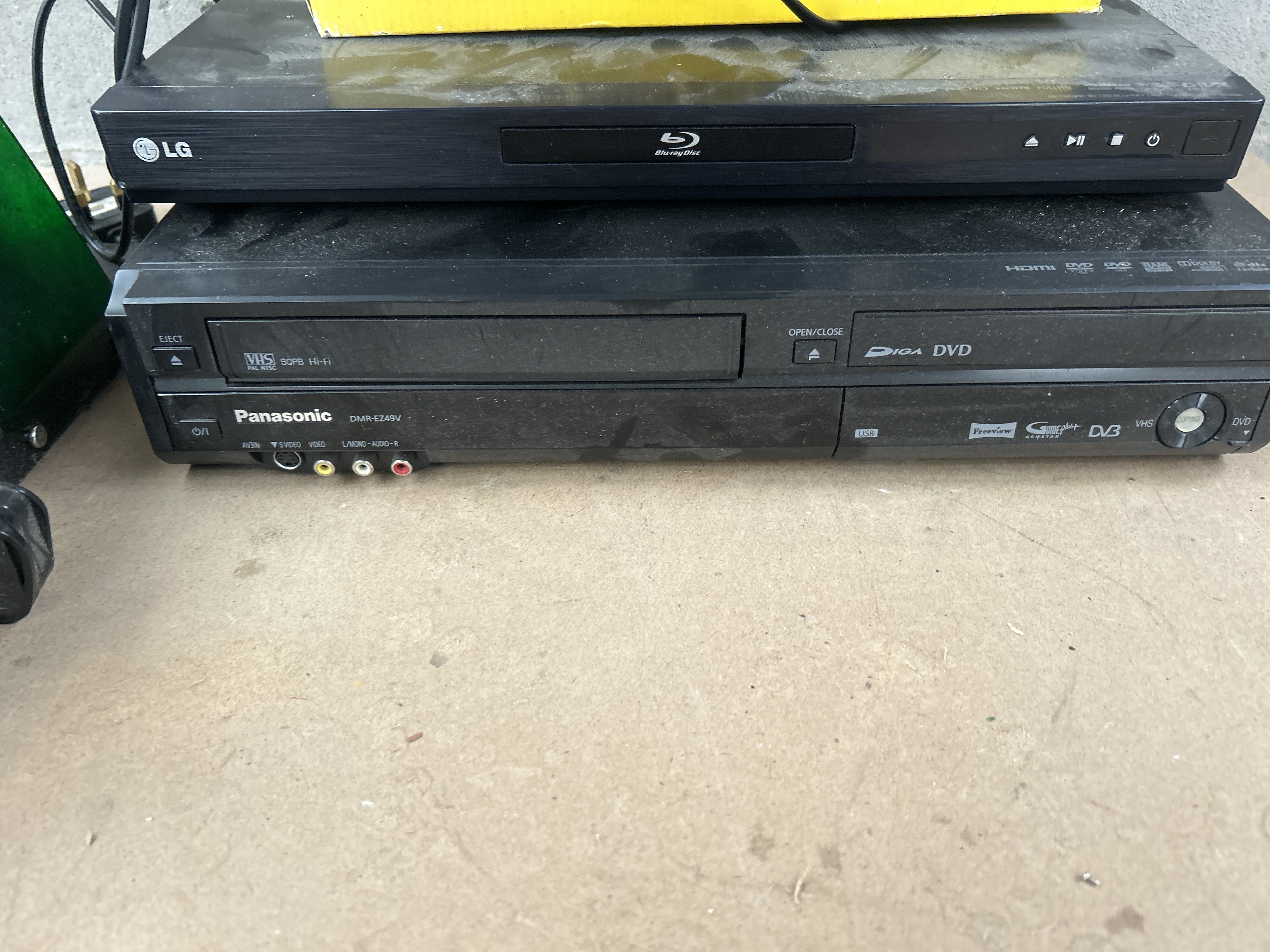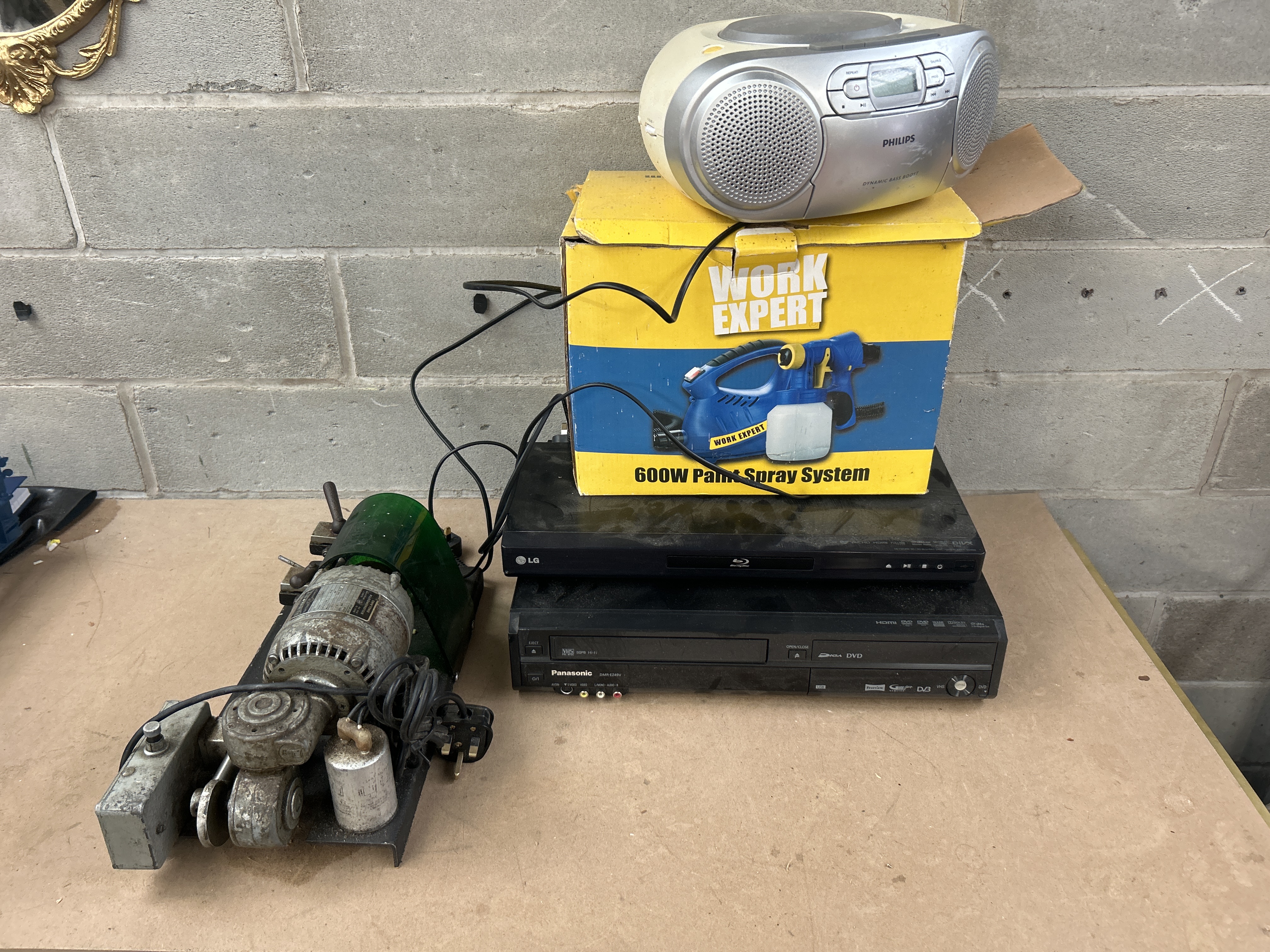 A collection of distinct items comprising consumer electronics, packaging for a paint spray system, and a heavy-duty motorized apparatus. The electronics stack includes a portable Philips CD player/radio unit in beige and silver-tone plastic, resting atop a yellow and blue cardboard box labeled WORK EXPERT 600W Paint Spray System, consistent with market listings for handheld electric or cordless paint sprayers. Below the box are two black electronics units: an LG Blu-ray Disc player and a Panasonic DMR-EZ49V VCR/DiGA DVD combination recorder. The fifth item is a vintage motorized tool featuring a corroded metal motor housing, multiple rollers, and a green translucent plastic cover. A visible nameplate on the motorized tool identifies the manufacturer as J. E. WILDEN (ELECTRICS) LTD., MFD IN ENGLAND.