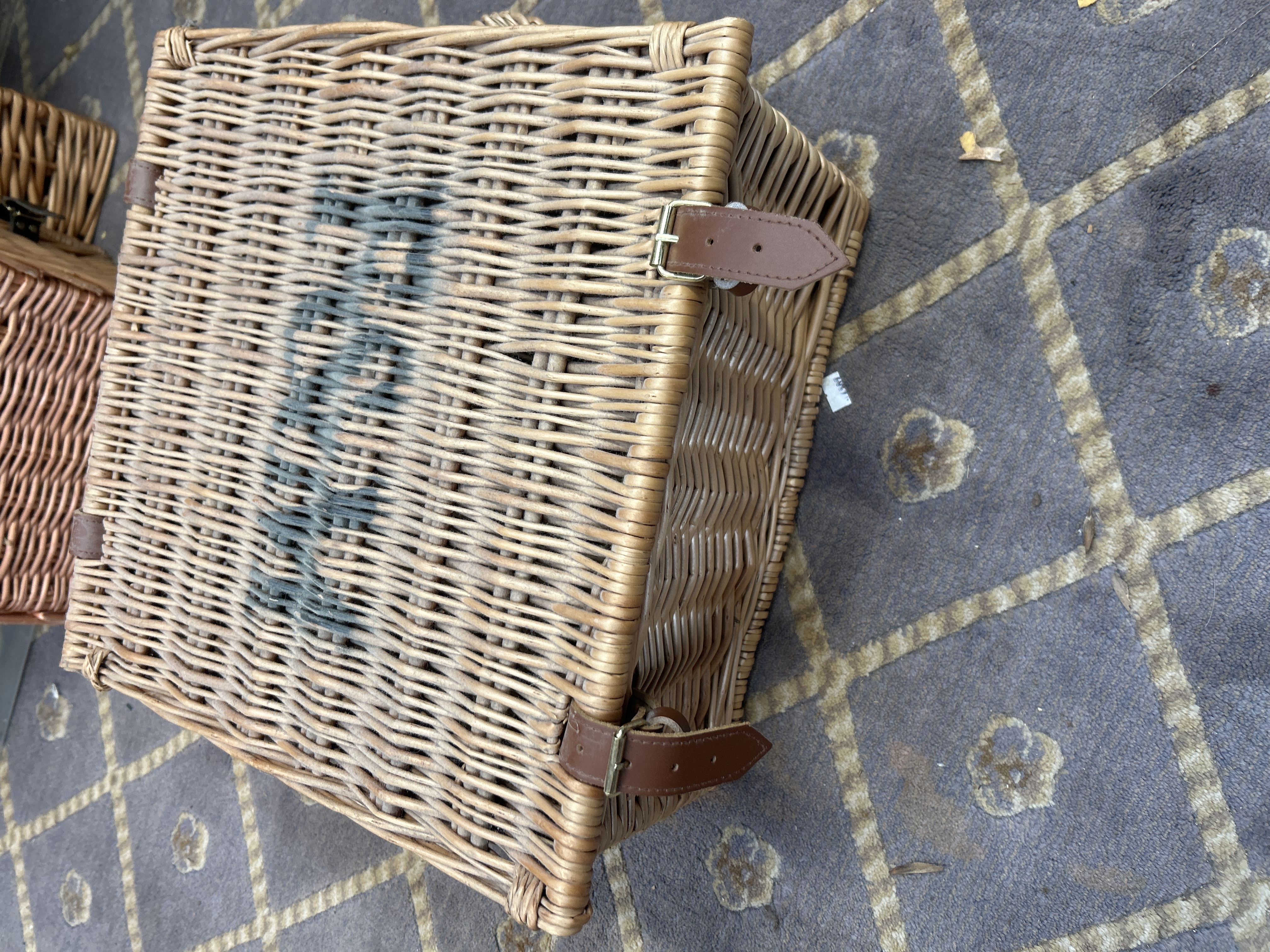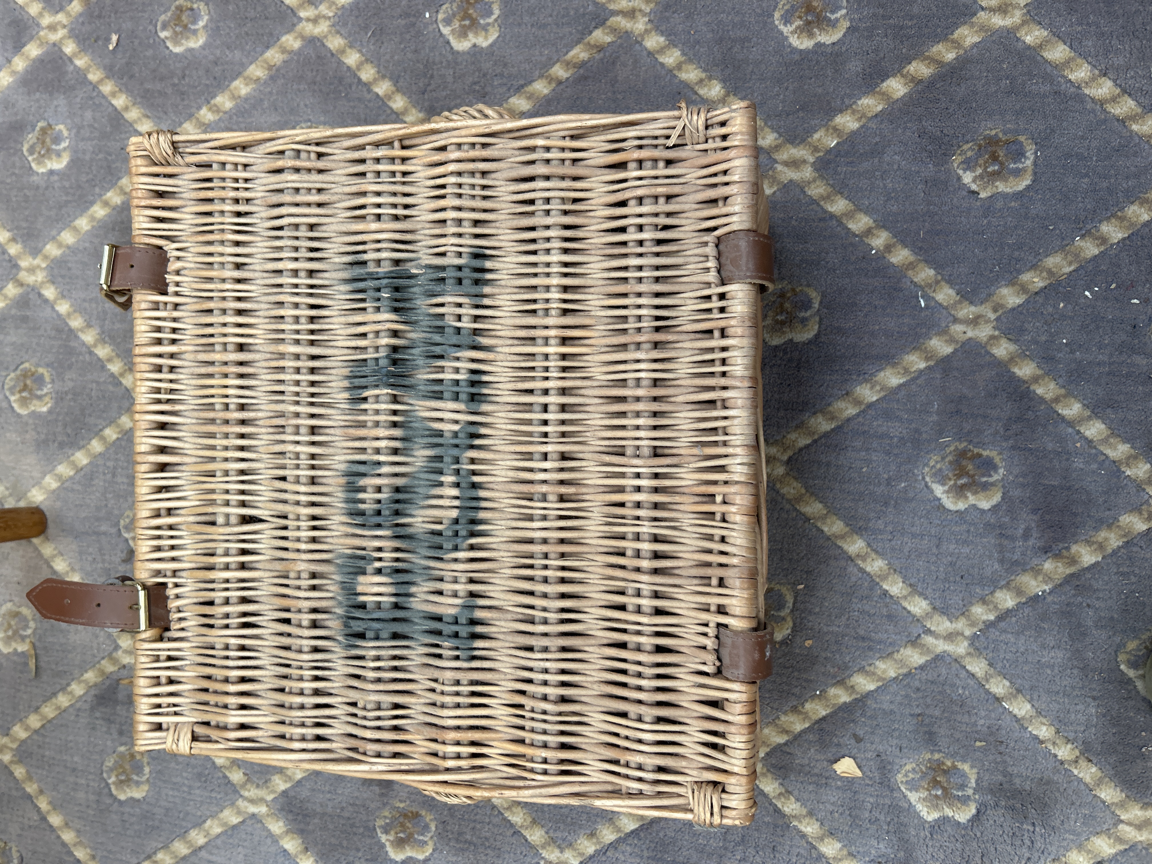 A traditional rectangular picnic hamper attributed to Fortnum & Mason. The item is constructed of woven light-brown wicker or willow in a lidded trunk style. The lid is secured by two brown leather closure straps with brass-toned metal buckles. The top surface of the lid features stenciled text in faded dark green paint, which appears to read ROYAL.