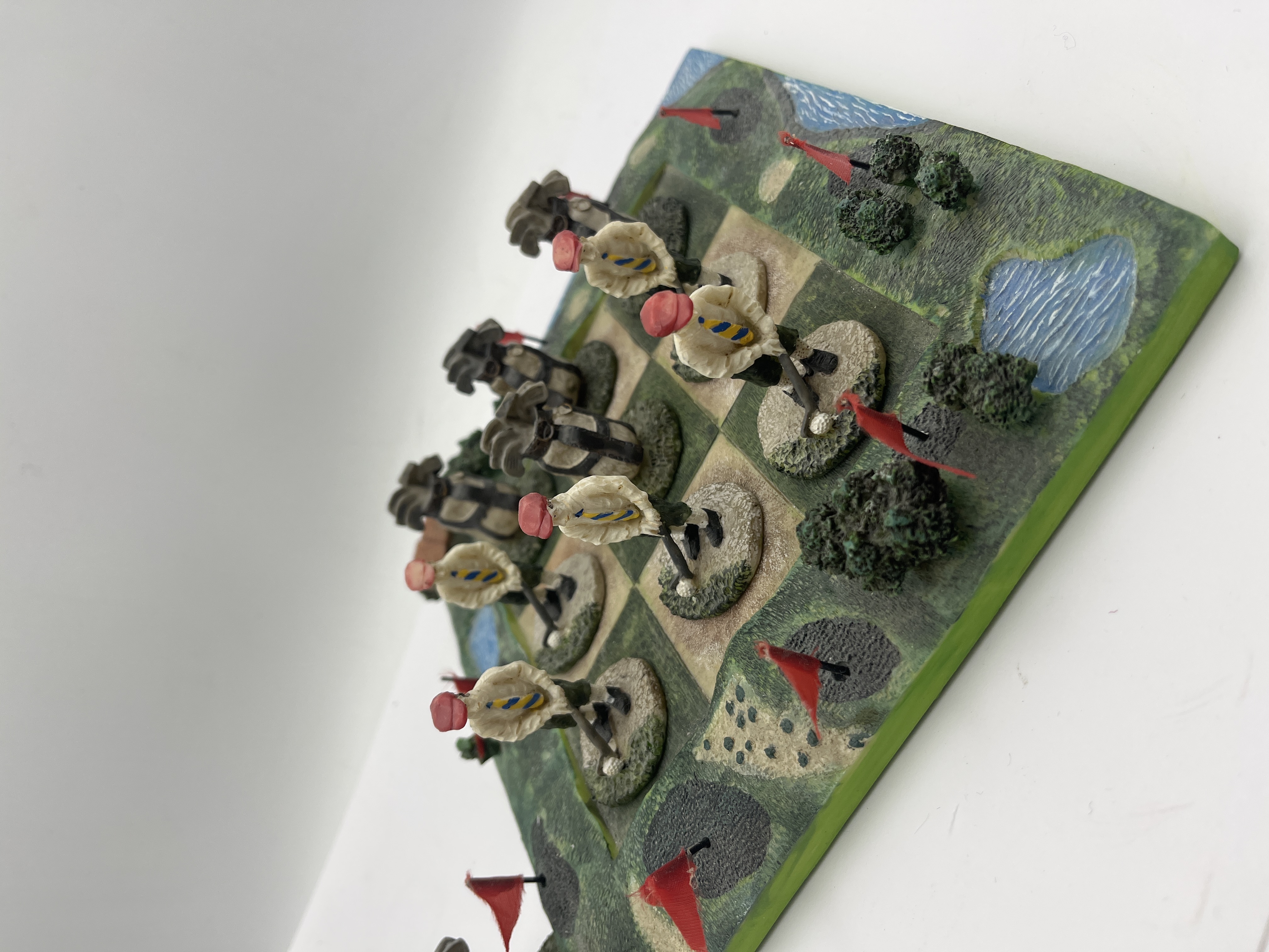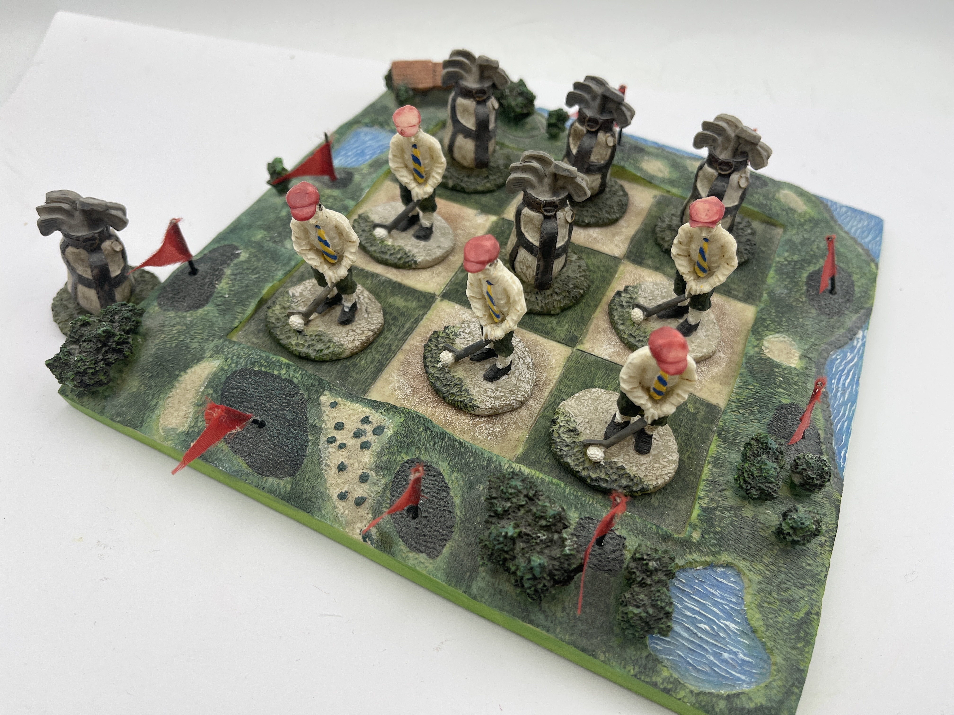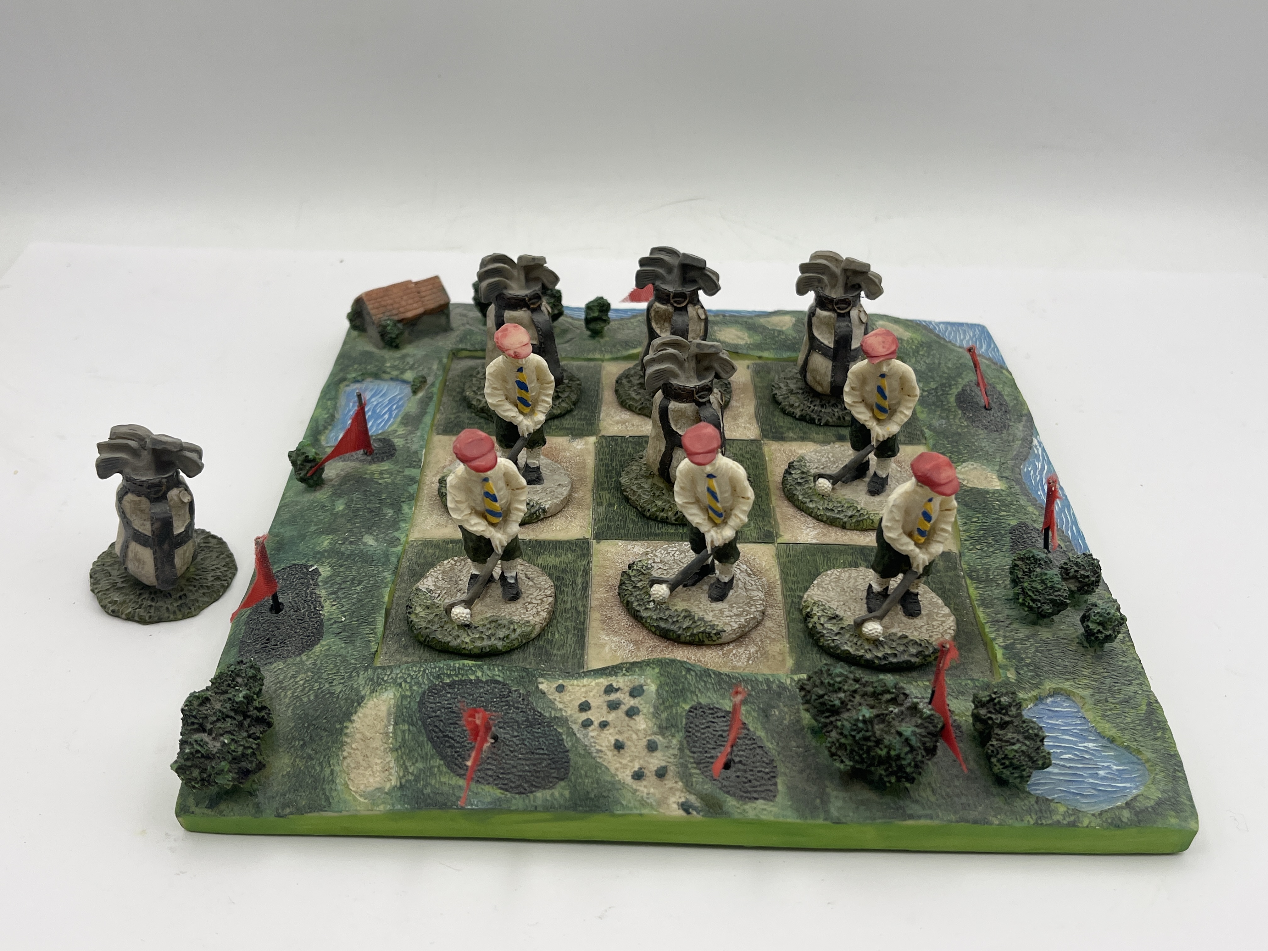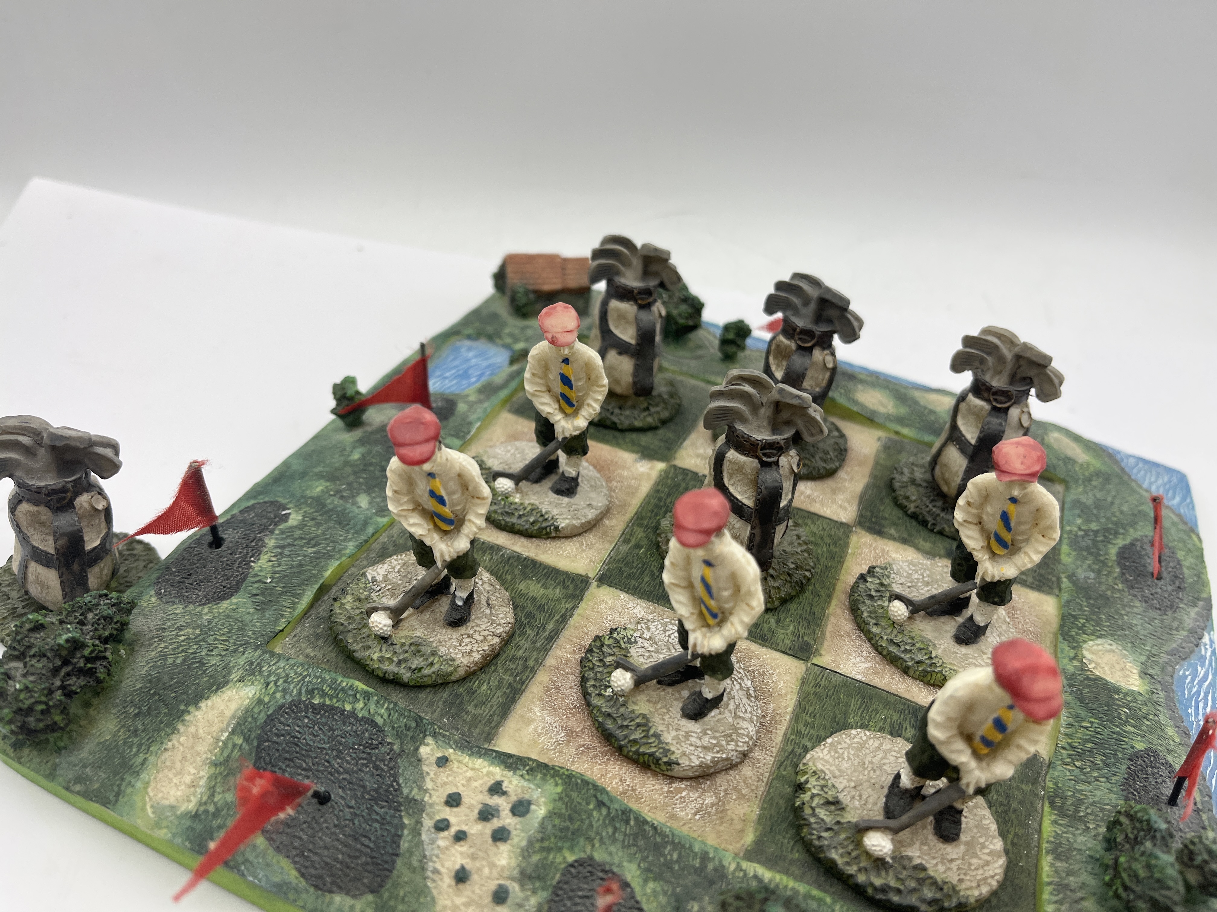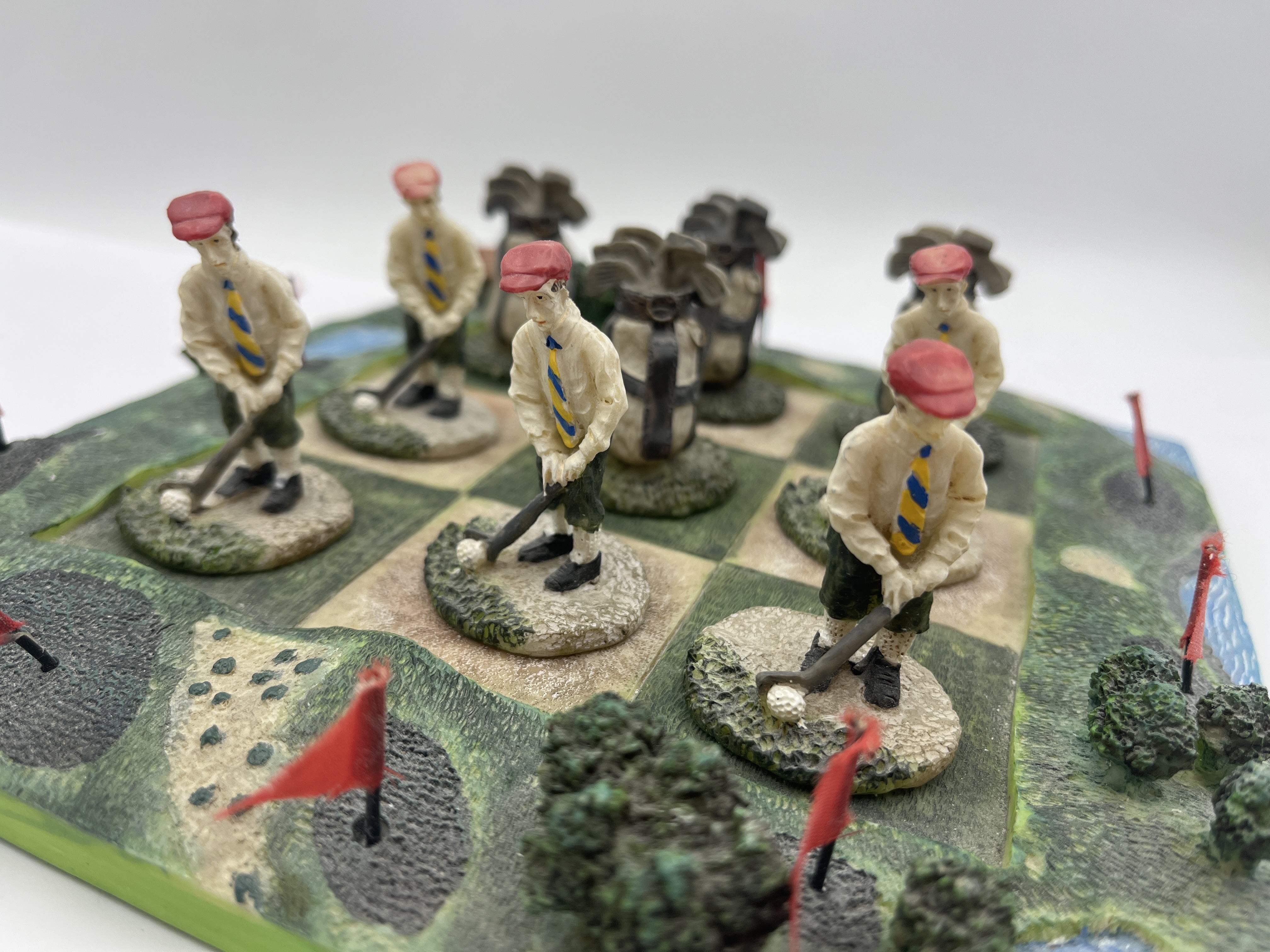 A novelty golf-themed sculptural board game set, consistent with designs produced by Big League Promotions or Cedar Creek, designed for games such as Chess or Tic Tac Toe. The set consists of a single molded and hand-painted resin game board depicting a three-dimensional golf course landscape, featuring green turf, brown rough, water hazards, and sand traps, with a small brown clubhouse structure integrated into the background. The playing area utilizes a central 4×4 checkered grid. The board also features eight fixed red flag markers. The set includes 14 individual cast resin playing pieces: nine pieces representing male golfers wearing vintage cream attire, red caps, and yellow/blue striped ties, and five pieces representing dark golf bags. The pieces are positioned on textured circular bases simulating grass.