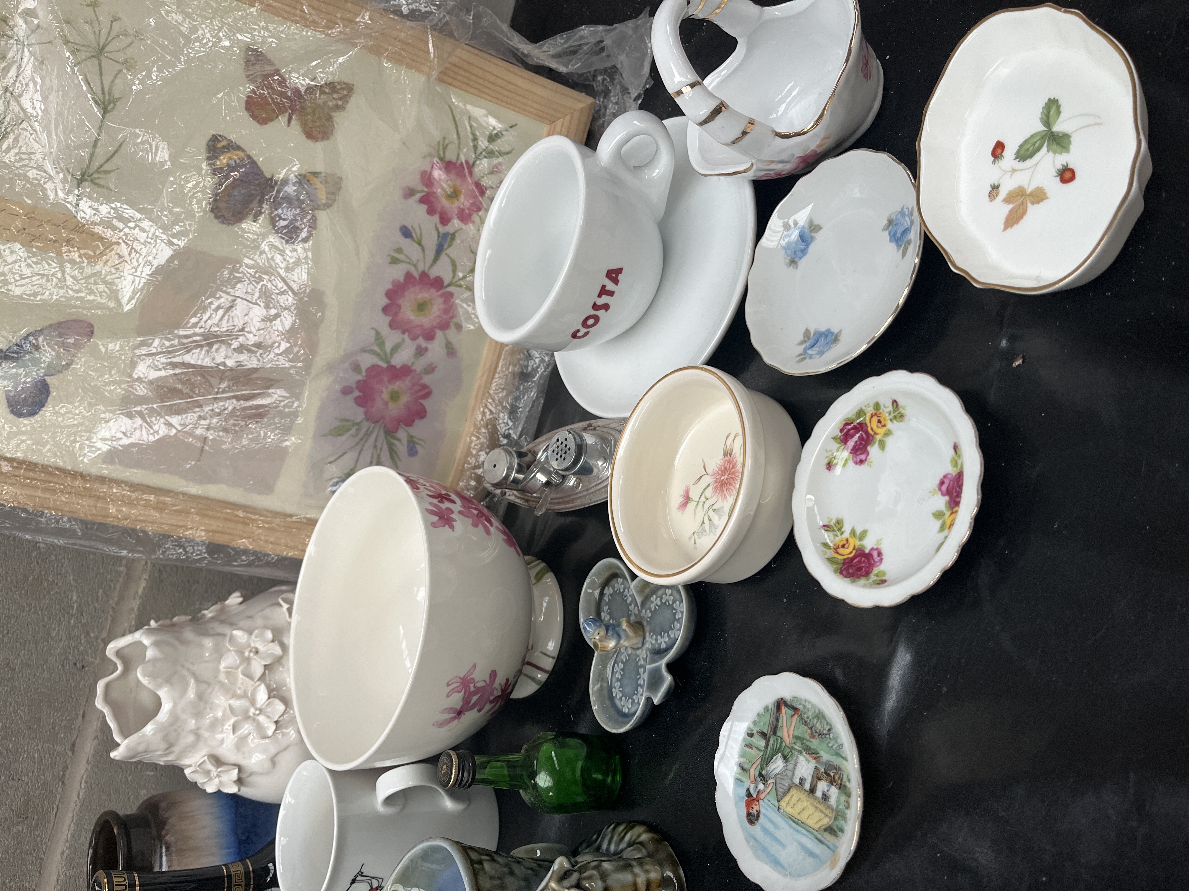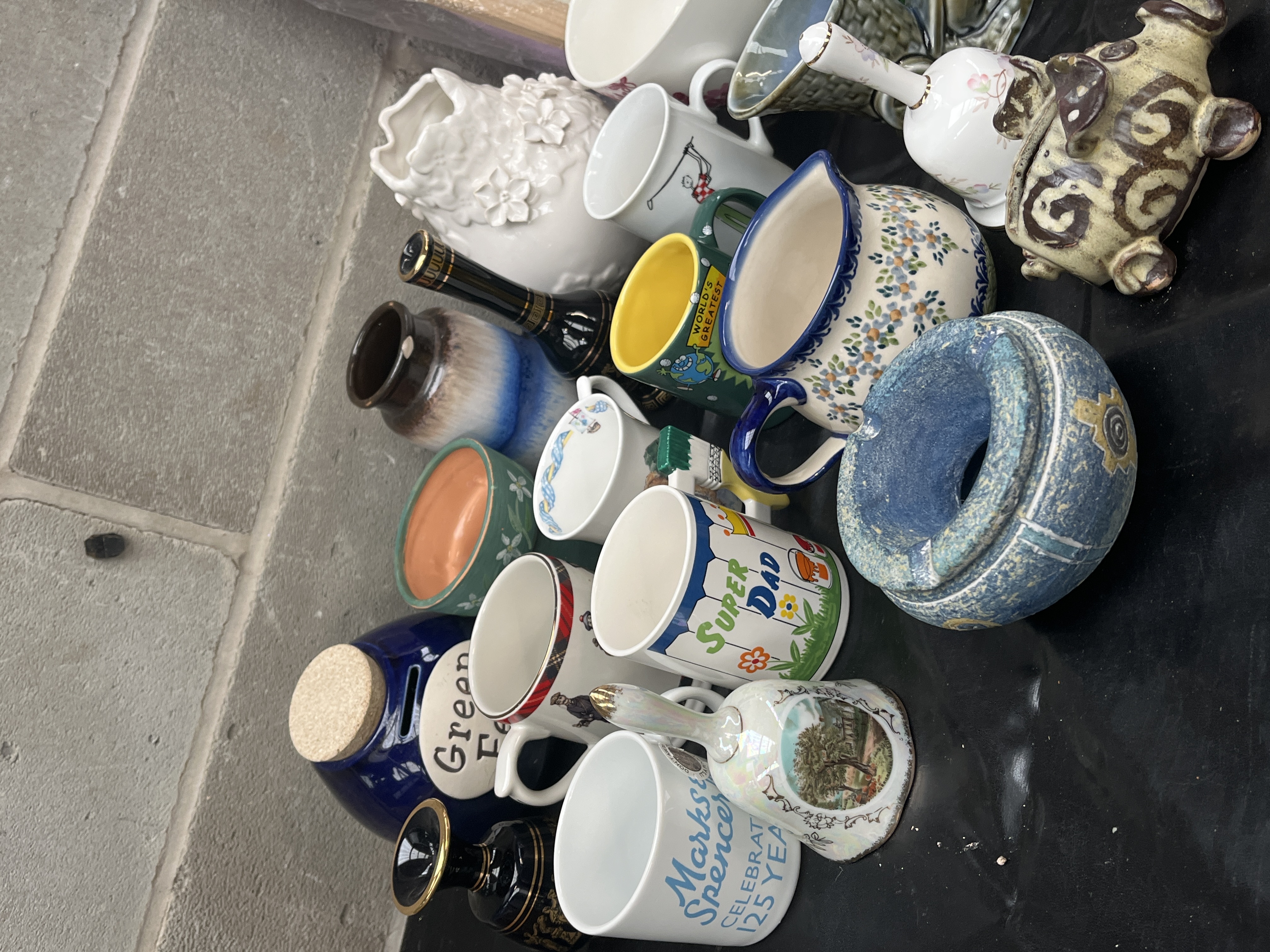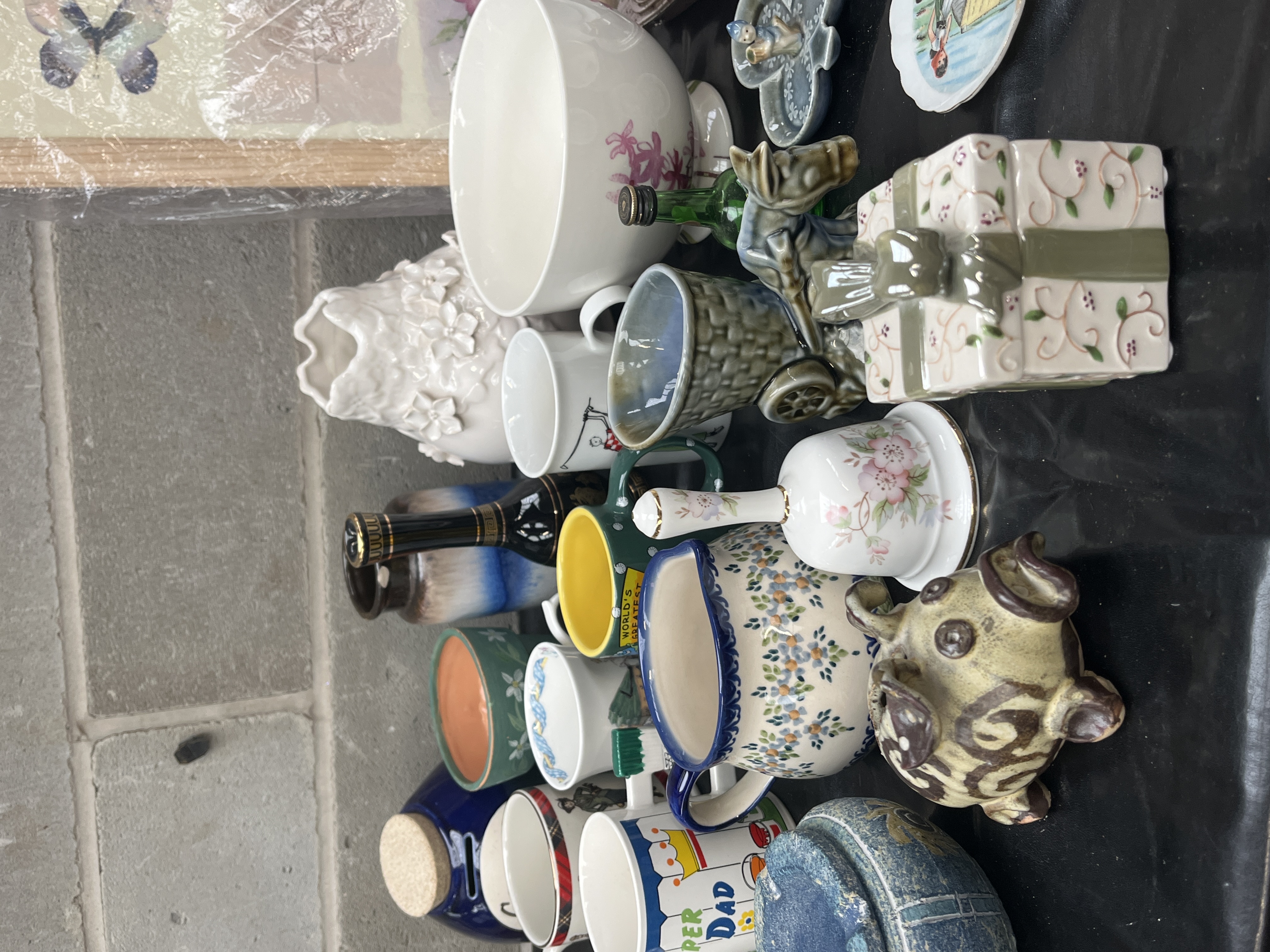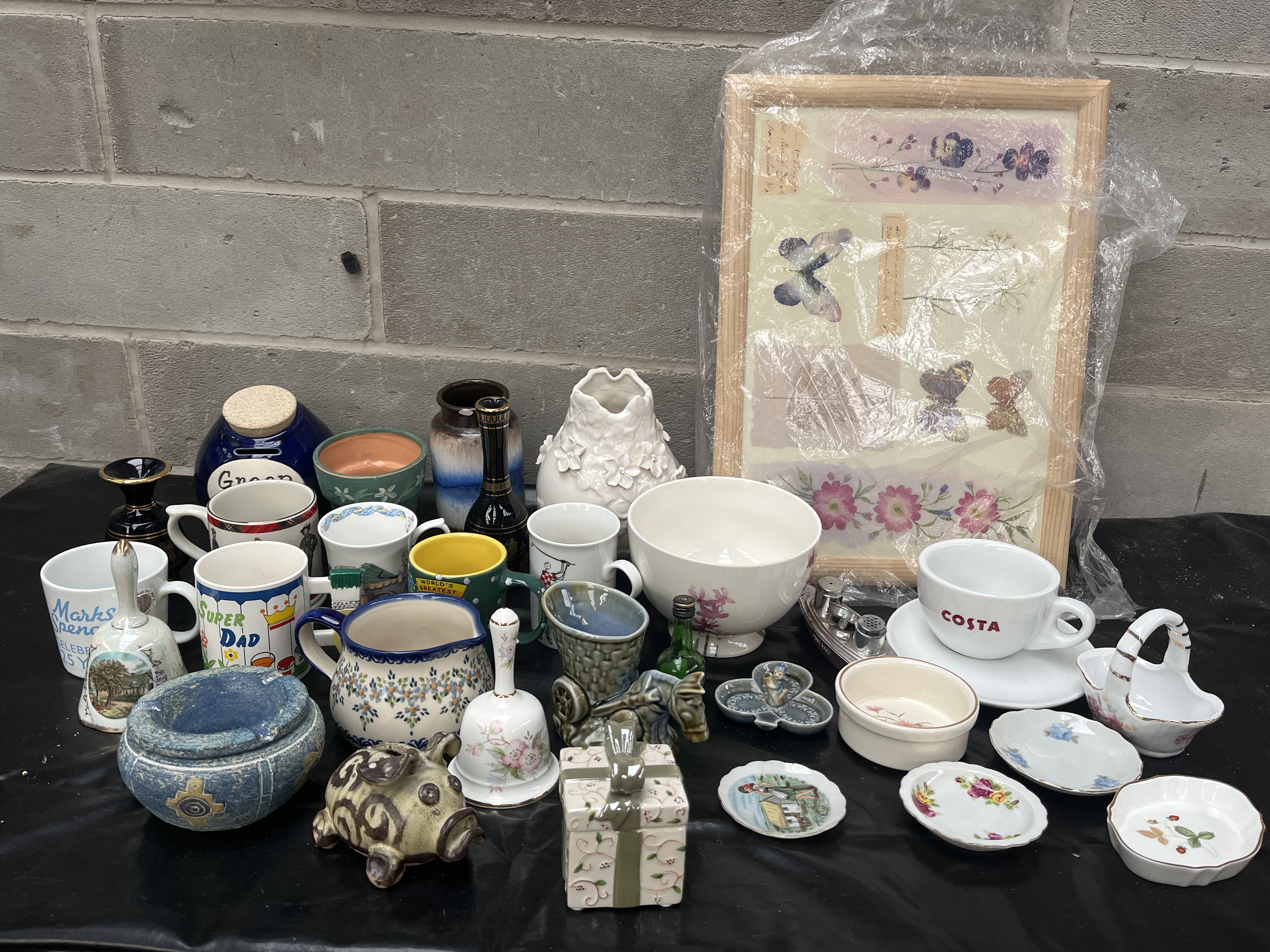 A large collection comprising assorted decorative and domestic items, primarily constructed from ceramic and porcelain, with supplementary pieces in glass and wood. The lot includes various drinking vessels such as novelty mugs marked SUPER DAD and WORLD’S BEST, as well as a branded COSTA cup and saucer set. Also present are several pitchers and jugs, including one decorated in a blue and white pattern resembling traditional Polish folk pottery. Novelty items include a blue ceramic GREEN SAVINGS jar with a cork stopper, a patterned ceramic piggy bank, and a small ceramic box shaped like a wrapped gift. Decorative elements include two ceramic bells, one featuring a landscape scene and the other a floral motif, and a large white ceramic vase with high relief floral decoration. The collection also contains several miniature porcelain dishes and plates, two small glass liquor bottles, and a clear glass condiment shaker. A framed piece of artwork depicting butterflies and flowers, protected by plastic wrapping and set in a light wood frame, is included.
