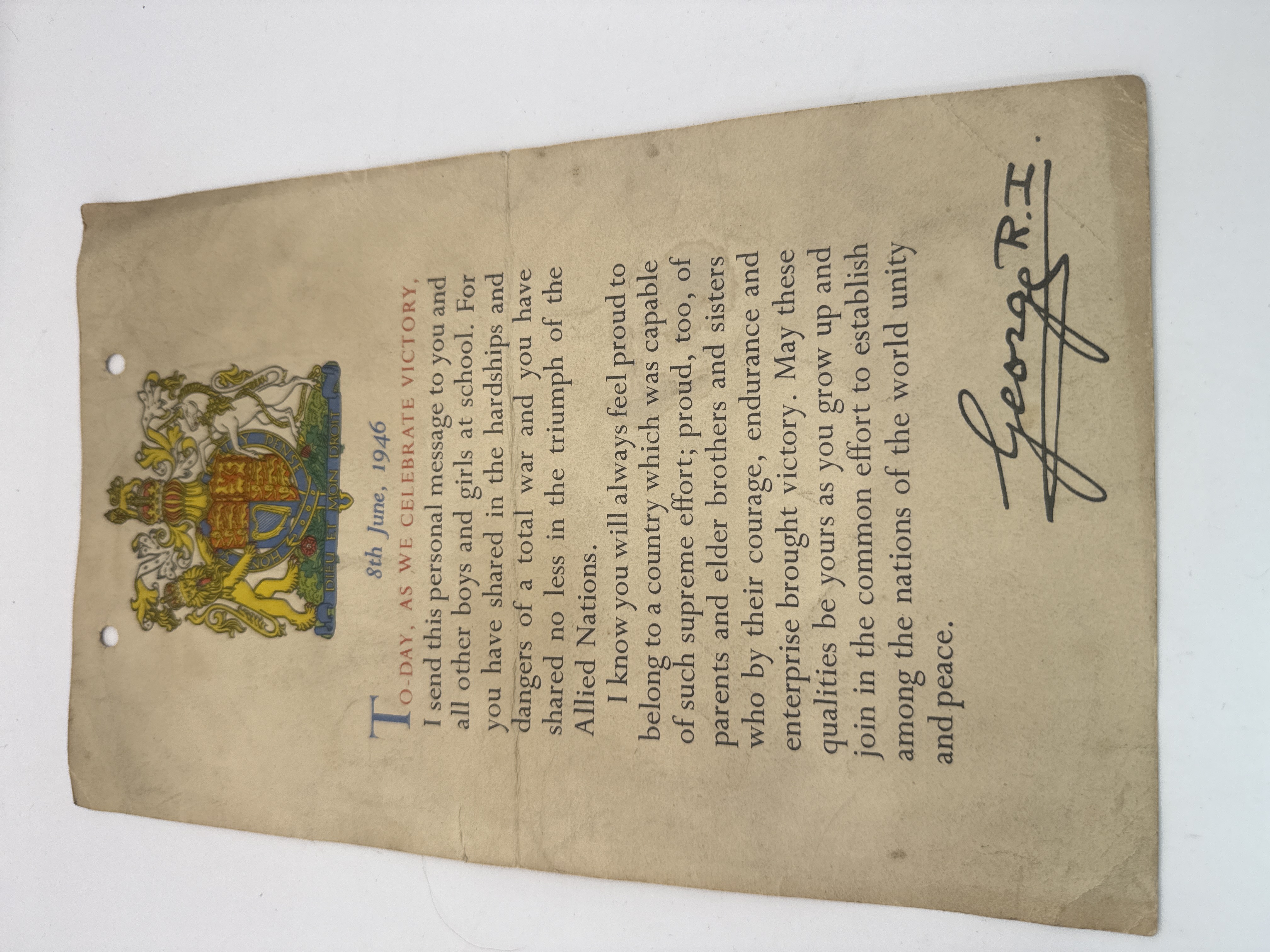 Lot 535: King George VI Allied Victory Message Certificate to Schoolchildren 1946