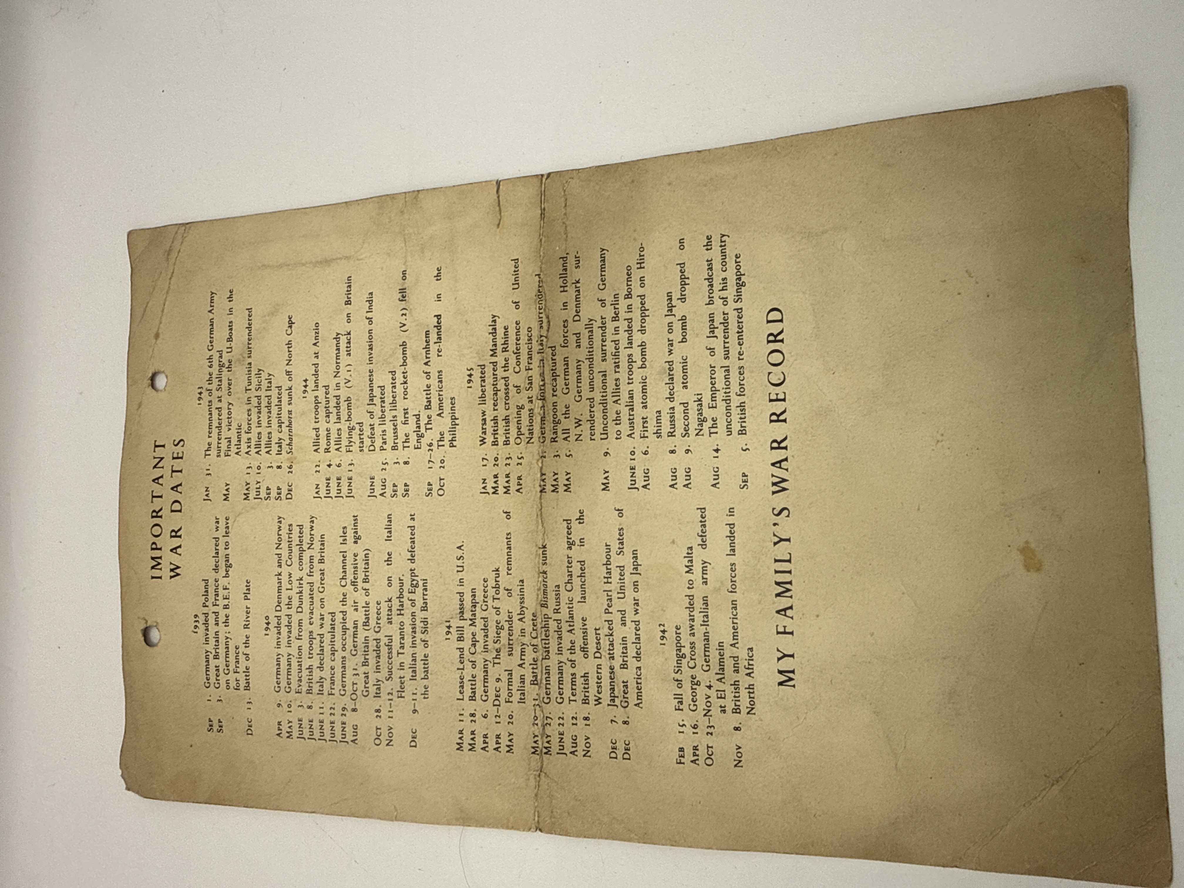 The item is a commemorative document, widely identified as the King George VI Allied Victory Message or Certificate, issued to schoolchildren on 8th June 1946 following the conclusion of World War II. Printed on thin, light-brown cardstock, the front features a formal message from the King regarding the triumph of the Allied Nations, accompanied by a color printed image of the Royal Coat of Arms bearing the motto Dieu et mon droit. The message concludes with the facsimile signature of George R.I. The reverse side is titled IMPORTANT WAR DATES and MY FAMILY’S WAR RECORD, providing a chronological listing of major events spanning the war years from 1939 to 1945, intended for educational or personal record-keeping purposes.