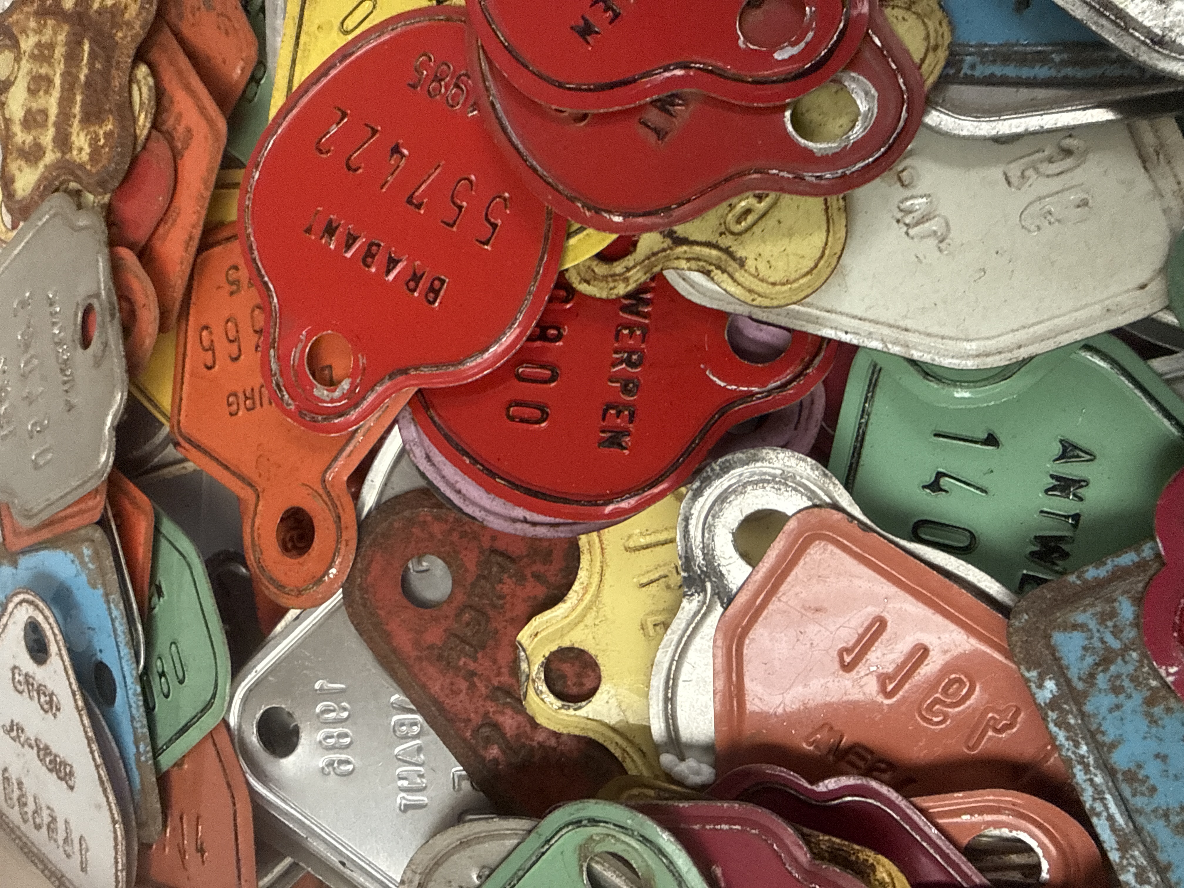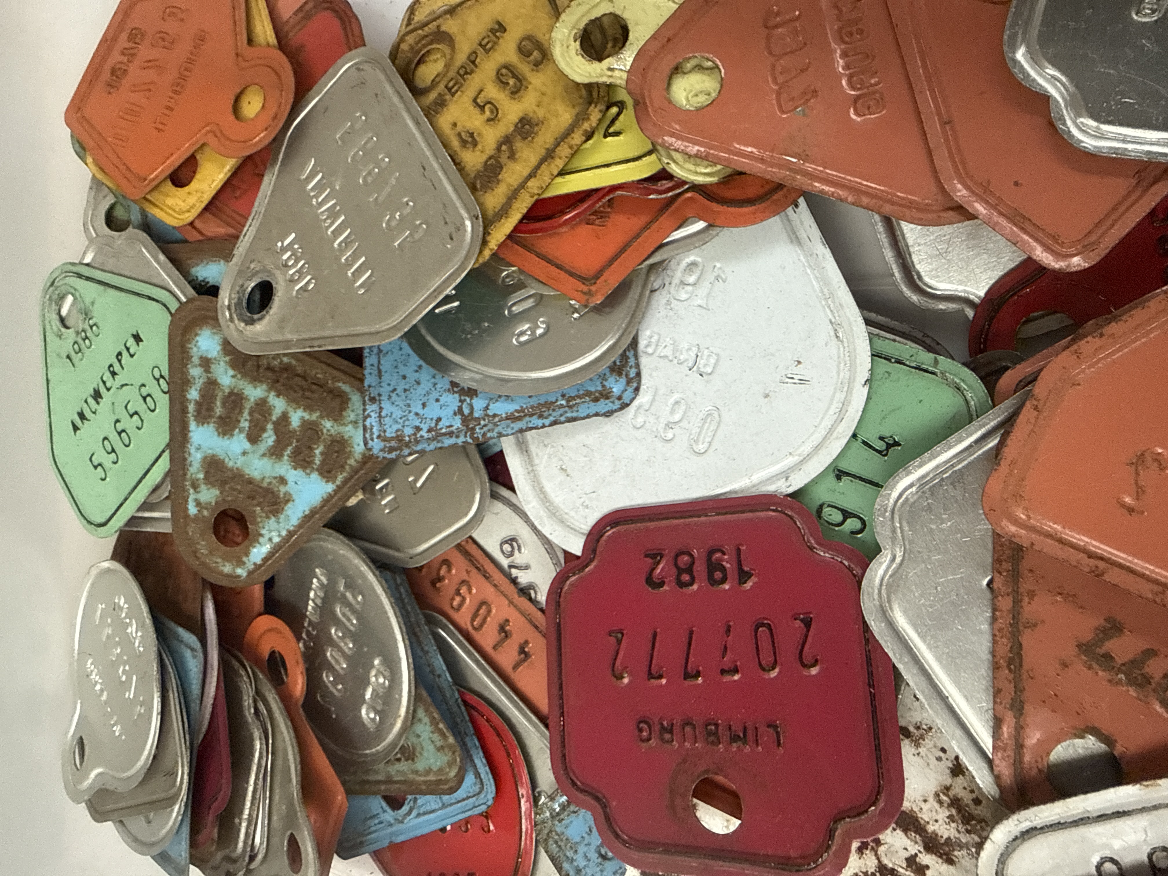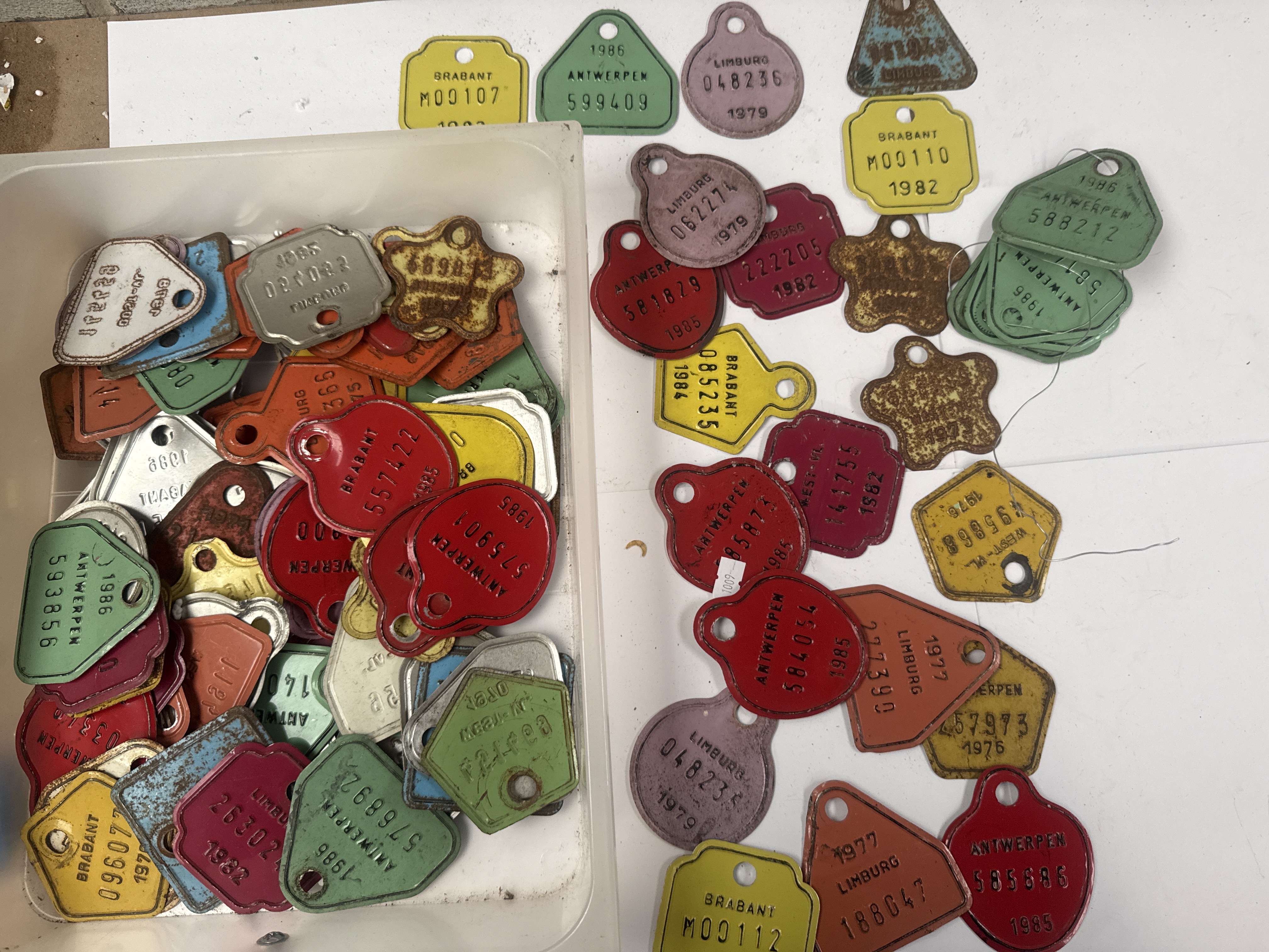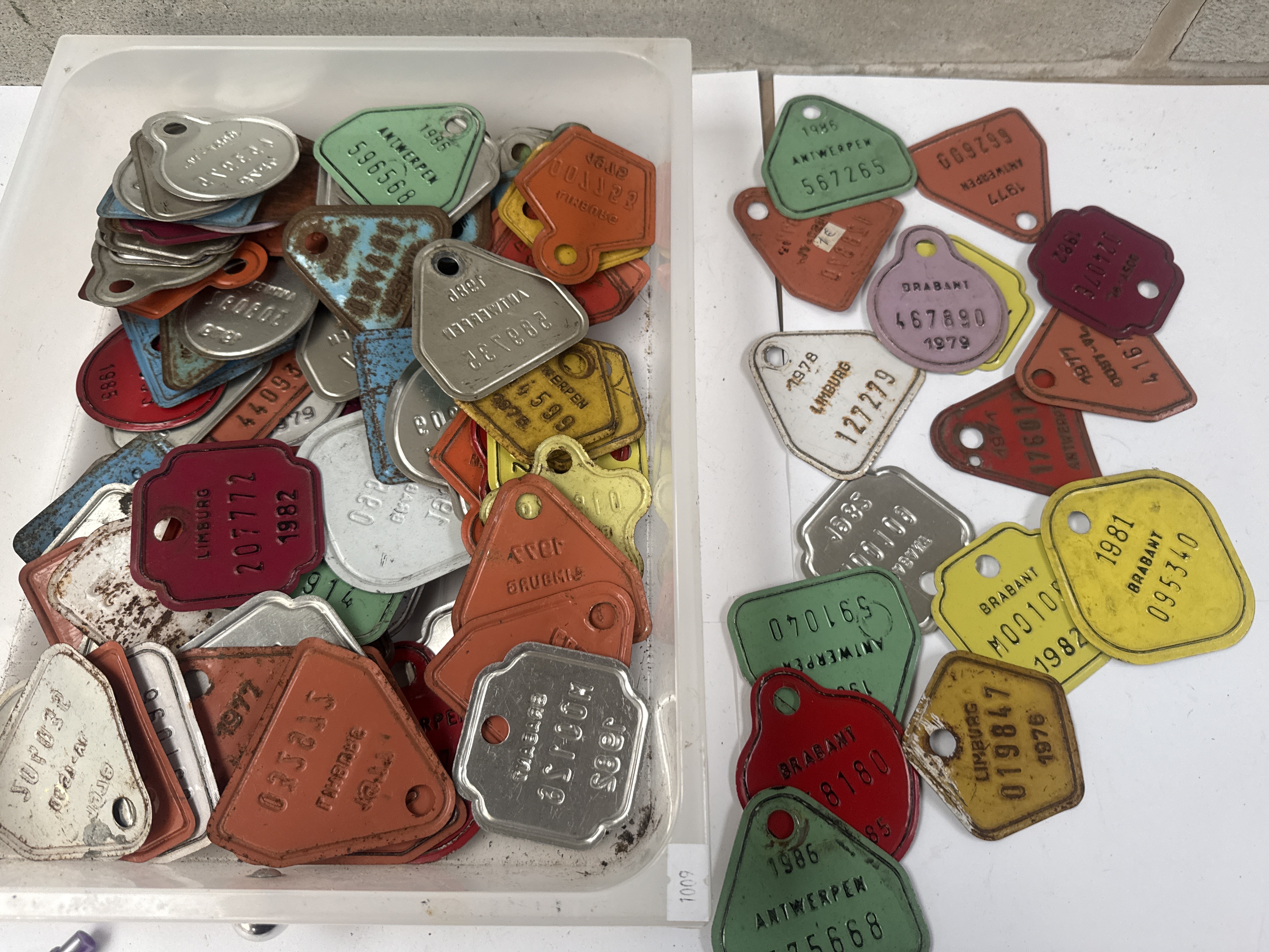 A collection of vintage Belgian provincial tax license tags. These tags, typically used for dog registration or municipal tax identification, are constructed from enameled or painted metal, likely aluminum or steel. The collection features a variety of shapes including hearts, shields, pentagons, and star-bursts, in bright colors such as red, green, yellow, silver, and purple. Each tag is embossed with identifying text indicating regional Belgian provinces, including BRABANT, ANTWERPEN, and LIMBURG, along with serial numbers and visible dates spanning the mid-1970s through the early 1990s. The tags show typical characteristics of vintage license tags identified in market research.