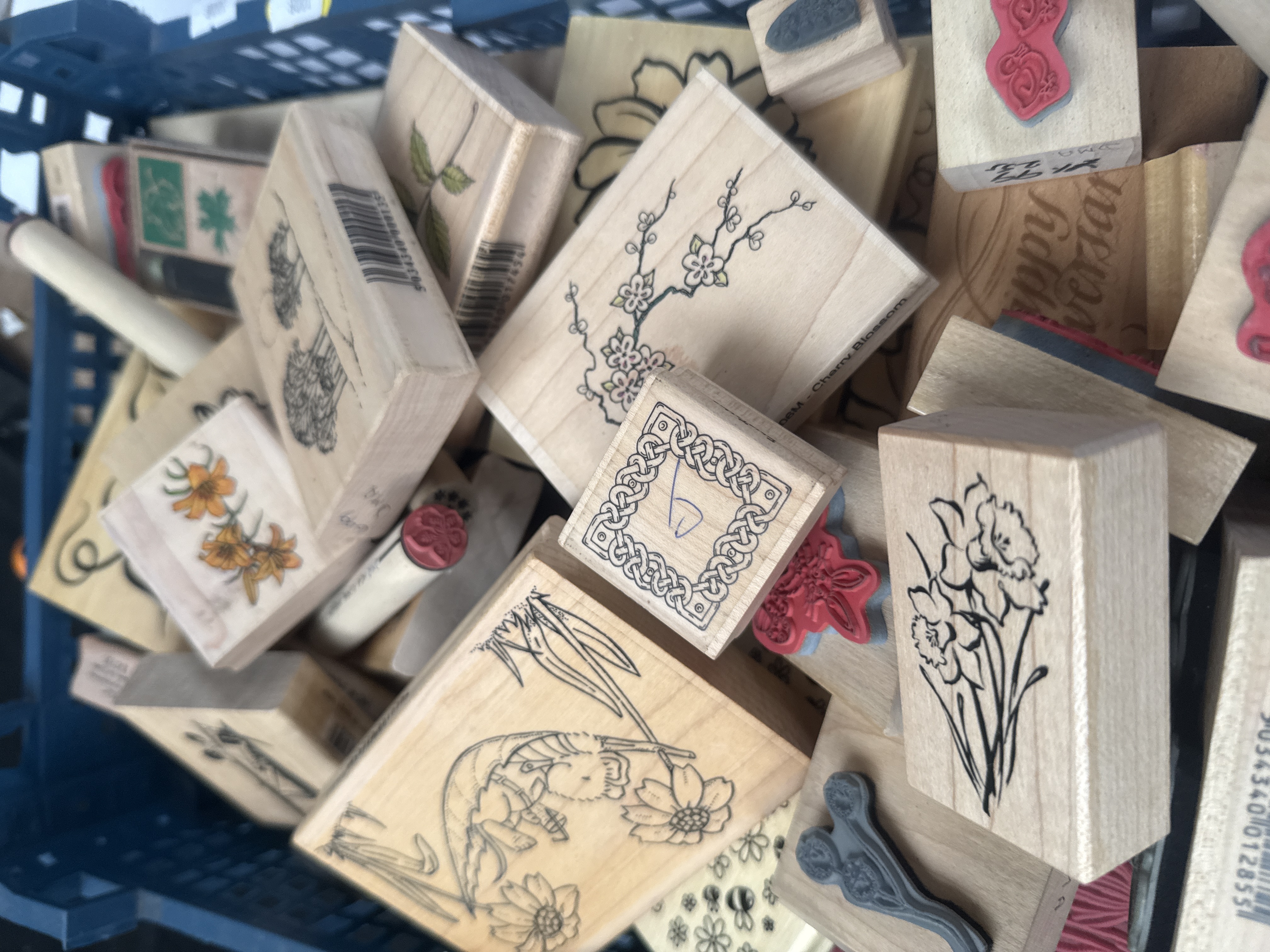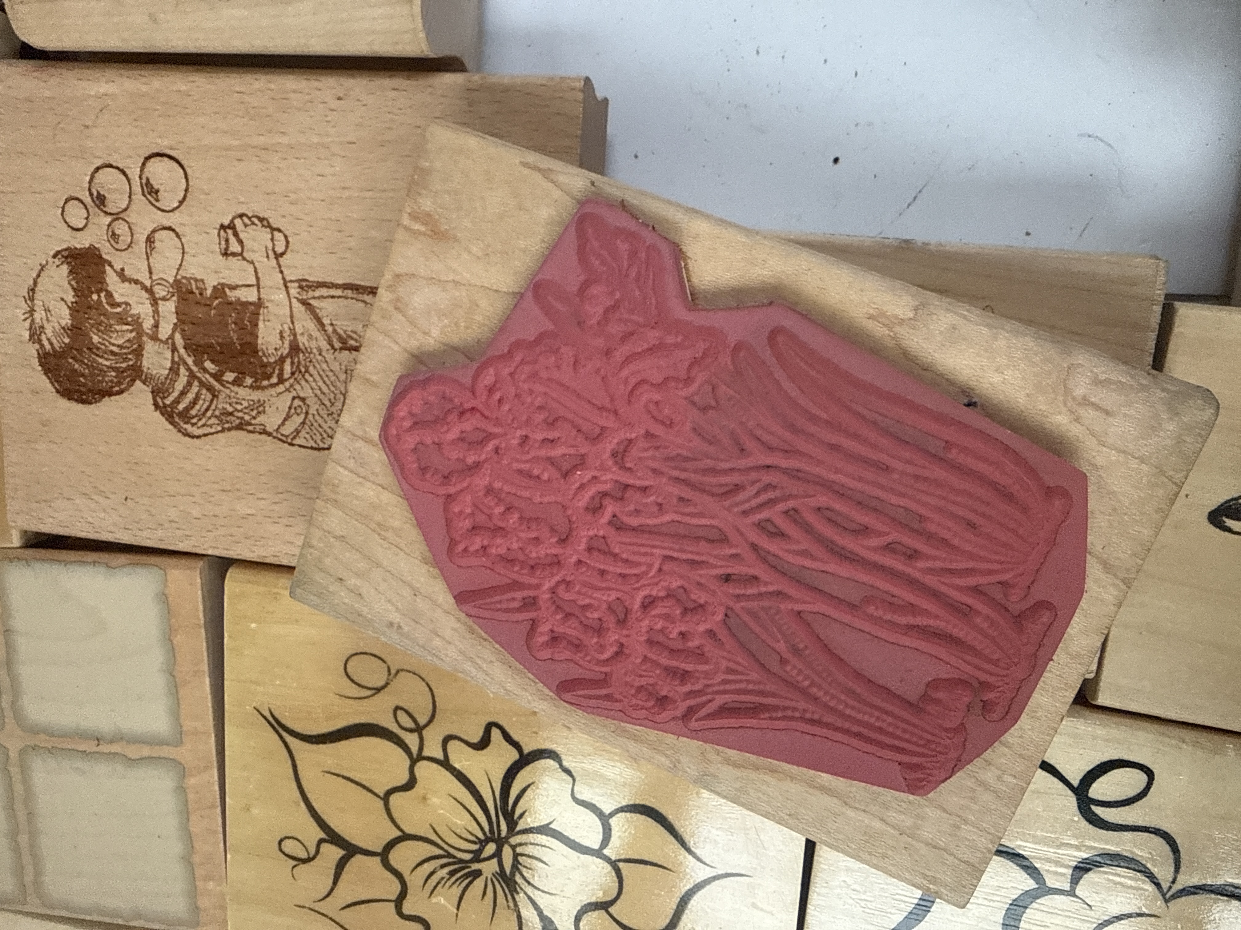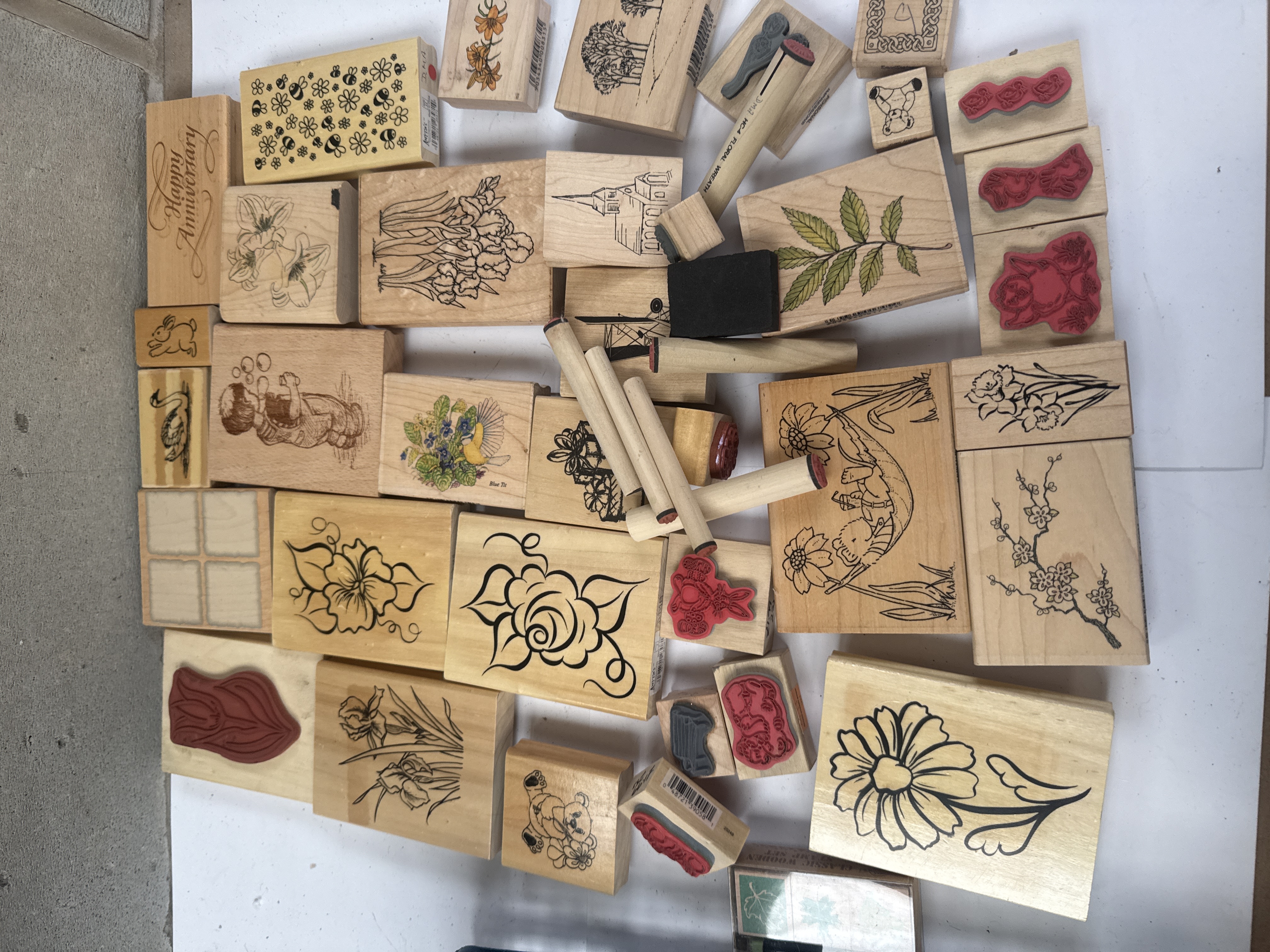 A collection of assorted rubber stamps mounted predominantly on light-toned wooden blocks, intended for arts and crafting purposes. The stamping material is comprised of red, gray, and black rubber or polymer. The subjects are highly varied, encompassing illustrative line art and figurative designs. Specific designs include numerous floral patterns such as roses, lilies, and cherry blossoms, various nature scenes including trees and leaves, and figurative designs depicting a child blowing bubbles and an animal sleeping in a hammock. One block contains the text “Happy Anniversary.” Several of the wooden blocks display printed product codes or barcodes on the wooden sides, consistent with contemporary manufacture.