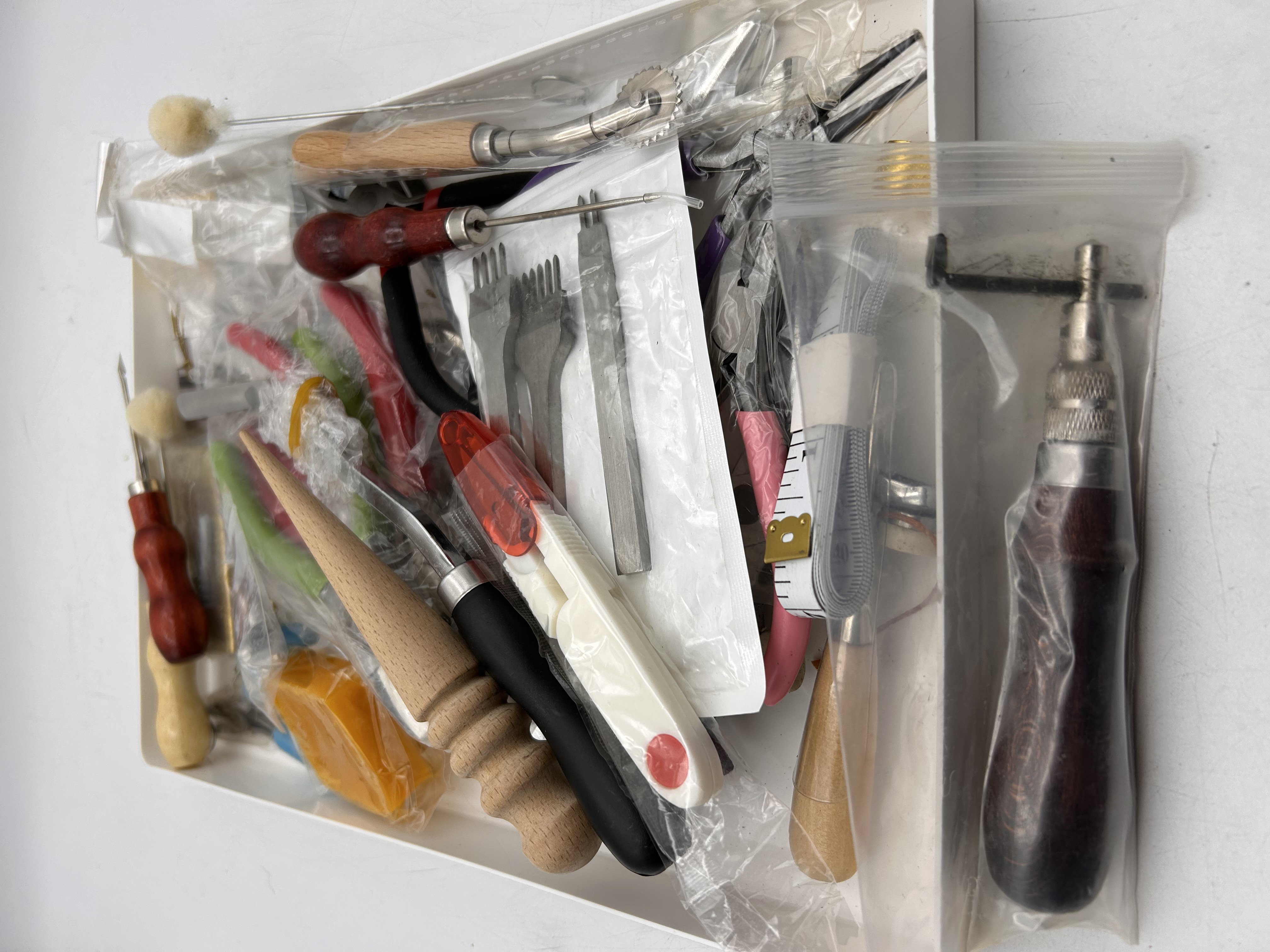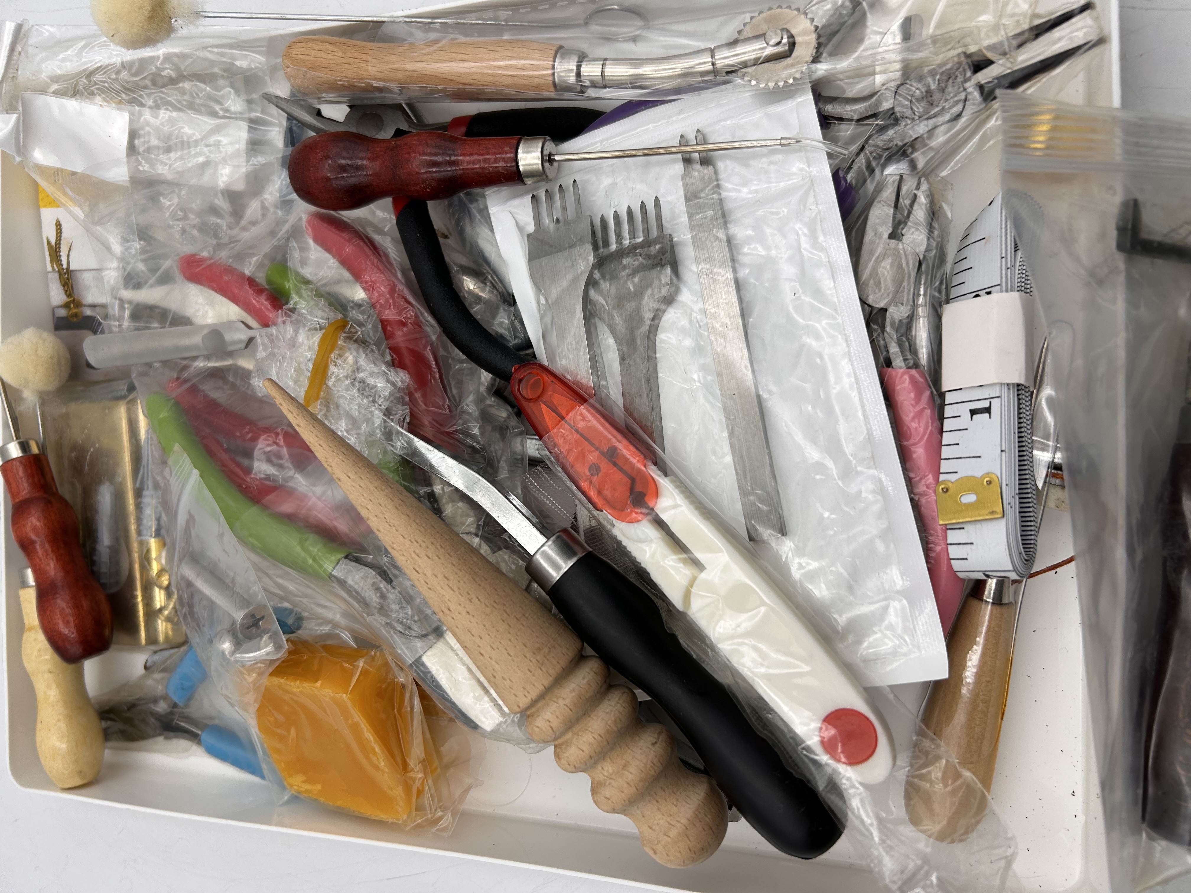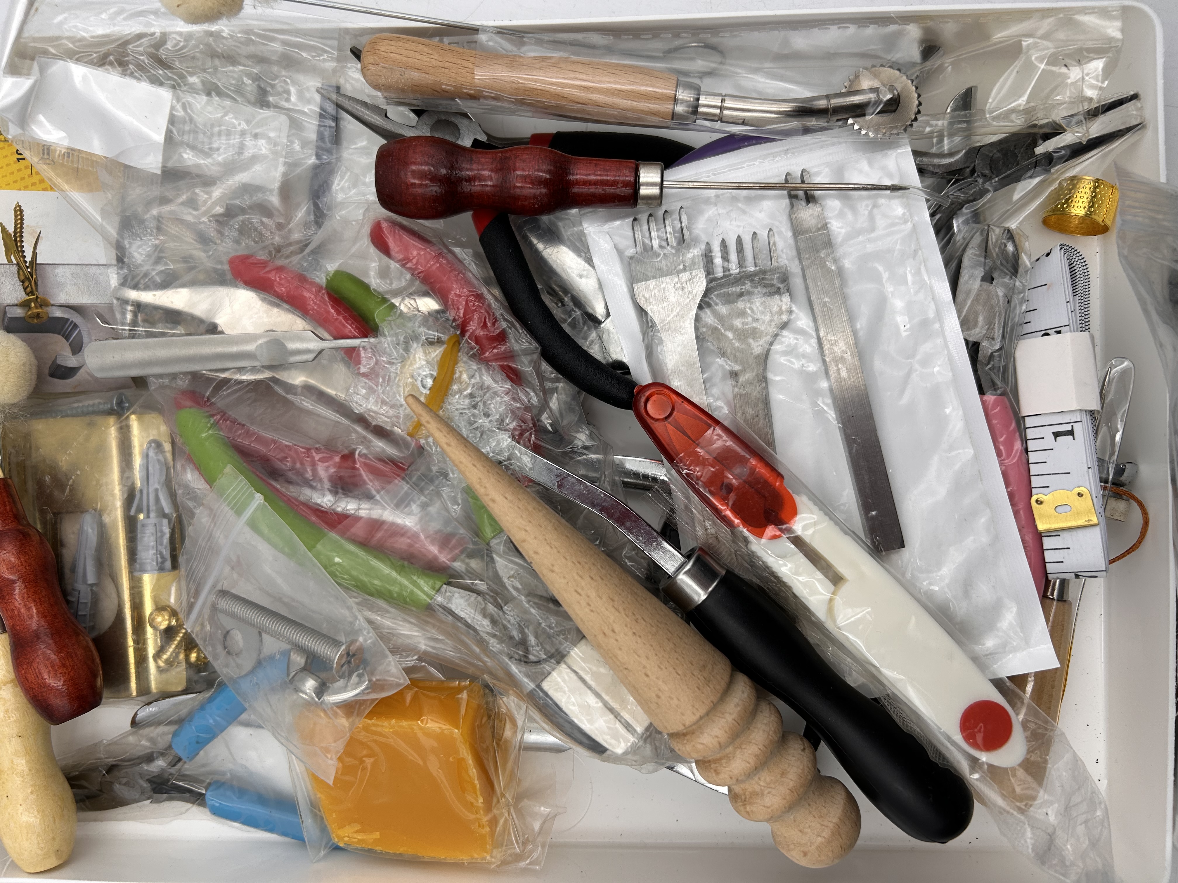 A collection of distinct modern leather working, crafting, and utility tools and accessories. The lot is identified as a starter or supply kit based on market comparisons. Items are presented haphazardly within a white storage tray and include various hand tools such as awls, leather skivers, creasers, pricking irons (forks), small pliers, a utility cutting tool, a wooden burnisher, and a block of conditioning wax (yellow/orange). Materials used include steel, brass-tone metal, natural wood, stained wood (red/brown), and various plastics (black, white, red, green). The collection also includes a fabric measuring tape and a metal thimble. The majority of the items remain individually sealed in clear plastic packaging.