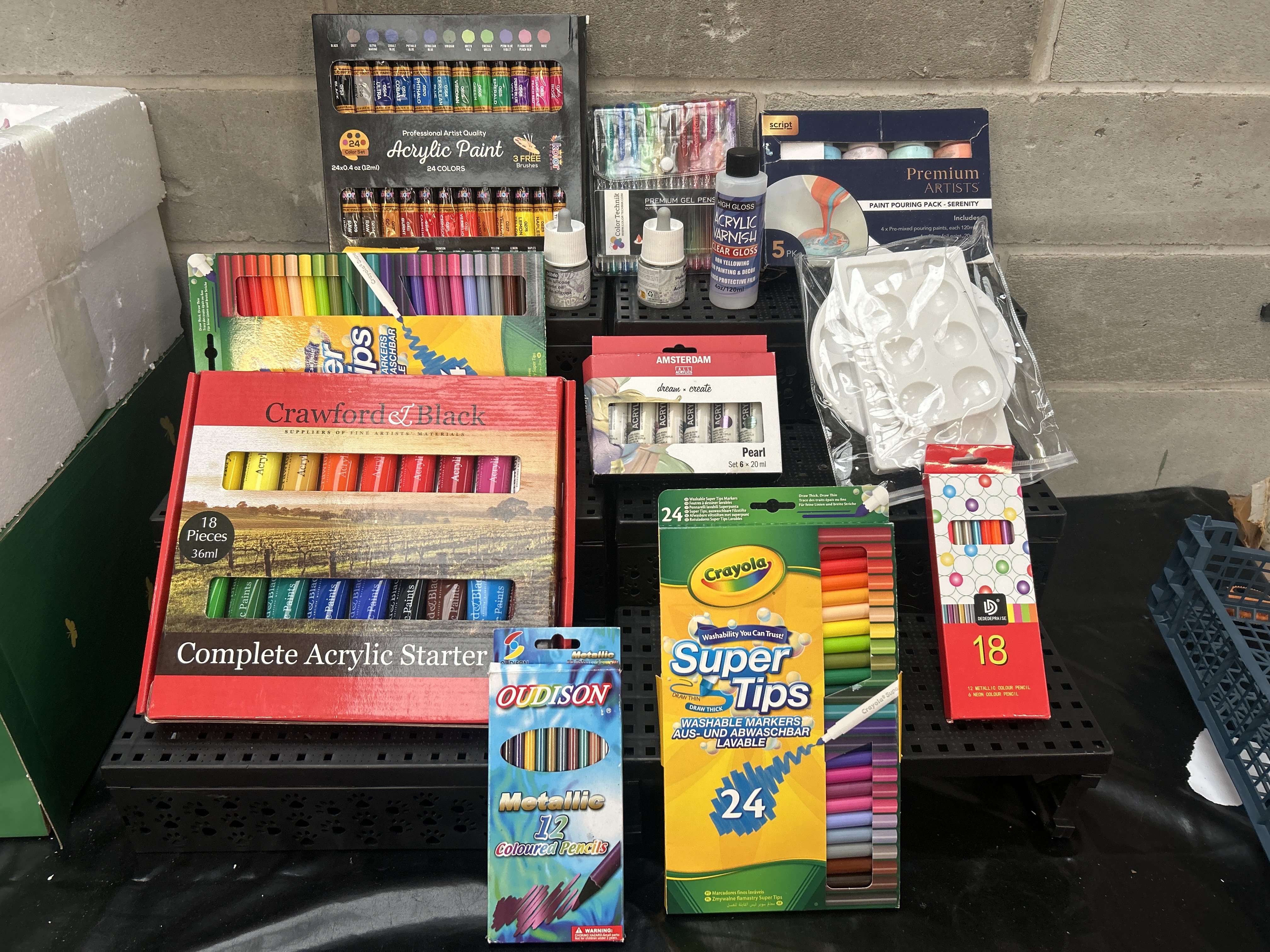 A collection of new, packaged art supply sets, primarily focused on acrylic painting and drawing implements. The lot includes several acrylic painting components, notably the Crawford & Black 18-Piece Complete Acrylic Starter kit, a Kolor Professional Artist Quality 24-Color Acrylic Paint set, and an Amsterdam All Acrylics Pearl Set (6 x 20ml). Specialty painting supplies include a Script Premium Artists Paint Pouring Pack (5 PK), a large bottle of High Gloss Acrylic Varnish (4 oz/120ml), a small dropper bottle of Pebeo silicone oil, and a clear plastic multi-well paint palette. Drawing and coloring materials comprise two boxes of Crayola Super Tips Washable Markers (one labeled 24 count), an OUDISON Metallic 12 Coloured Pencils set, a DEDEDEPRAISE 18 Metallic & Neon Colour Pencils set, and a package of Color Technik Premium Glitter Gel Pens. All items are presented in their original cardstock or plastic retail packaging.