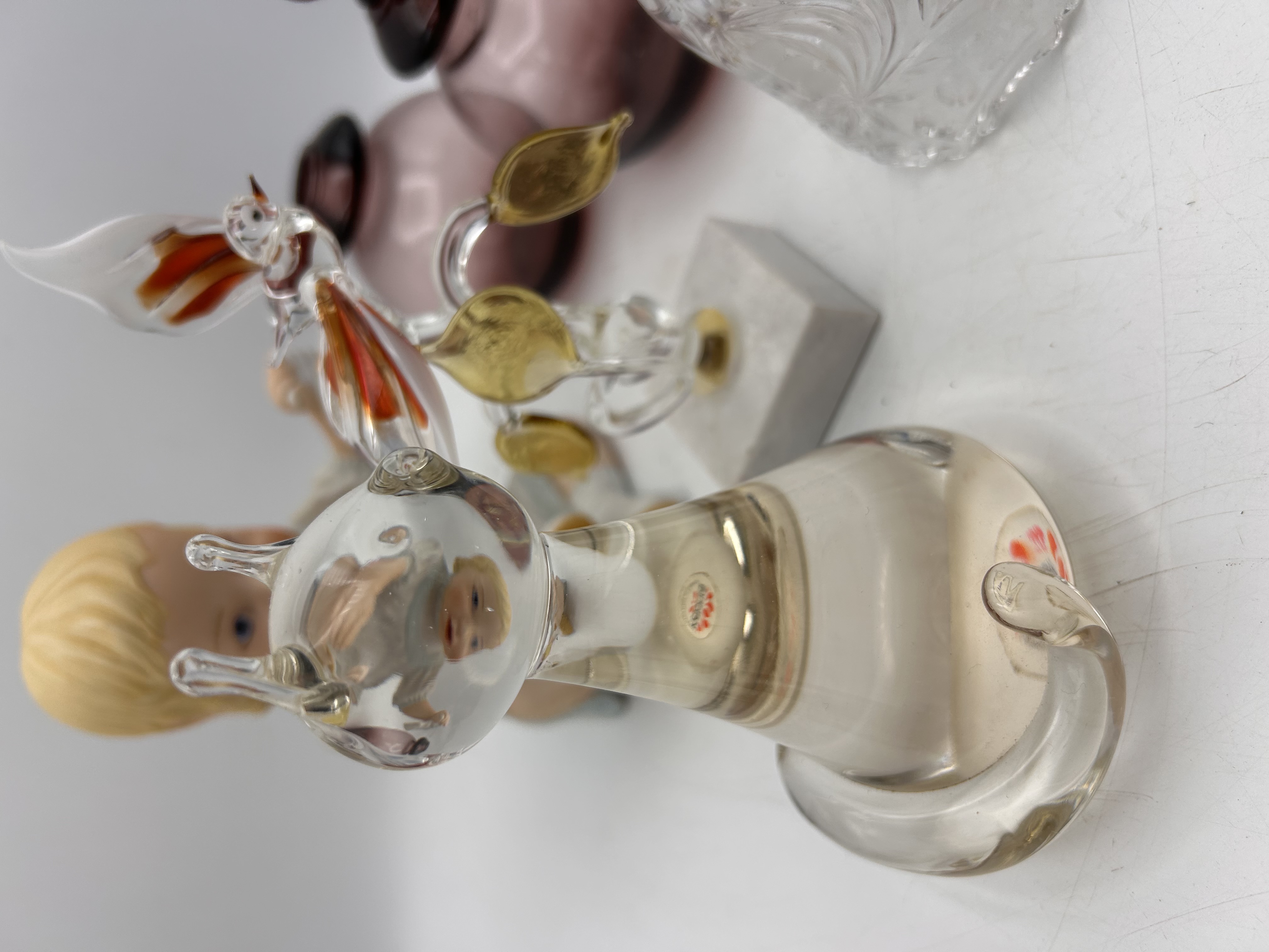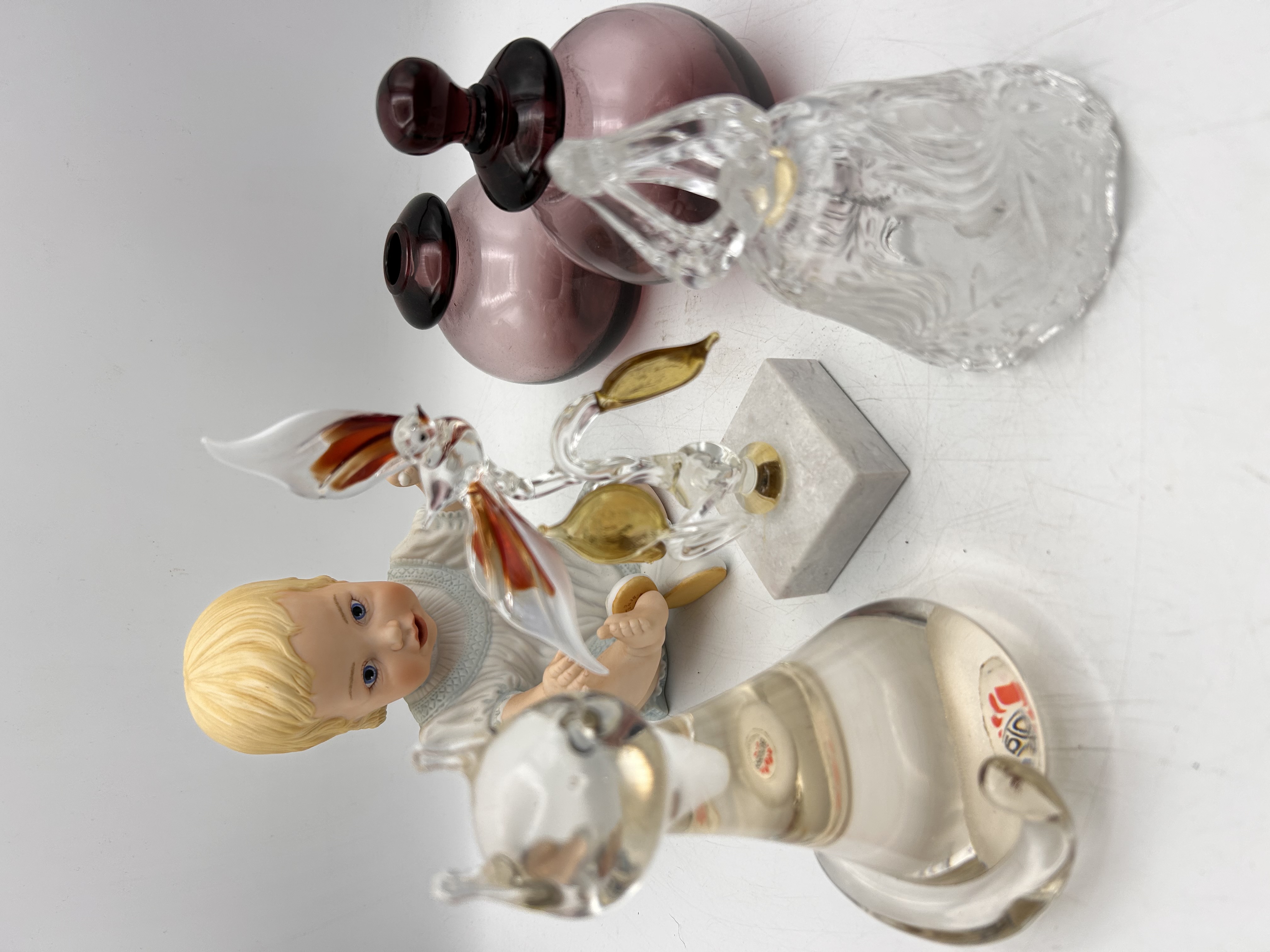 This collection consists of six mixed decorative objects. The lot includes a seated porcelain baby doll figurine with painted blonde hair and blue eyes, wearing a white garment. There are two lampworked clear glass figurines: a stylized cat paperweight, which bears an unreadable foil sticker visible near the base, and a bird/flower sculpture featuring red and gold glass accents, mounted securely on a square gray marble base. Also included is one clear molded glass bell with relief decoration, and a pair of matching globular scent bottles crafted from translucent mauve or amethyst colored glass, each fitted with a solid dark glass stopper.