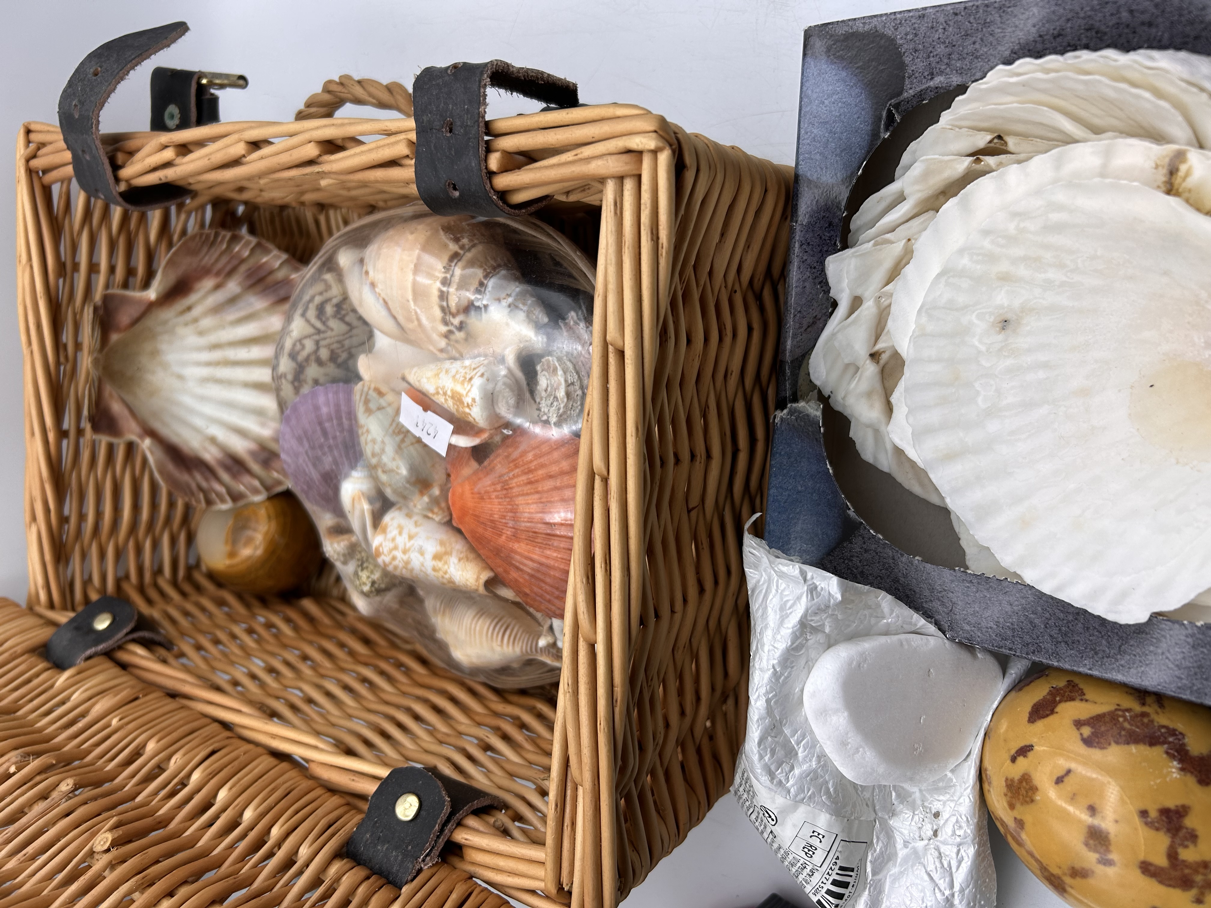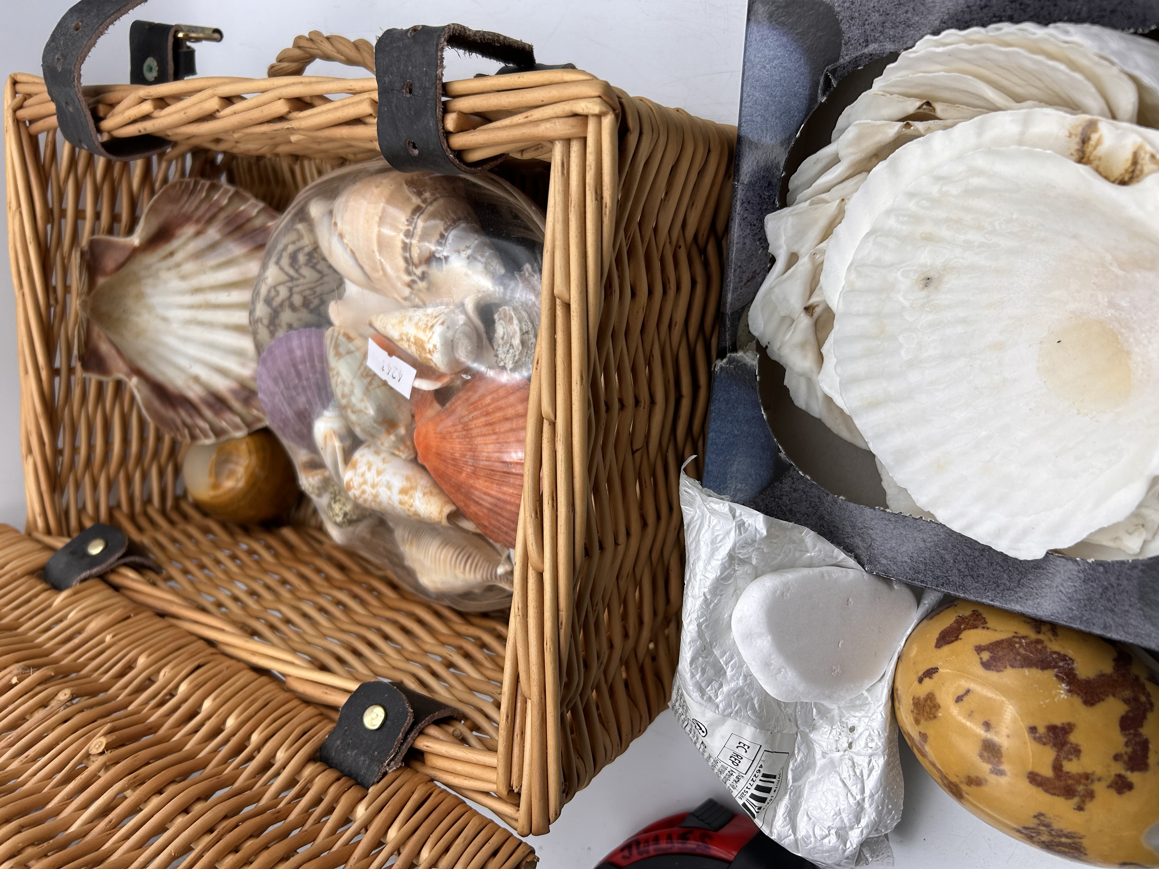 A collection comprising distinct lots or items centered around natural seashells and decorative specimens. The primary container is a modern woven wicker picnic-style hamper secured with dark leather strap closures. Contents of the hamper include one large, ribbed scallop shell featuring natural cream and brown tones; one polished brown banded ovoid stone; and one clear plastic bag containing numerous assorted smaller shells, including cone, conch, and varied scallop types, in colors ranging from speckled white to deep orange and purple. The bag bears a handwritten inventory sticker reading 1251. Items outside the basket include a large, polished yellow and brown spotted ovoid object, a piece of crinkled silver foil packaging, a small white chalky fragment, and a separate lot comprising several large white scallop shells piled within a dark tray. The collection is consistent with items marketed for beach home decor or crafting purposes.