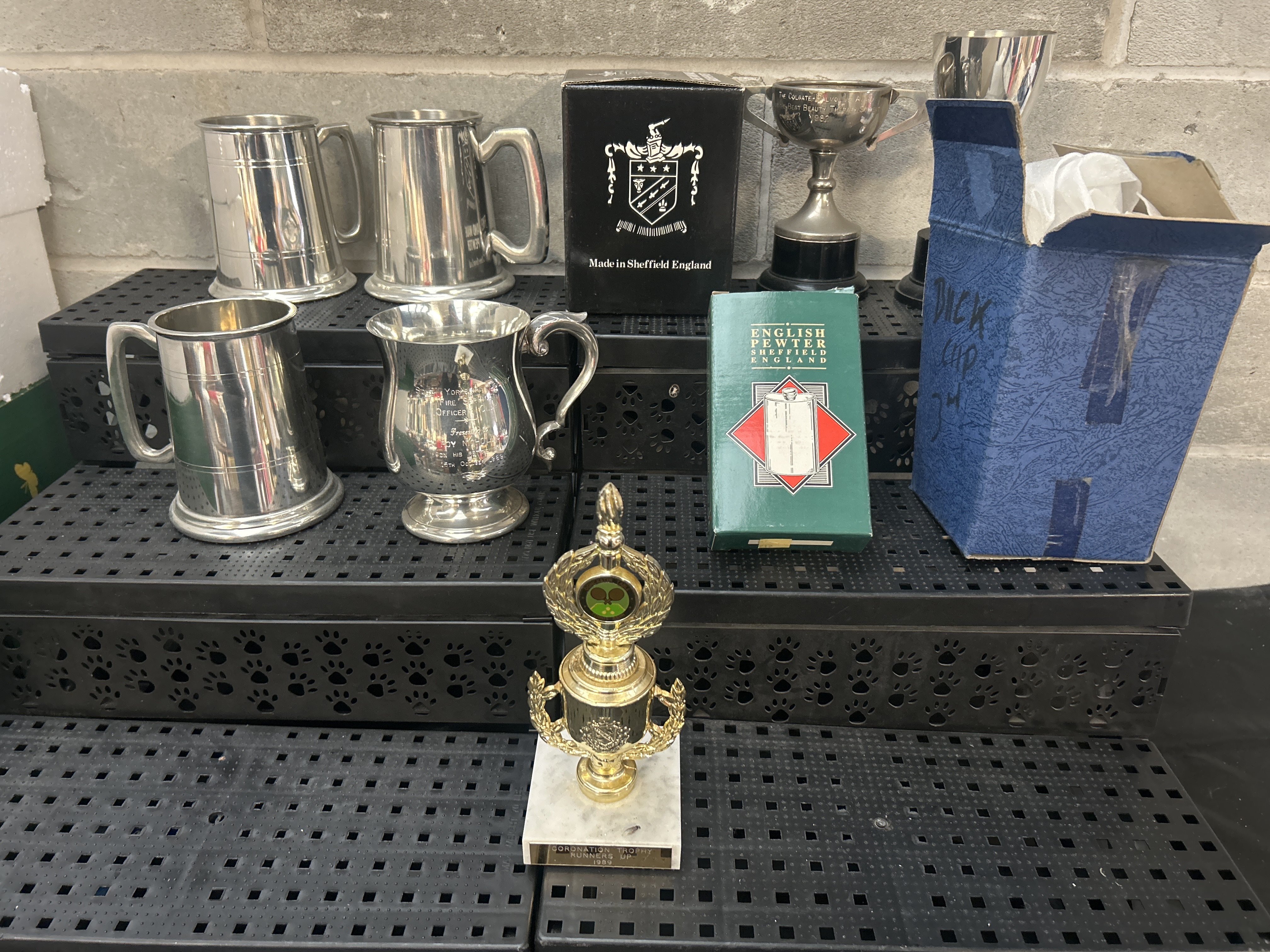 A collection of presentation metalwares, likely dating from the 1980s, comprising seven trophies and tankards, and three pieces of associated packaging. The metal items are silver-toned, suggesting pewter or plated construction, with one smaller trophy being gilt. The collection includes five handled mugs or tankards (three straight-sided, one curved pedestal cup, and one small plain straight cup), and two additional two-handled trophy cups. Notable pieces include a two-handled trophy cup inscribed “The Colgate-Palmo… Best Beauty Therapy Segment 1982,” a curved handled cup dated 15th October 1988, and a small gilt trophy with a green cabochon detail, mounted on a white marble plinth, inscribed “Coronation Trophy Runners Up 1989.” The packaging includes a black box labeled “Made in Sheffield England” and a green box labeled “English Pewter Sheffield England,” indicating potential origin and material for some pieces.