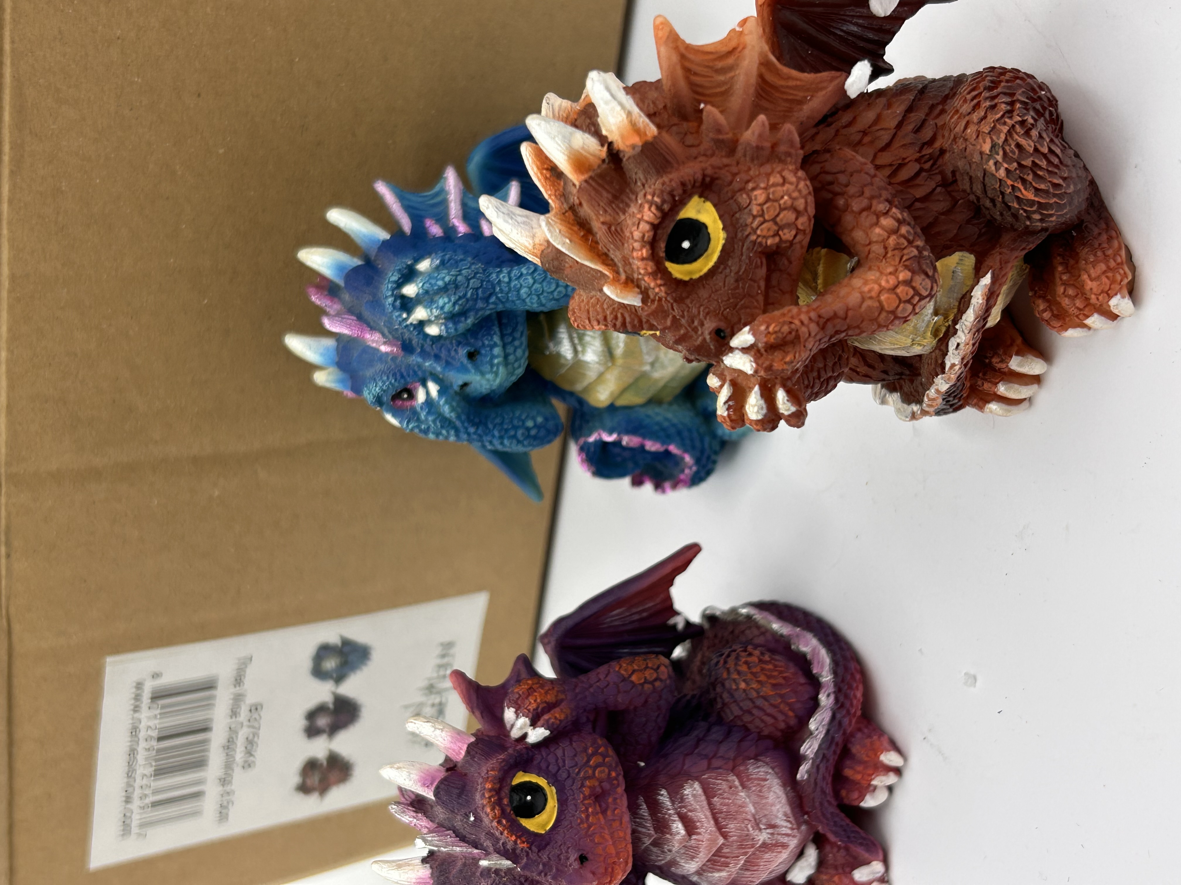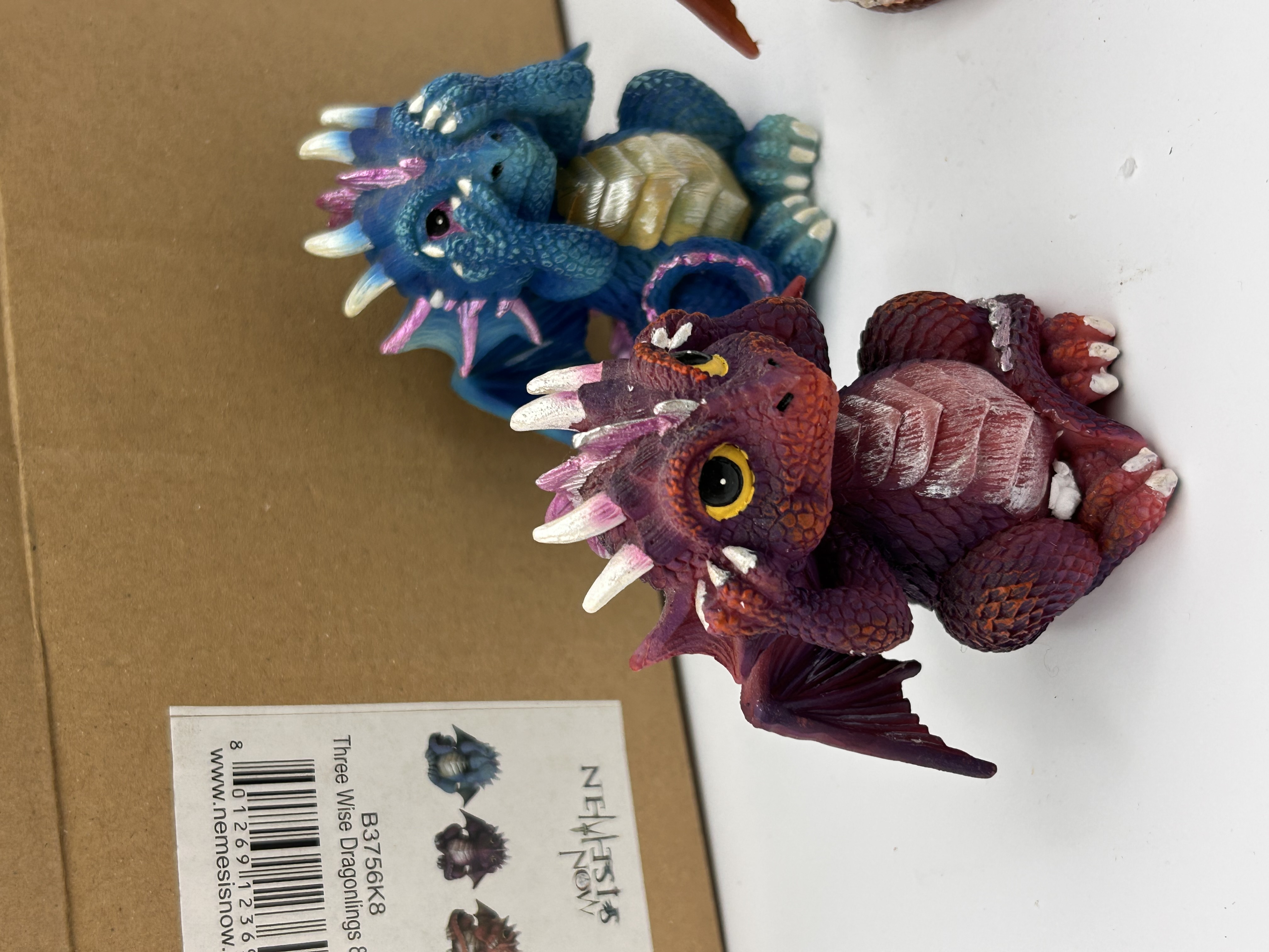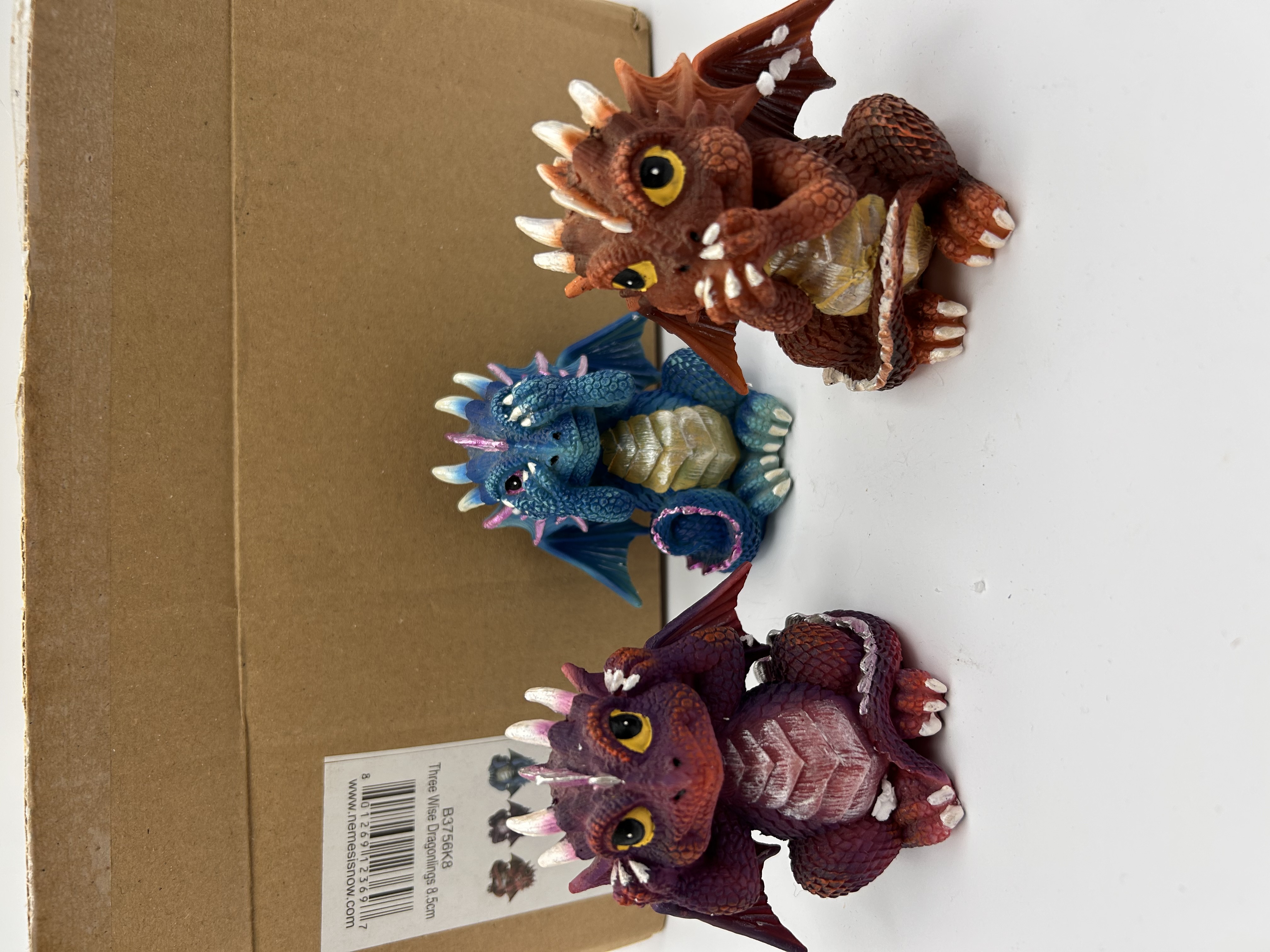 A set of three contemporary polyresin figurines by Nemesis Now, known as the ‘Three Wise Dragonlings’. The set depicts the traditional ‘Hear No Evil, See No Evil, Speak No Evil’ concept using brightly colored fantasy dragon figures. The figures are individually painted in vibrant hues: one purple/maroon figure covers its ears, one teal/blue figure covers its eyes, and one reddish-brown/orange figure covers its mouth. The lot includes the original plain cardboard product box, which bears a label identifying the set as “B3756K8 Three Wise Dragonlings 8.5cm” and features the Nemesis Now branding.