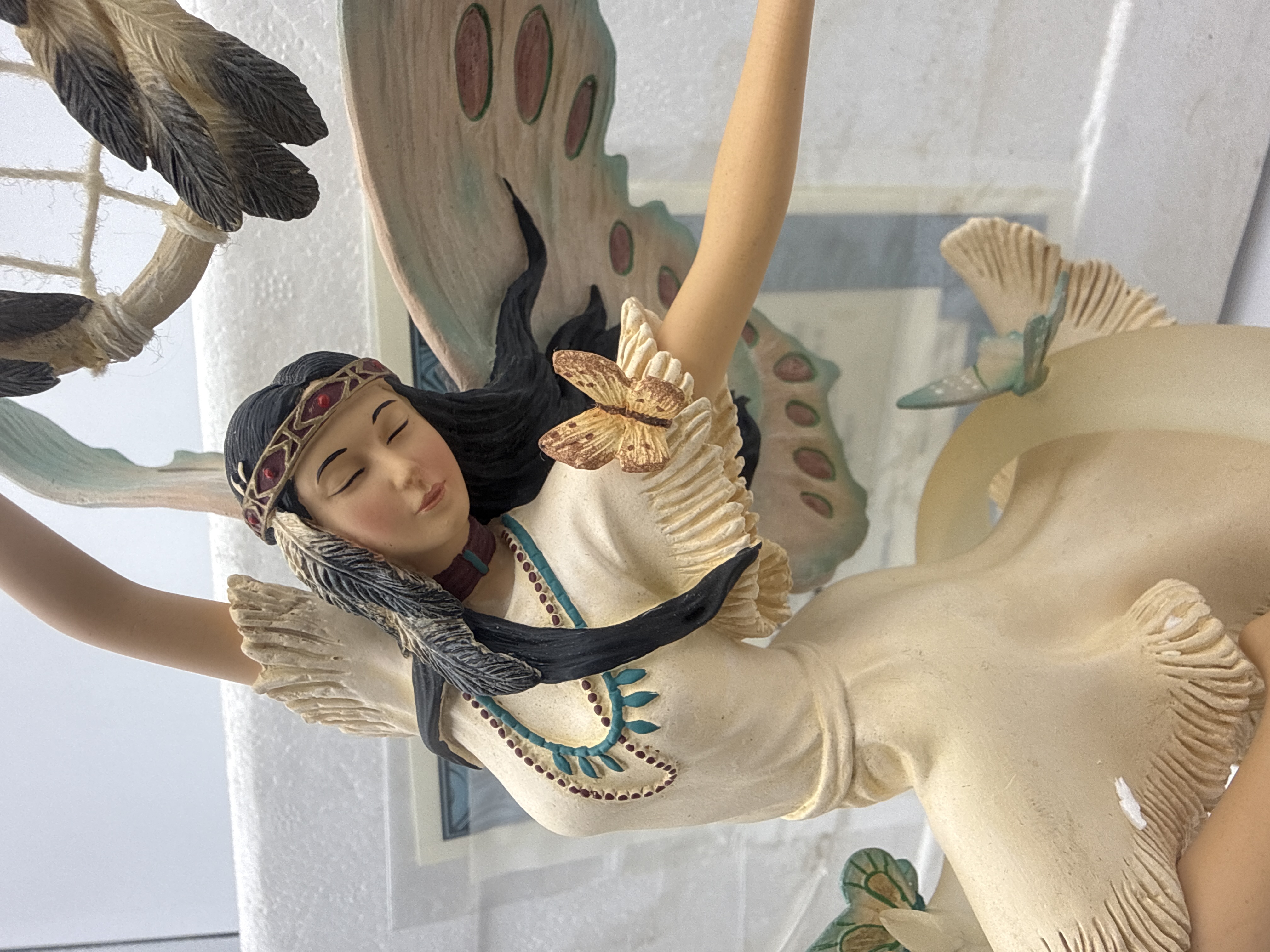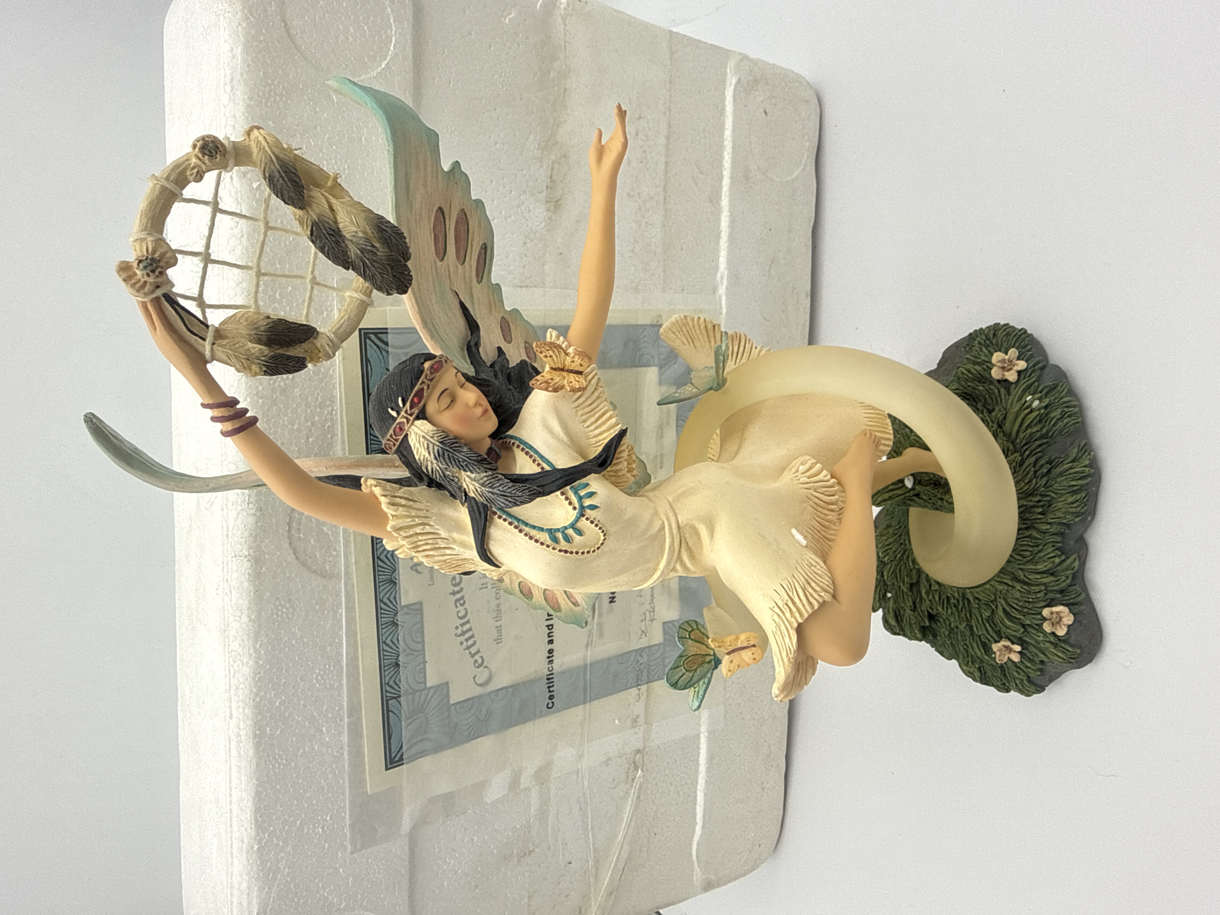 A collectible figural sculpture attributed to Ebros Gift, identified in the market as a Native American Indian Fairy figure. The piece is likely cast in hand-painted cold-cast porcelain or resin. The single figure is depicted in a dynamic, stylized pose, balancing on one knee atop a sculpted green base adorned with flowers and butterflies. The figure wears a cream-colored fringed dress, beaded jewelry, and a red headband. She features large, pastel-colored wings (mint green and brown) and holds a miniature feathered dream catcher aloft in her extended arms. This item comes with its certificate and information, and is accompanied by its original white Styrofoam packaging.