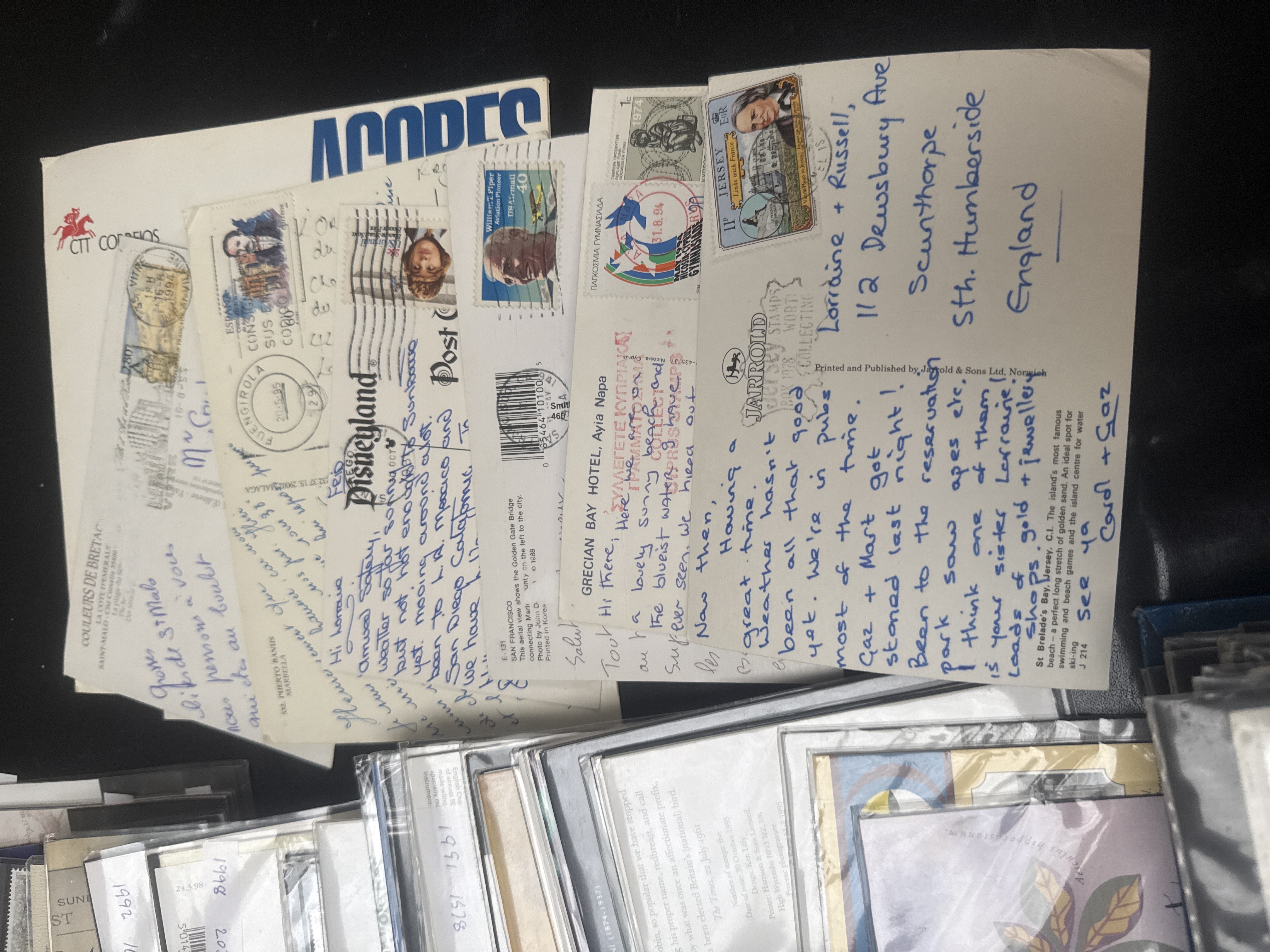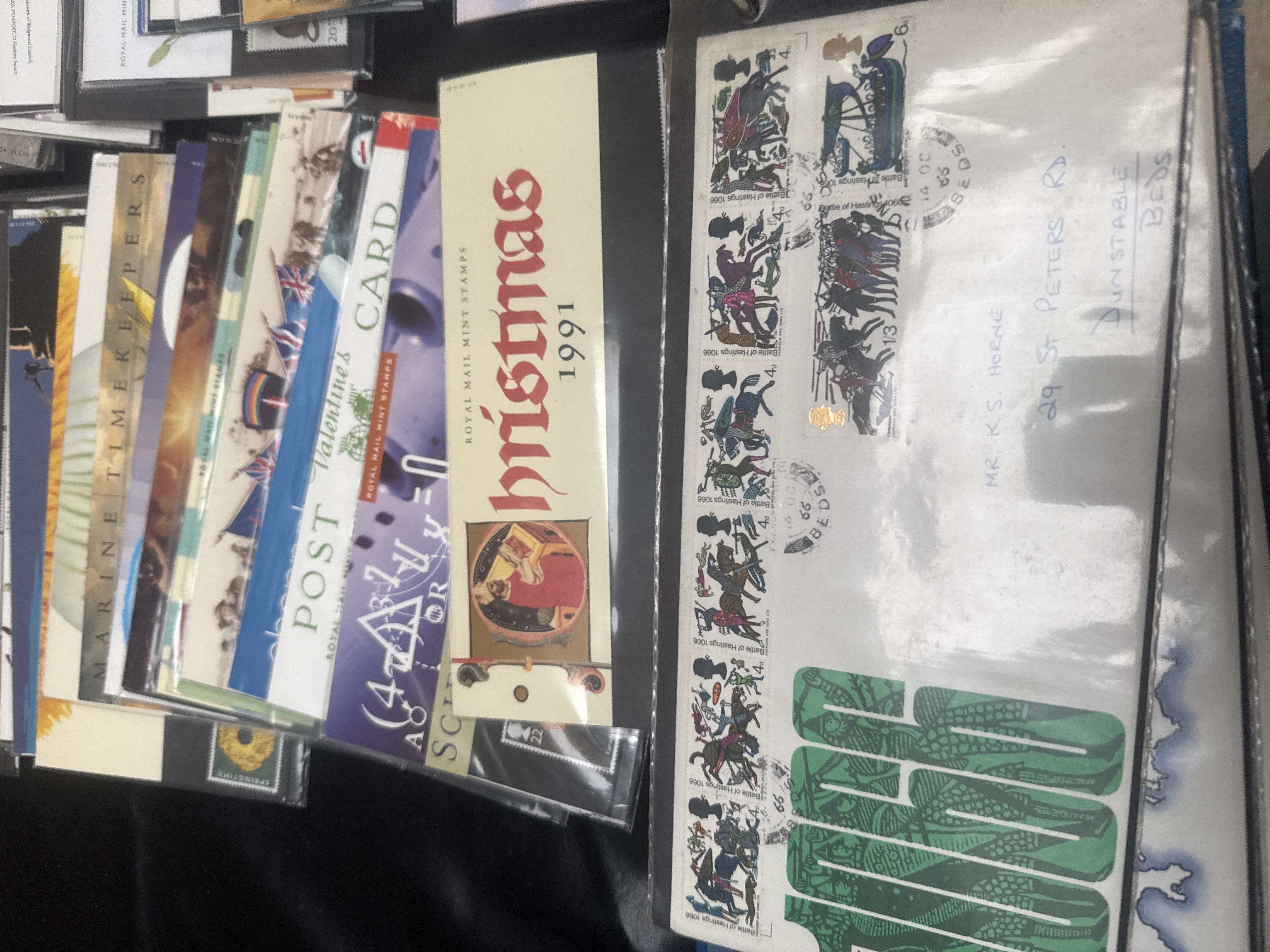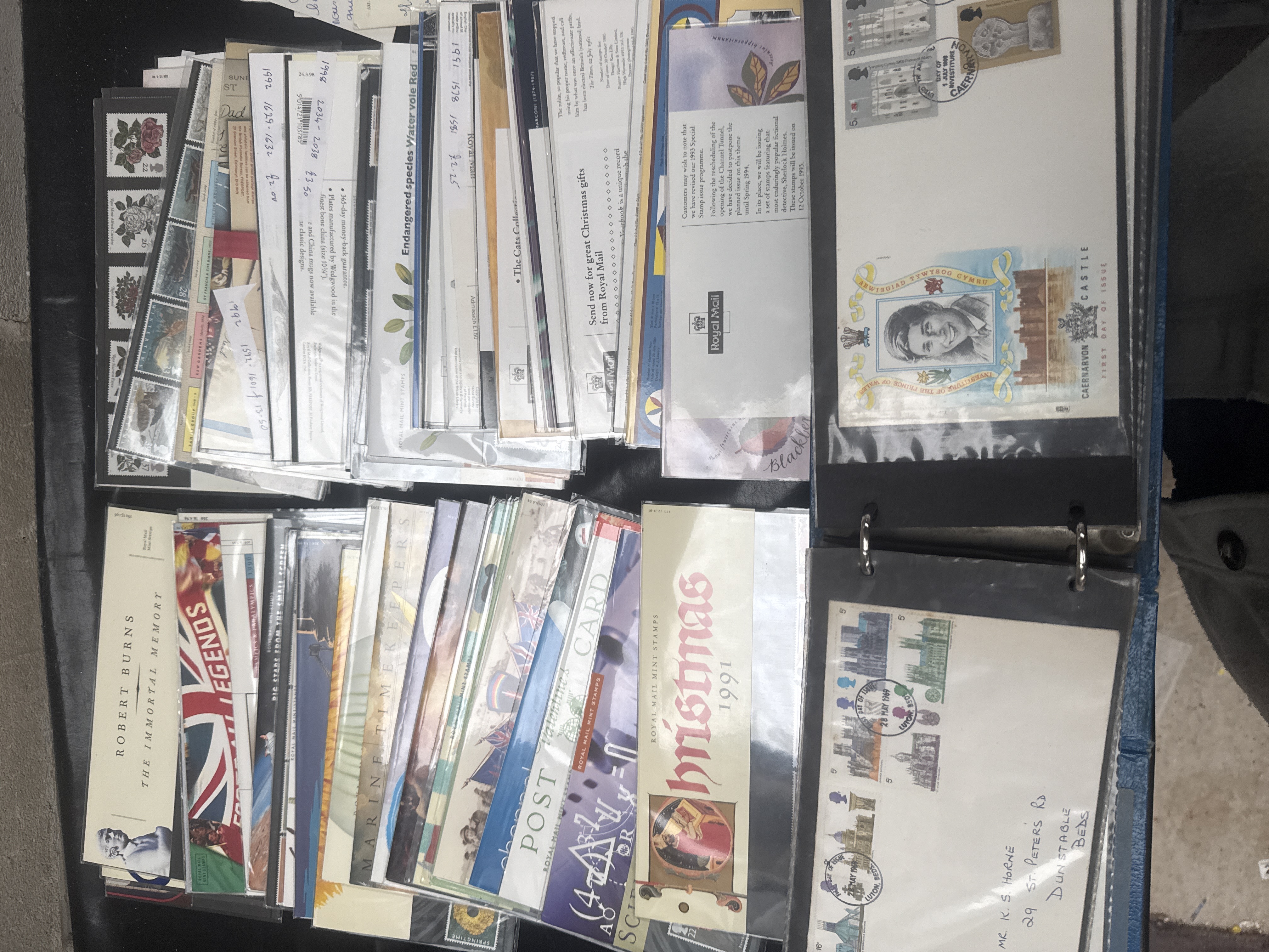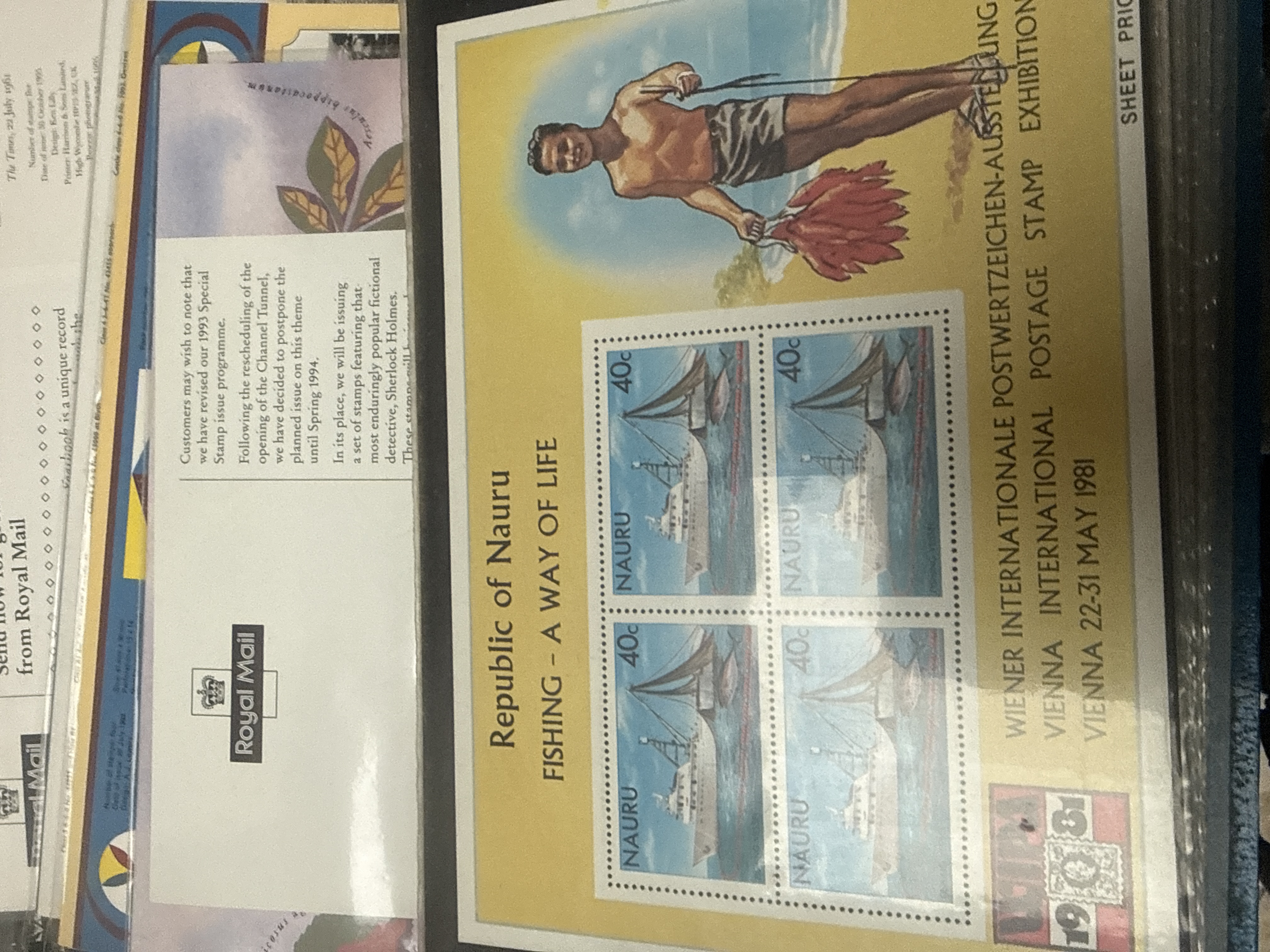 A philatelic collection comprising various late 20th-century Royal Mail mint stamp presentation packs, first day covers, and souvenir sheets, alongside international postcards. The presentation packs cover several themes including Robert Burns, Christmas 1991, Marine Timekeepers, and Endangered Species. First day covers include the 1966 Battle of Hastings series and a 1969 issue depicting Caernarvon Castle. The lot also contains a 1981 Republic of Nauru souvenir sheet issued for the WIPA Vienna international stamp exhibition. The postcards feature various international postmarks, stamps, and handwritten correspondence from the 1990s. Most items are housed in protective plastic sleeves or a ring binder.