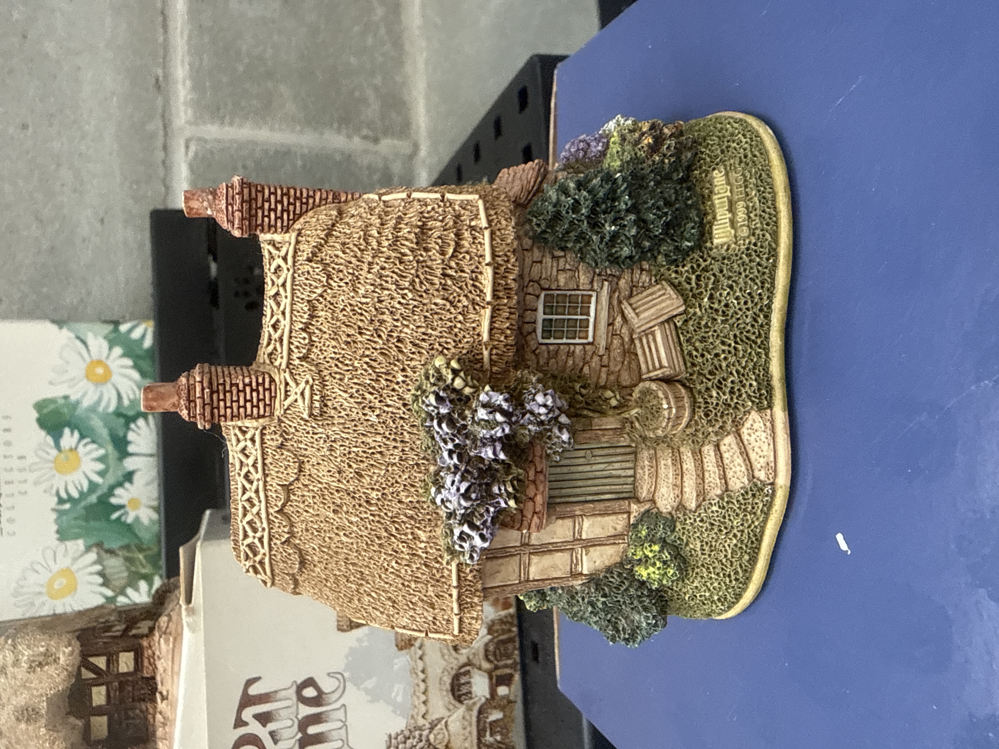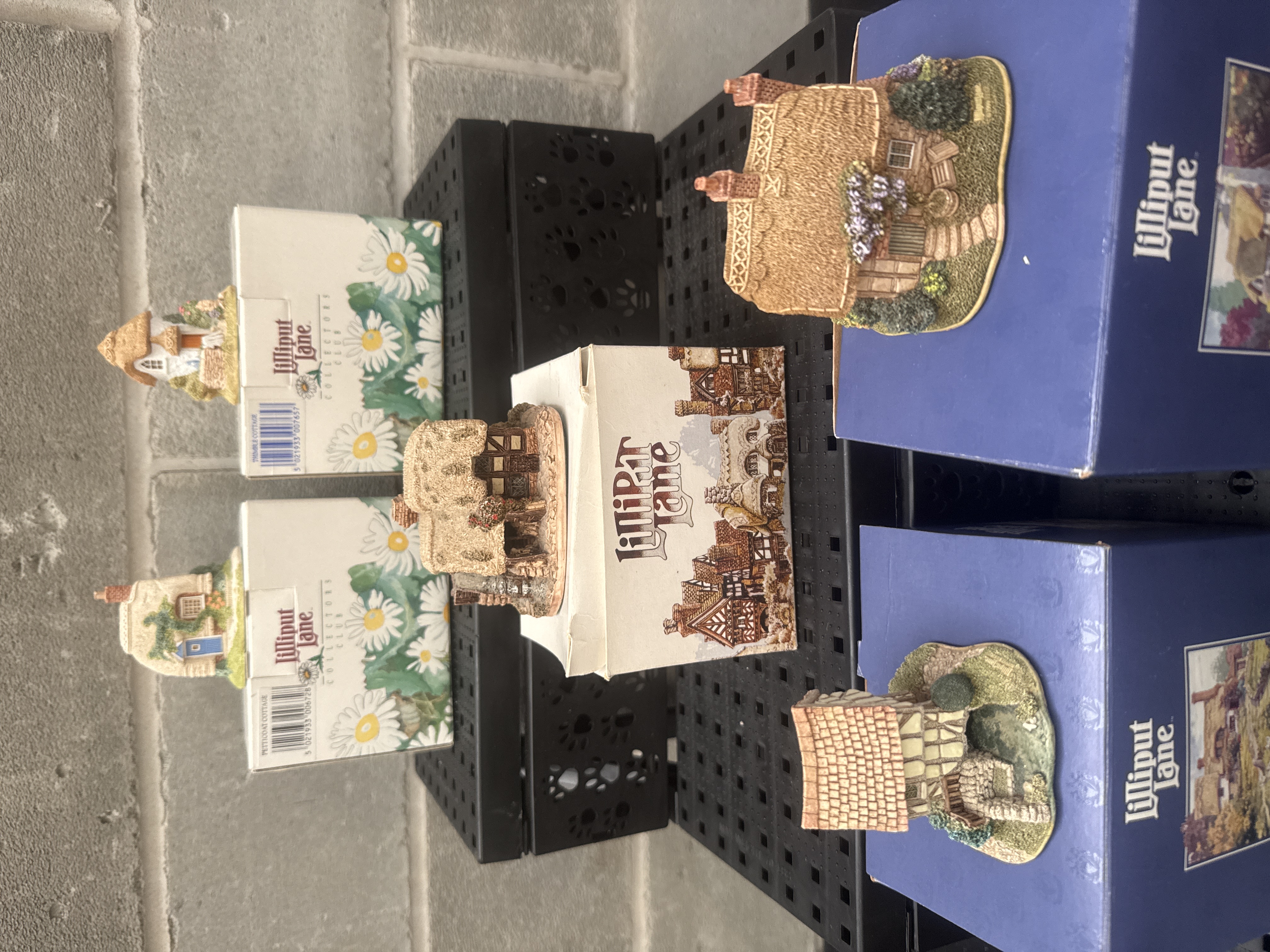 A collection of 5 Lilliput Lane miniature architectural models, including the 1999/2000 Collectors Club edition Fresh Today (L2256) and Petticoat Cottage. These hand-painted resin figurines depict traditional English vernacular architecture, featuring detailed thatched roofs, timber-framed facades, brick chimneys, and landscaped garden elements with floral accents. The collection includes pieces from the Lilliput Lane Collectors Club. Visible markings on the bases include the brand name Lilliput Lane and copyright dates such as ©1999 EEGG. The lot is accompanied by original packaging, including signature blue brand boxes and floral-patterned Collectors Club boxes.