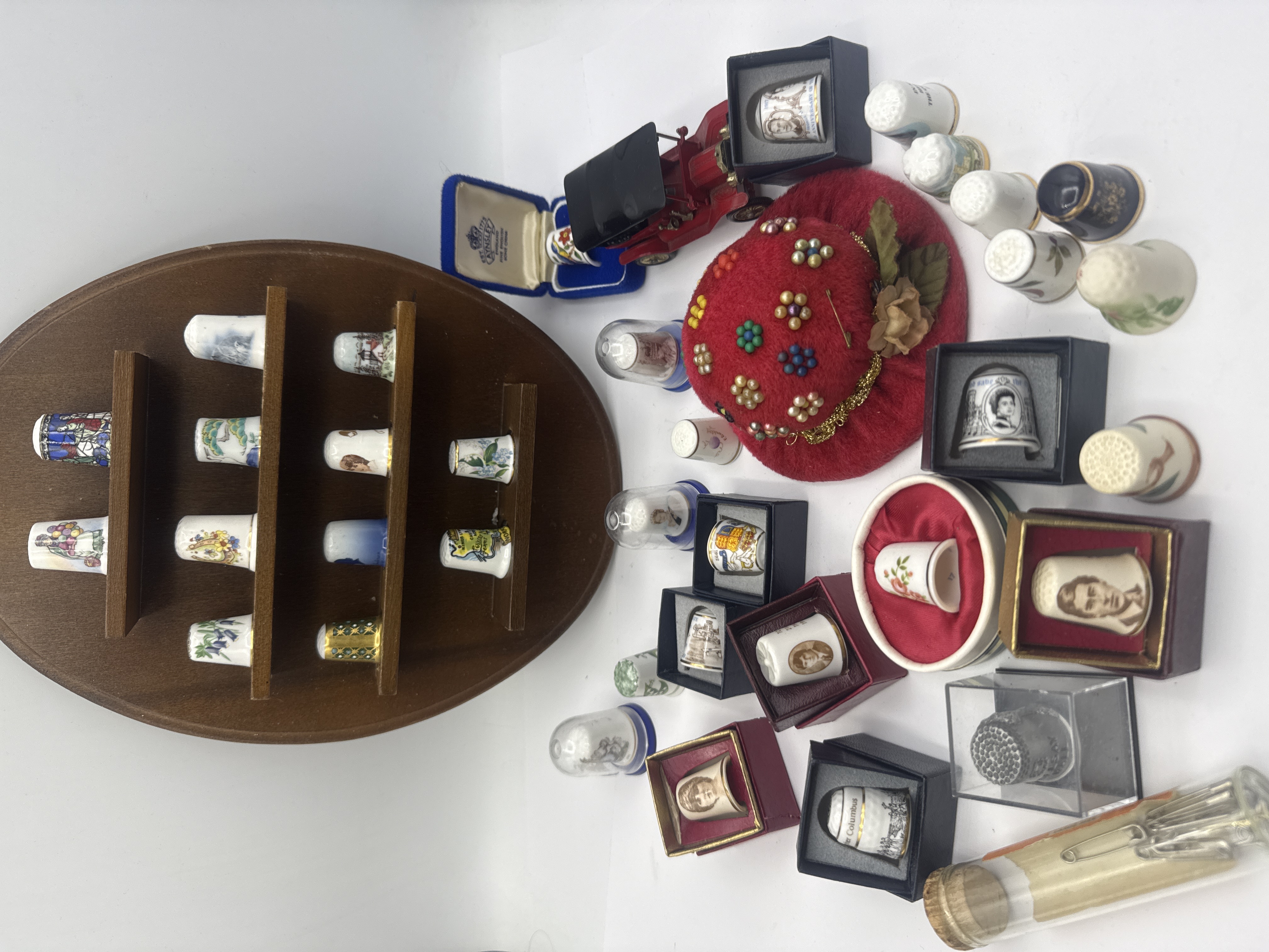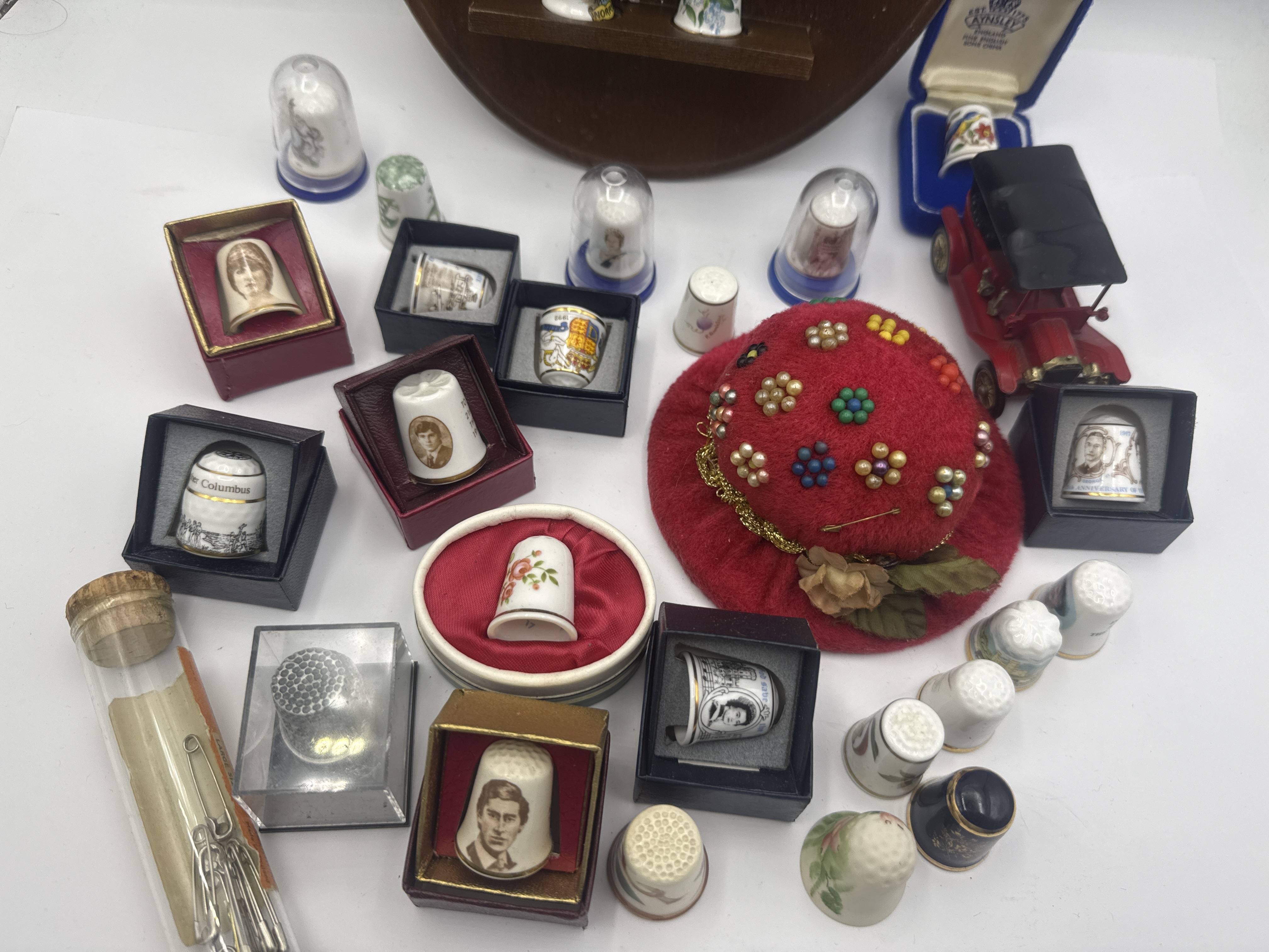 A collection of various decorative and commemorative thimbles, primarily crafted from porcelain and fine bone china. The group includes examples from makers such as Franklin Mint and Aynsley of England. Motifs featured across the collection include royal portraits of Queen Elizabeth II and Princess Diana, historical figures such as Christopher Columbus, topographical scenes of Norfolk, and various floral and geometric patterns. Several thimbles are part of the Peter Barrett 1979 bird series. The lot is accompanied by an oval wooden wall-mounted display shelf with multiple tiers. Additional accessories include a red velvet pincushion embellished with beadwork and floral details, a miniature red vintage-style automobile, and a glass tube containing metal pins. Several thimbles are housed in original presentation boxes or protective acrylic domes.
