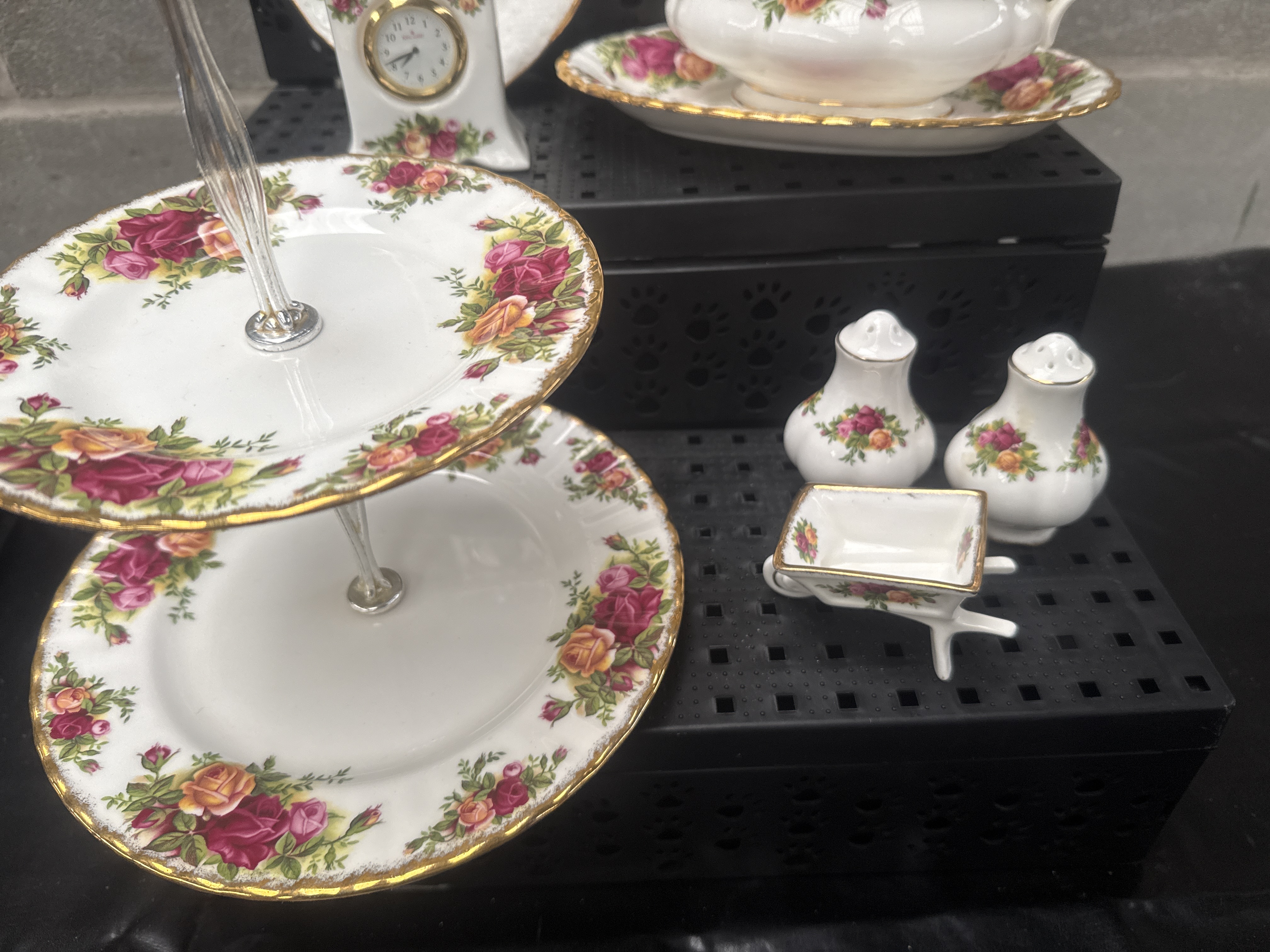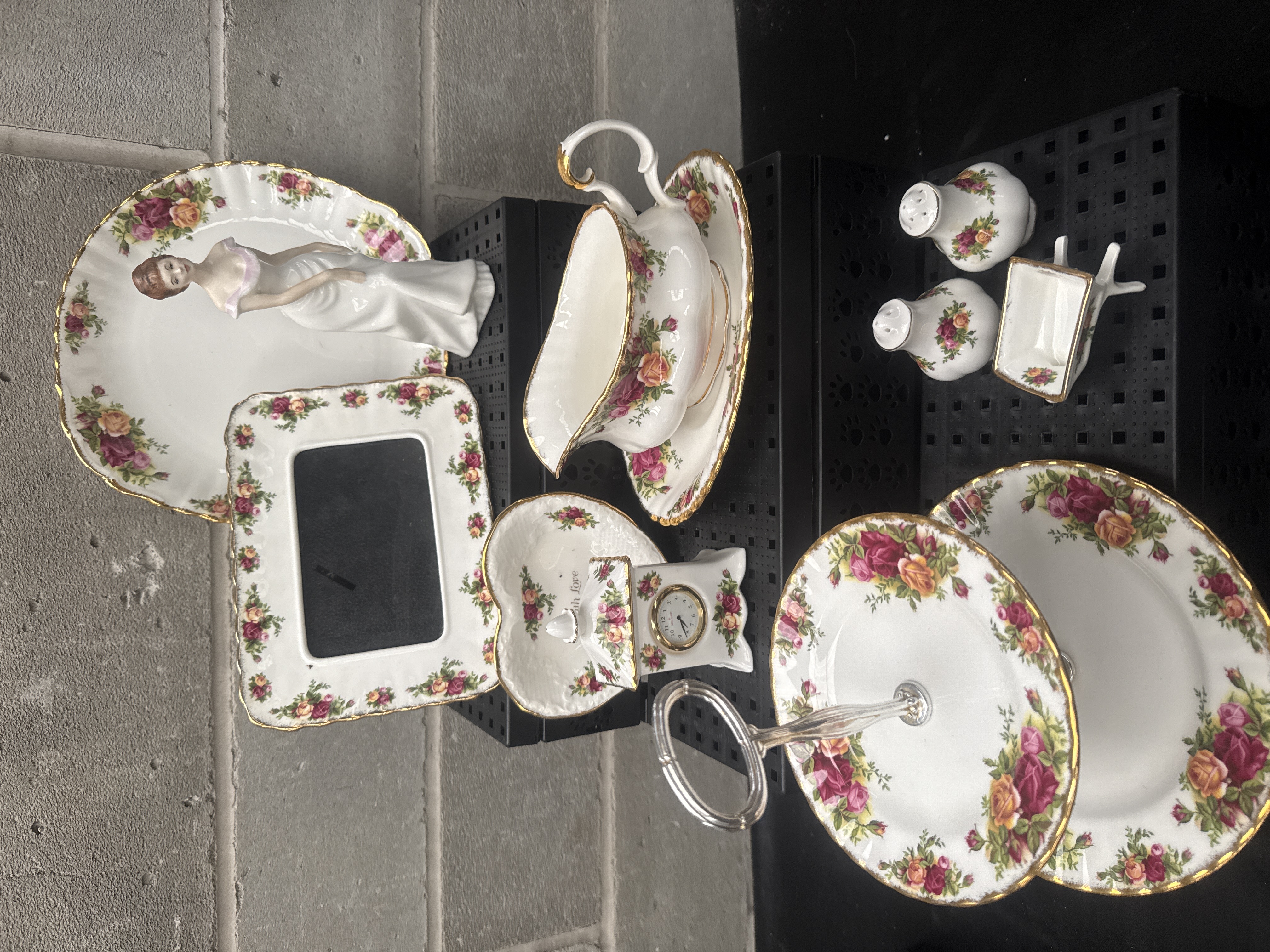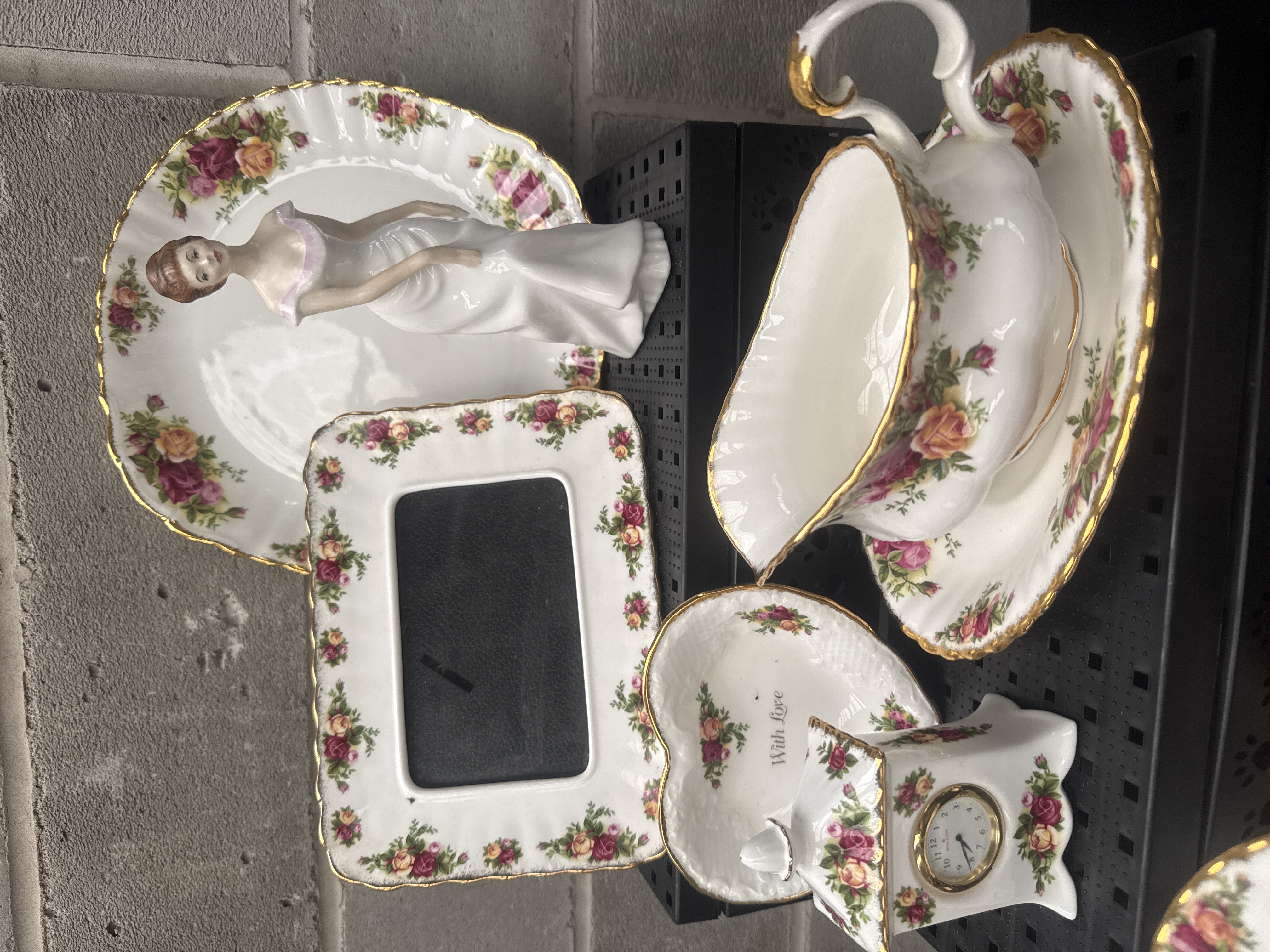 This collection consists of 11 pieces featuring the Royal Albert Old Country Roses pattern, characterized by red, pink, and yellow rose floral transfers with green foliage and heavy gold-gilded edges. The group includes 9 Royal Albert and 2 Royal Doulton items. Specific pieces comprise a two-tier cake stand with a silver-tone metal handle, a sauce boat with a matching underplate, and a porcelain lady figurine depicted in a white and pink dress. Decorative items include a rectangular picture frame, a heart-shaped trinket dish inscribed with the words With Love, and a small mantle clock. The lot is completed by a pair of salt and pepper shakers, a miniature wheelbarrow-shaped dish, and a larger plate. Most items feature the characteristic fluted or scalloped borders associated with this pattern.