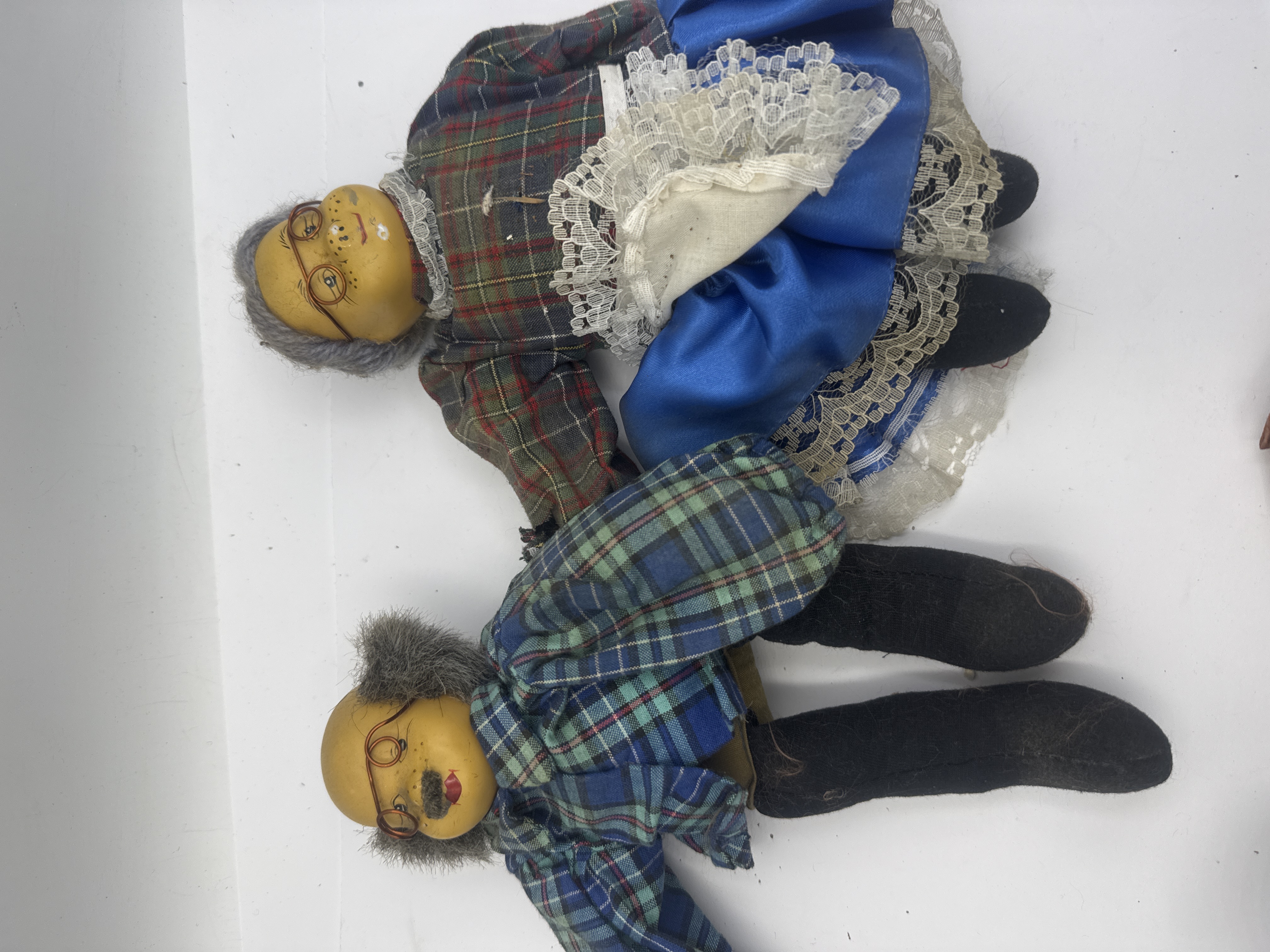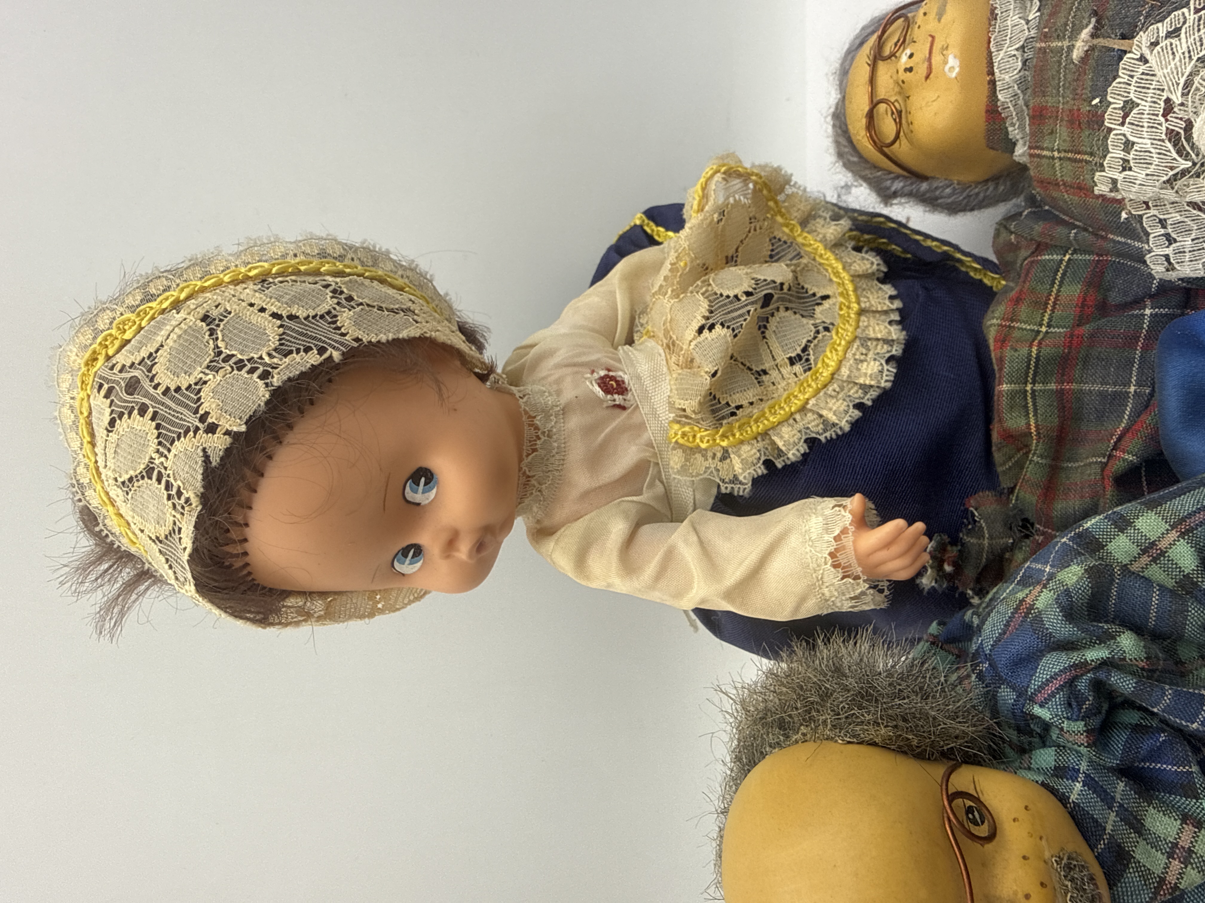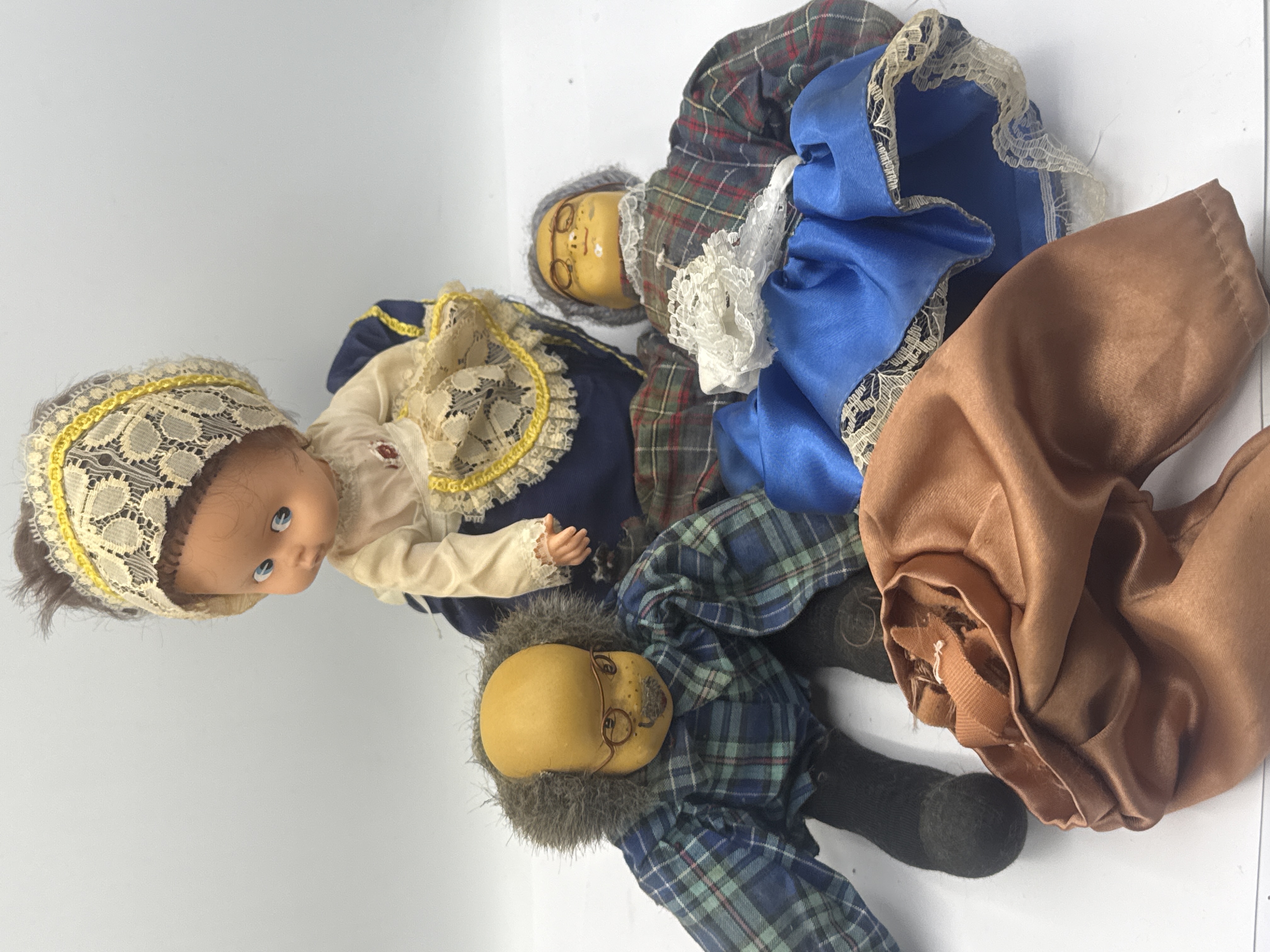 A collection of vintage dolls and associated textile items. The group features two character dolls with yellow-toned composite or papier-mache heads, hand-painted facial features, wire-rimmed spectacles, and gray fuzzy hair. These dolls are dressed in traditional-style plaid outfits with fabric boots, consistent with German Trachten or Schneider style figures. Also included is a mid-20th-century style female doll featuring a vinyl head, blue eyes, and rooted brown hair, wearing an intricate lace-trimmed dress and matching bonnet. The collection is constructed from a variety of materials including vinyl, composite, wire, and assorted textiles such as lace, satin, and plaid fabrics.