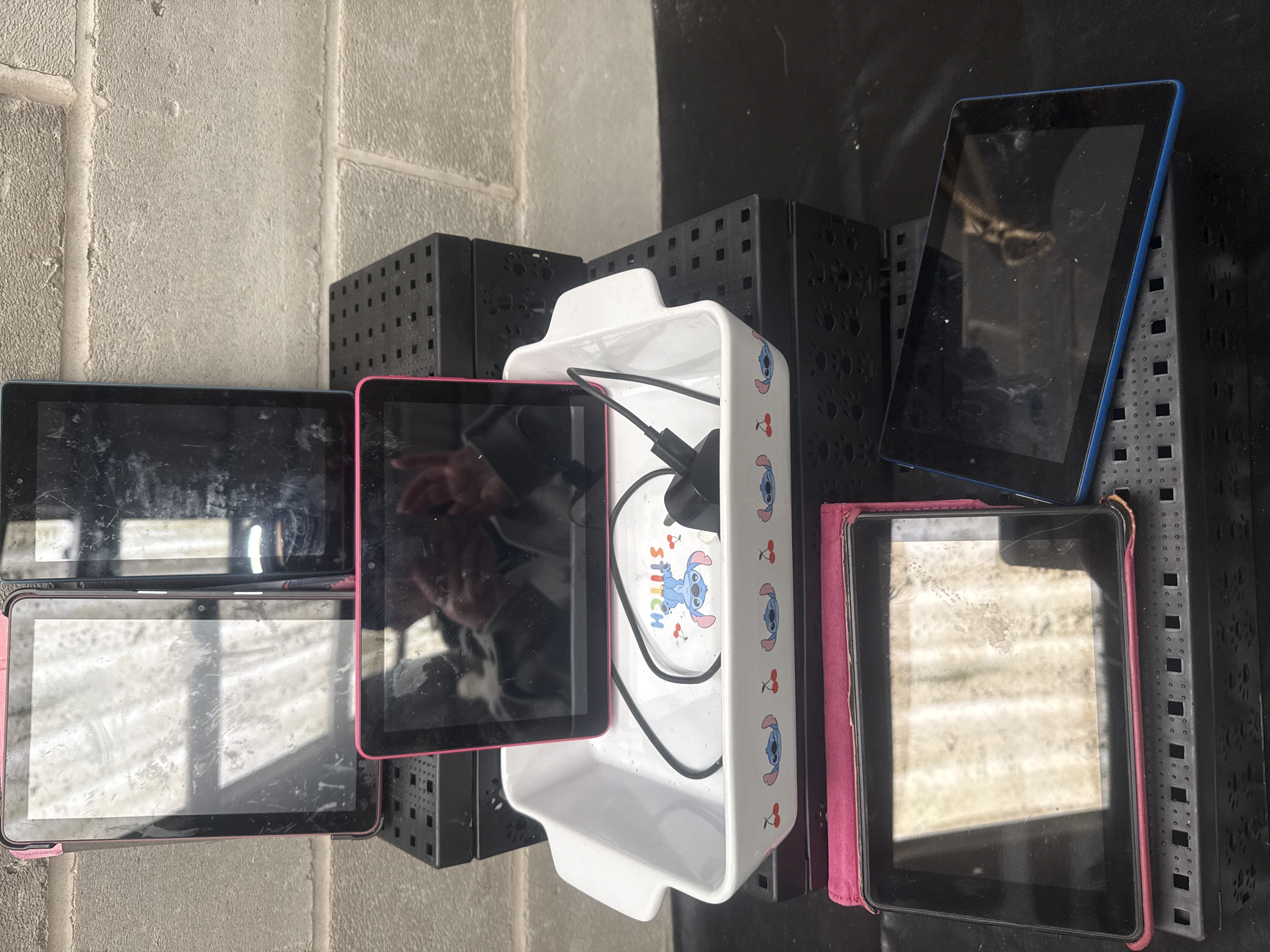 A group of five items including Amazon Kindle Fire Kids Edition tablets and a Disney Stitch themed ceramic dish. The Kindles/Tablets are presented in various sizes and feature colored protective frames in pink and blue. One tablet is contained within a pink folio case. The lot includes a black power adapter and charging cable. The rectangular white ceramic dish is decorated with character illustrations and the name STITCH from the Disney franchise.