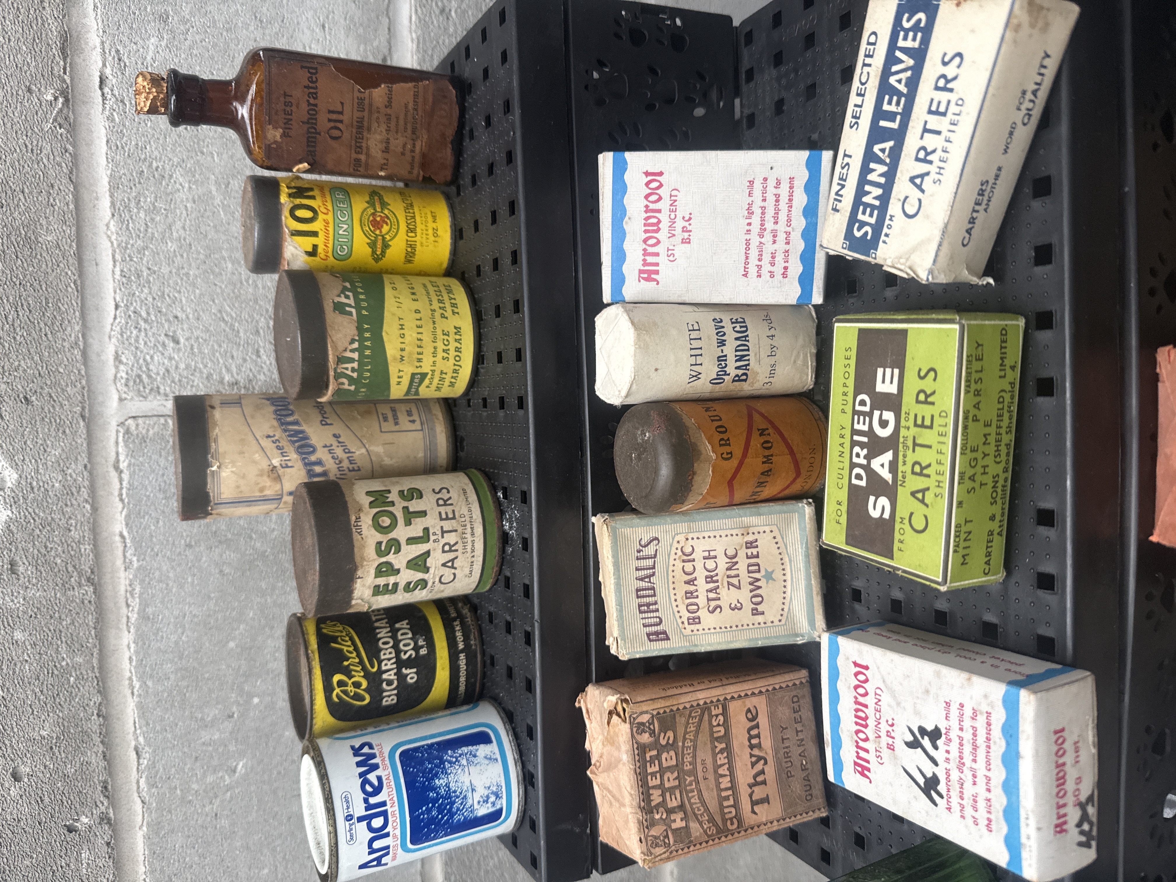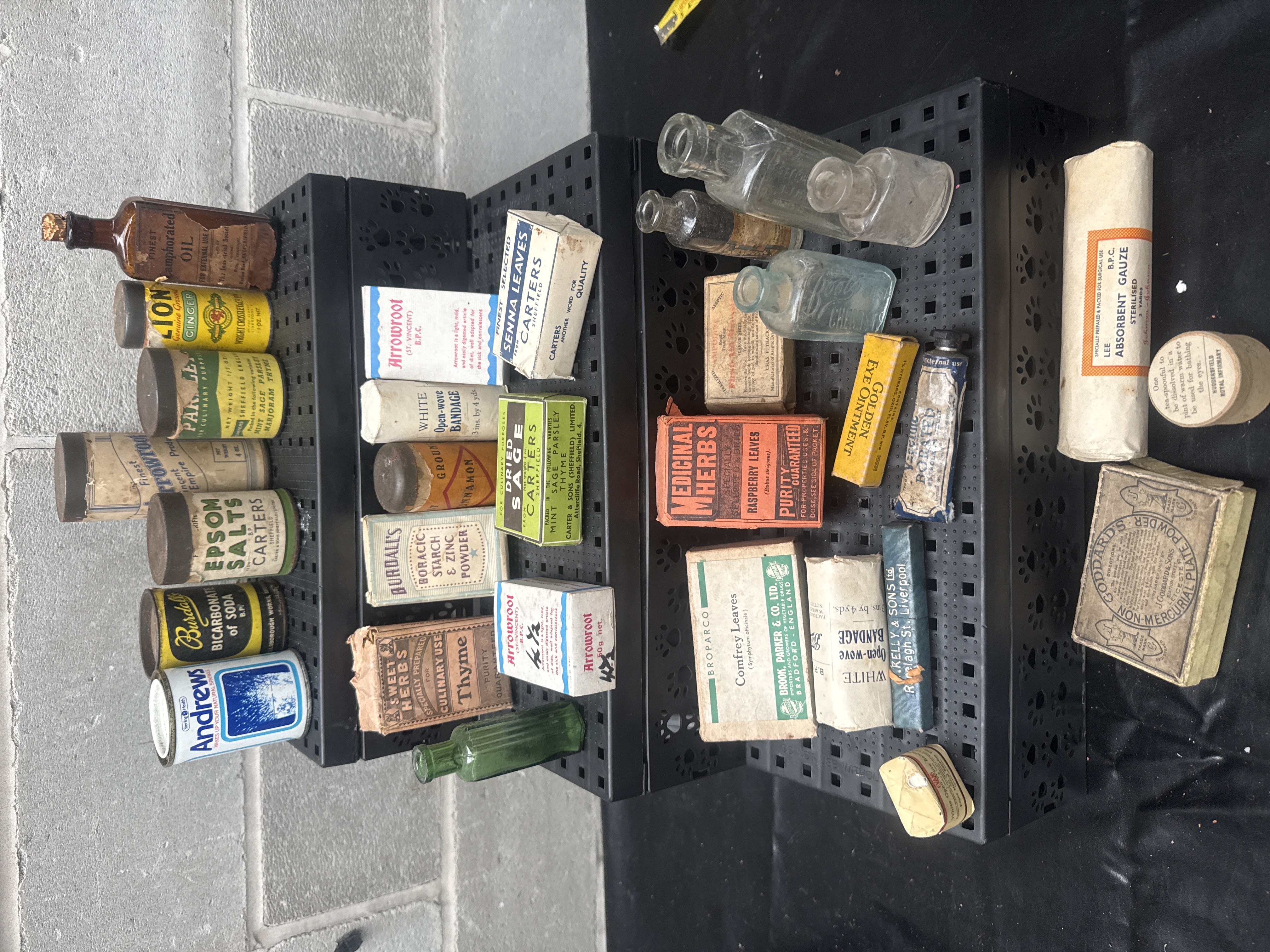 This lot consists of 31 individual items including a variety of vintage and antique apothecary, pharmaceutical, and culinary products. The group features glass bottles in clear, amber, and green glass, as well as cardboard boxes, metal tins, and paper-wrapped medical supplies. Visible branding includes Lion Brand Genuine Ginger, Carters Sheffield herbs and salts, Burdall’s Bicarbonate of Soda, Andrews Liver Salt, and Goddard’s Non-Mercurial Plate Powder. Medicinal supplies include Golden Eye Ointment, Boric Starch & Zinc Powder, and absorbent gauze. Culinary items include dried sage, thyme, and cinnamon. Many of the items are in original packaging with contents included.
