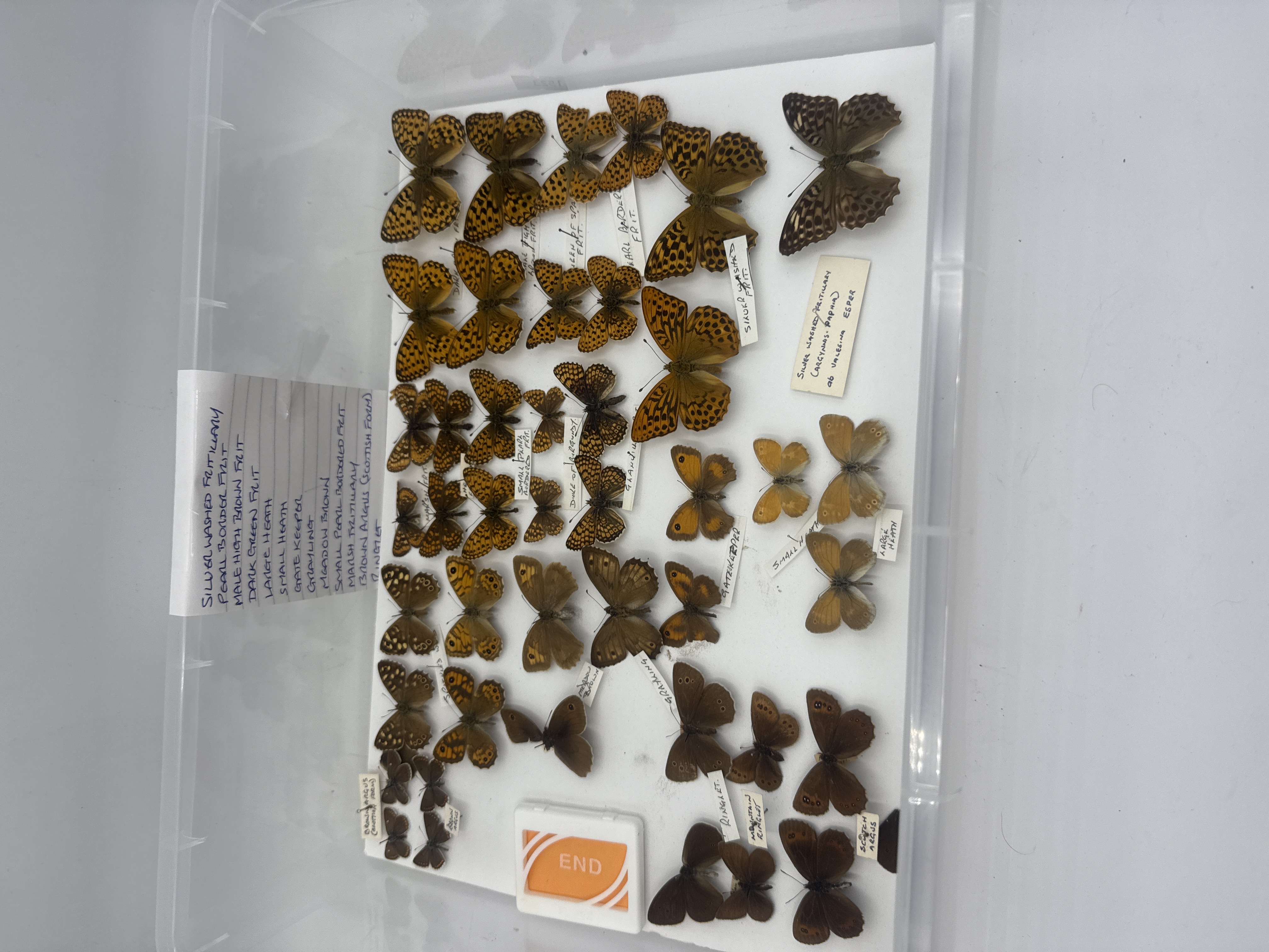 A collection of Great Spangled Fritillary and related entomological specimens featuring various species of butterflies pinned to a white foam board within a clear plastic storage tray. The collection includes numerous specimens with corresponding identification labels, including species such as Silver-washed Fritillary, Pearl-bordered Fritillary, High Brown Fritillary, Dark Green Fritillary, Marsh Fritillary, Gatekeeper, Grayling, and Ringlet, as detailed on a handwritten index list accompanying the group. The specimens are mounted using entomological pins. A small plastic tag marked END is present at the base of the display.
