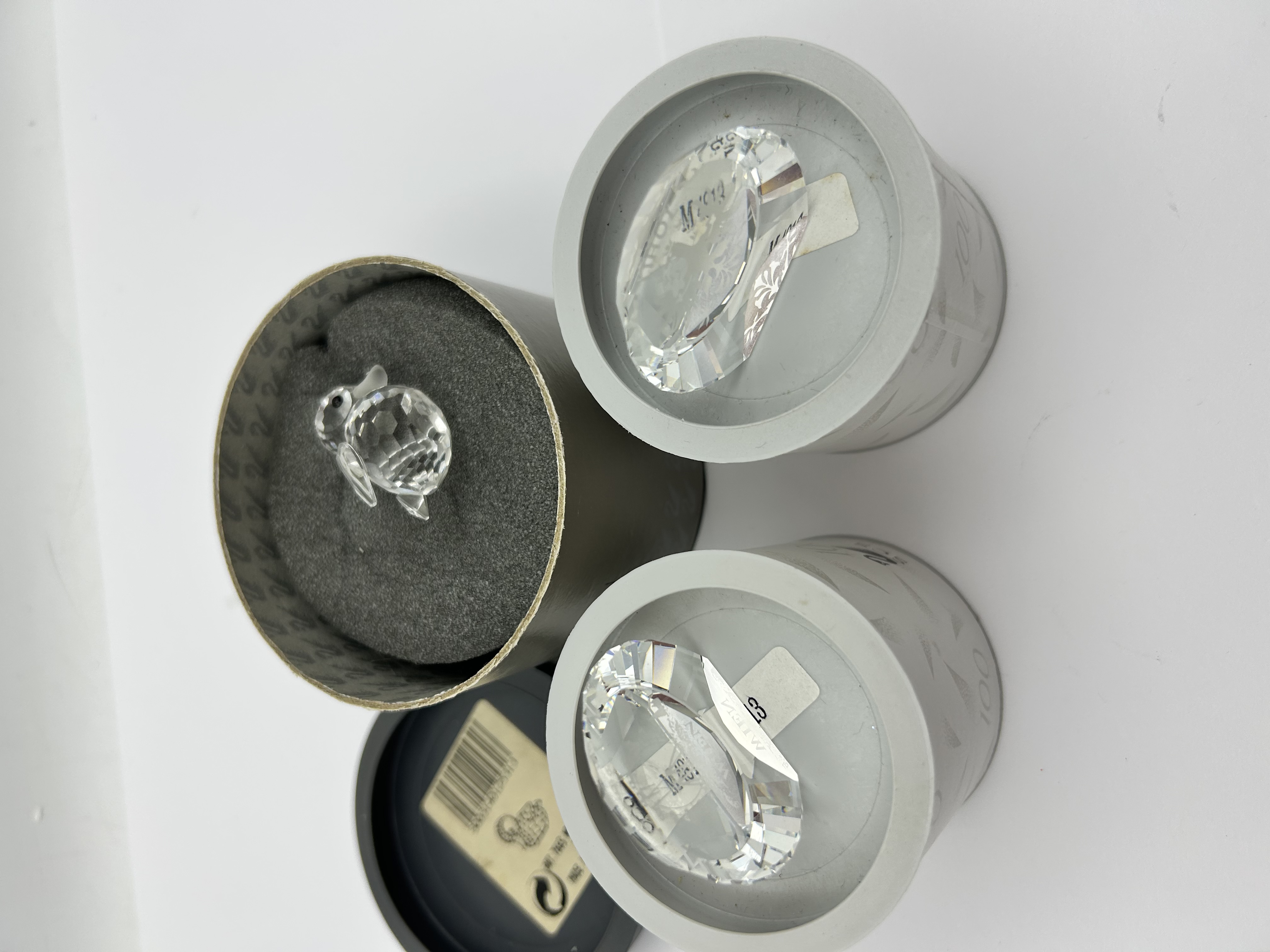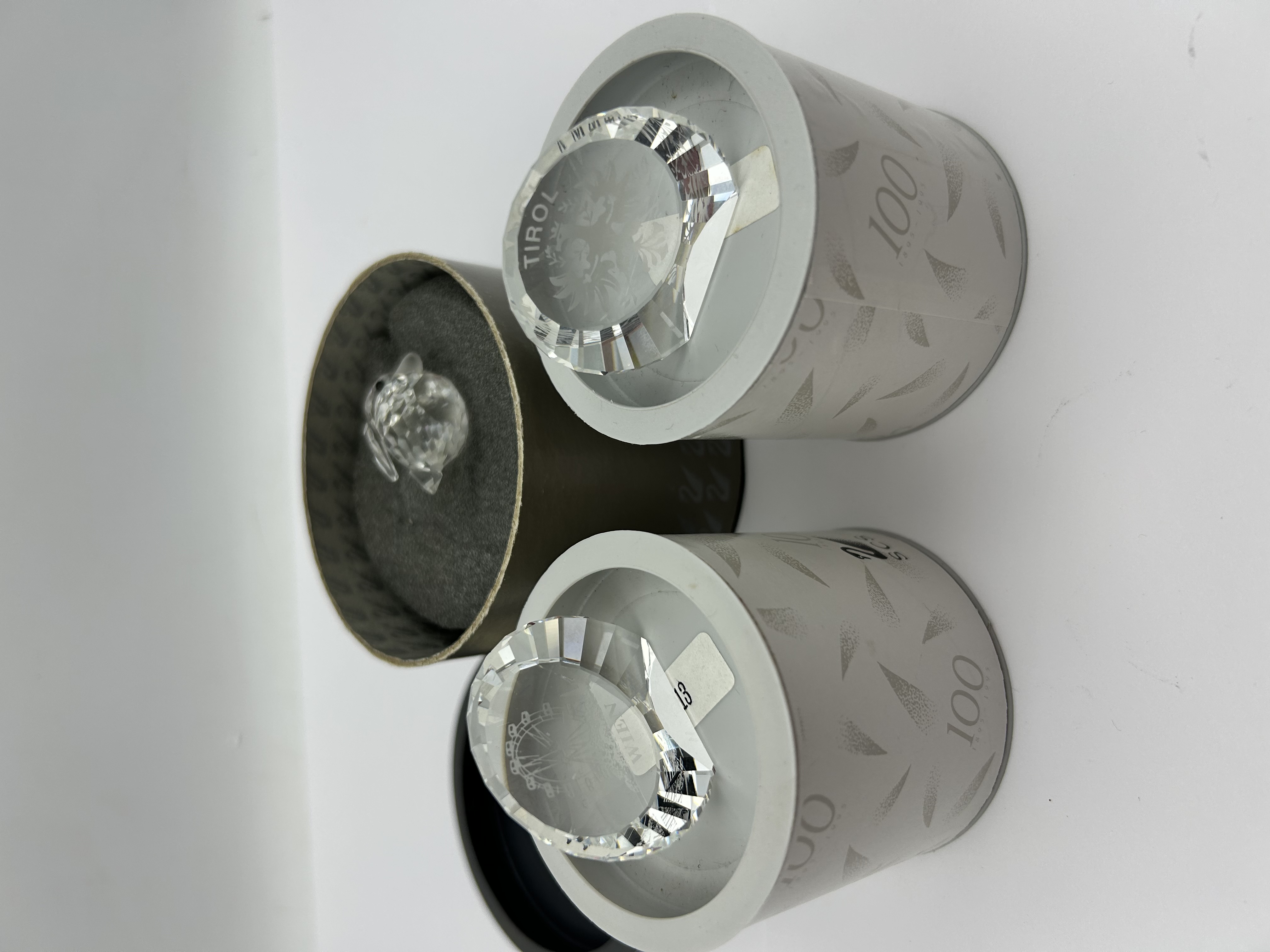 A collection of Swarovski lead crystal items produced for the Swarovski Crystal Society (SCS) centenary. The group includes faceted crystal commemorative discs and a small animal figurine. One disc features an etched design of an edelweiss flower and the text TIROL. The second disc features an etched depiction of the Riesenrad Ferris wheel and the text WIEN. The figurine is a multi-faceted crystal mouse with black eyes. The items are housed in their original white cylindrical containers, which are marked with the Swarovski swan logo, SCS, and 100 1895-1995. The bases of the containers include barcodes and official Swarovski branding.