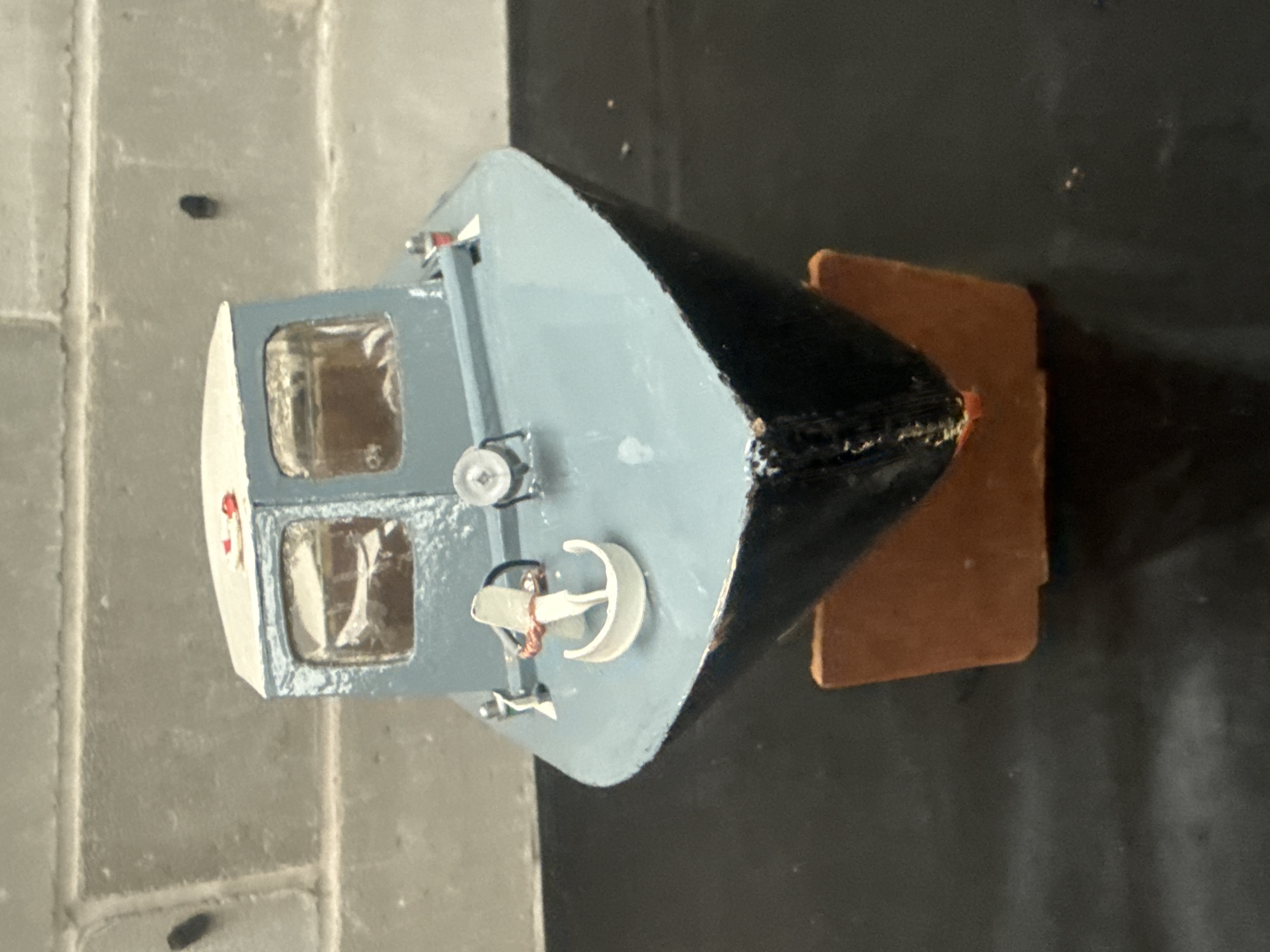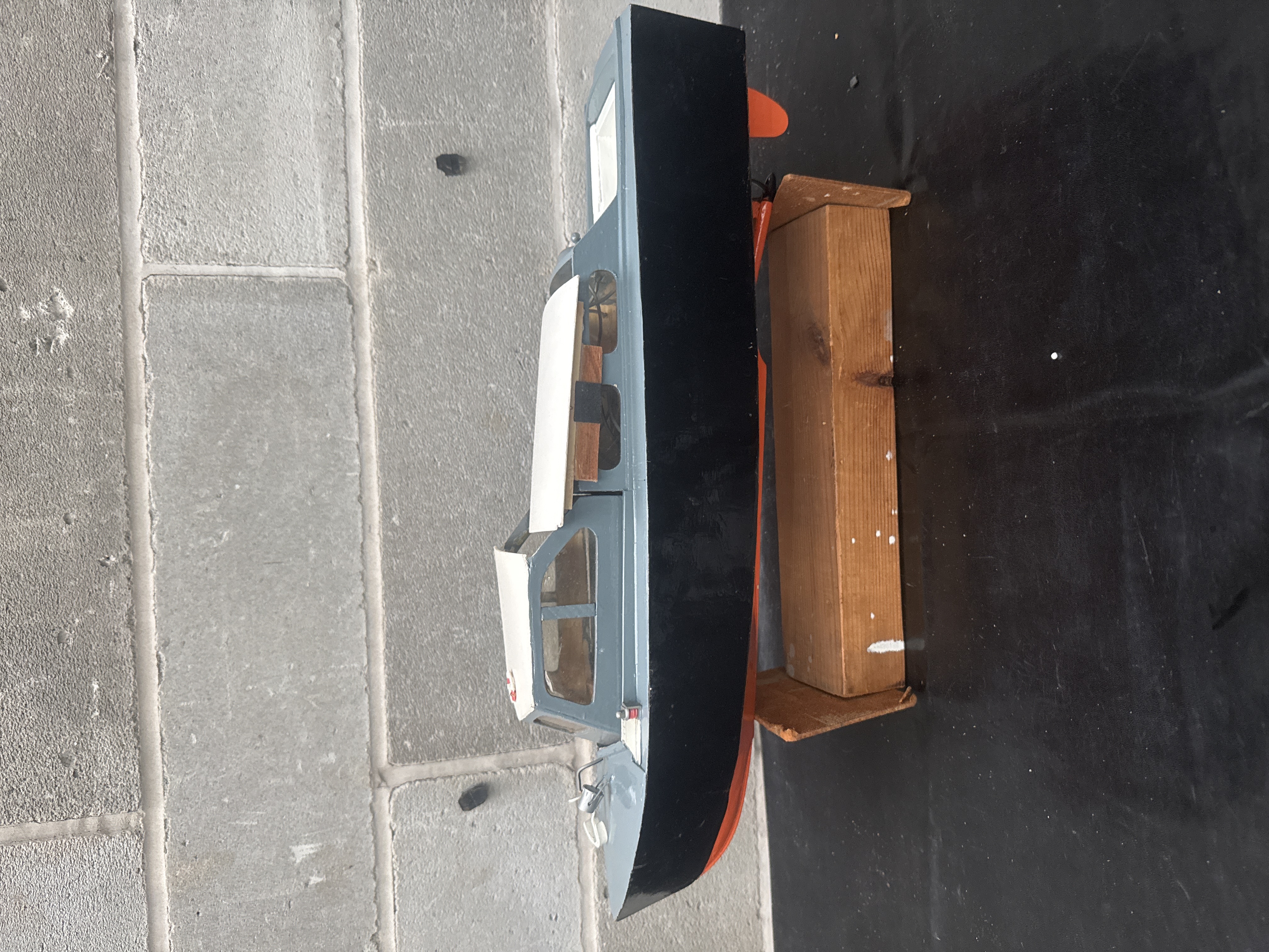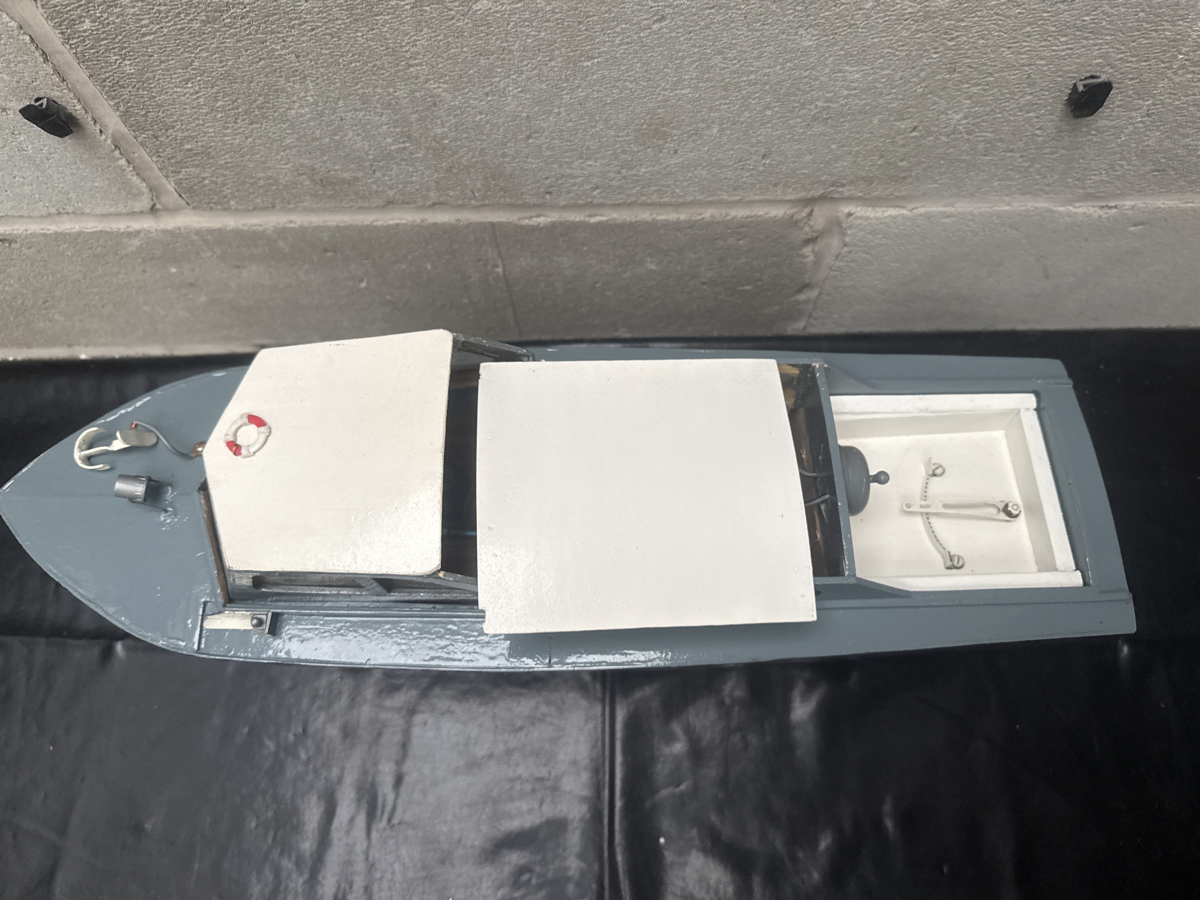 A vintage model motor launch or cabin cruiser of wooden construction with metal and plastic detailing. The hull is finished in black with an orange-painted underside, while the deck and superstructure are painted in a blue-gray tone. The model includes several miniature features, such as a white cabin roof with a small lifebuoy, a bow-mounted anchor, and a visible steering mechanism in the aft cockpit. The vessel is designed with removable cabin roof sections and rests on a simple, rectangular wooden display stand. No maker’s marks or inscriptions are visible.