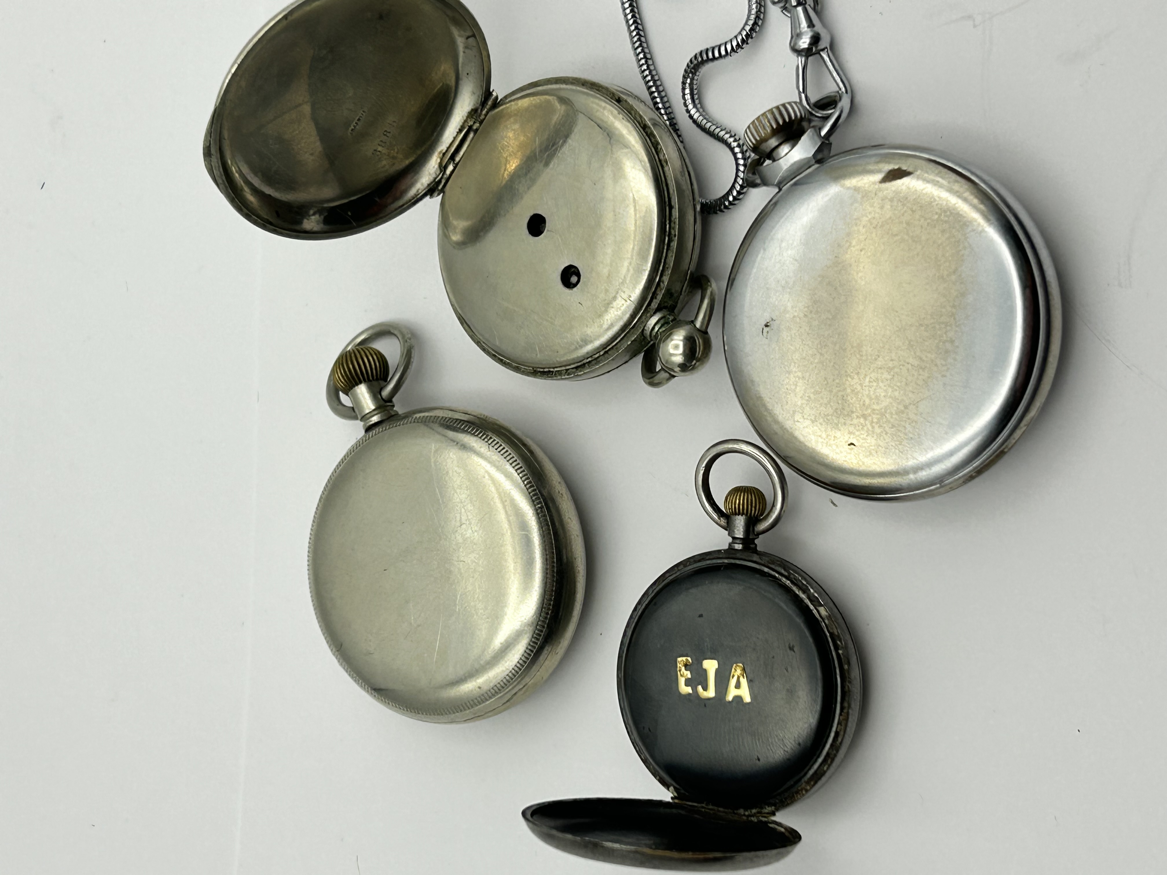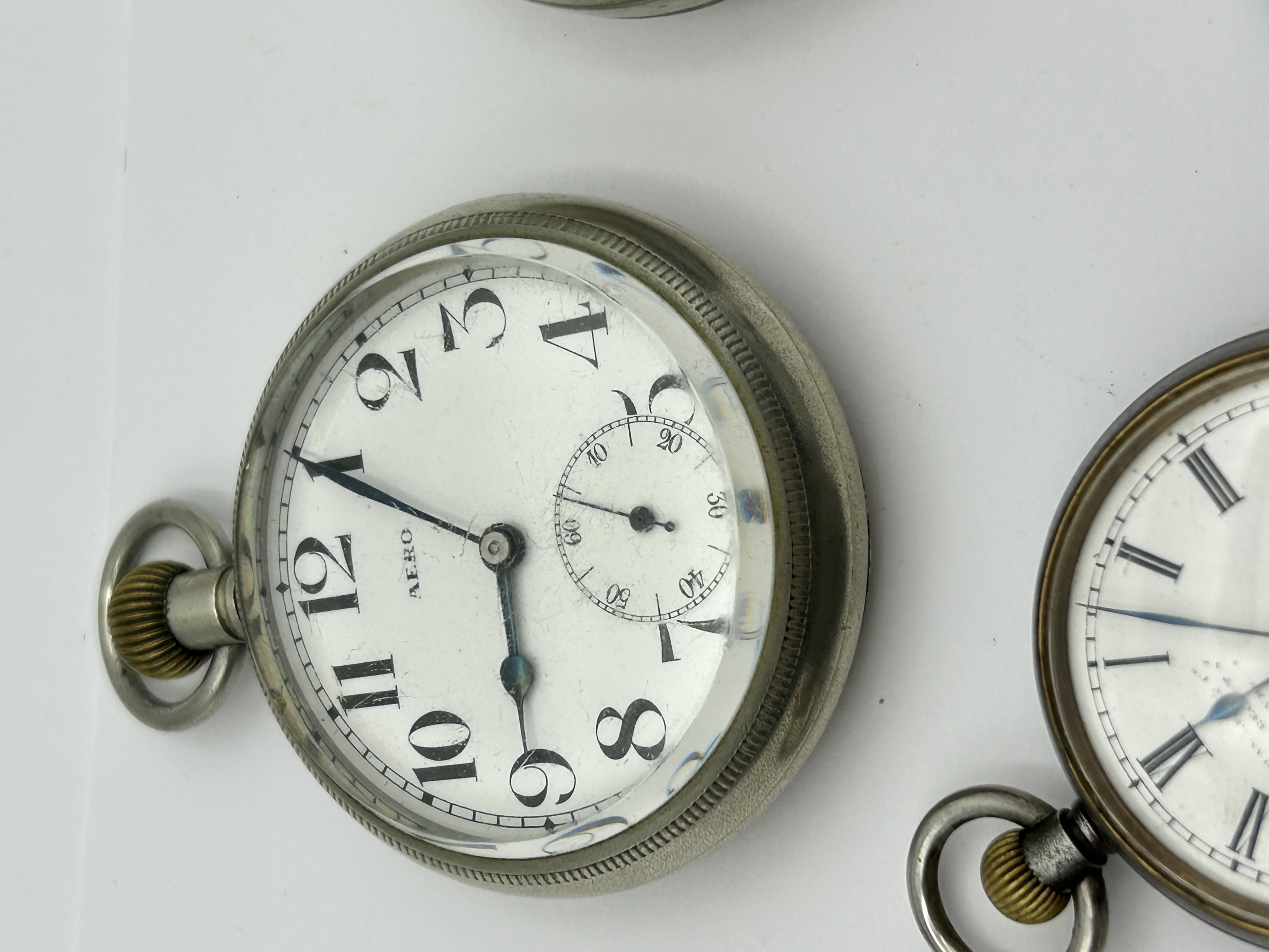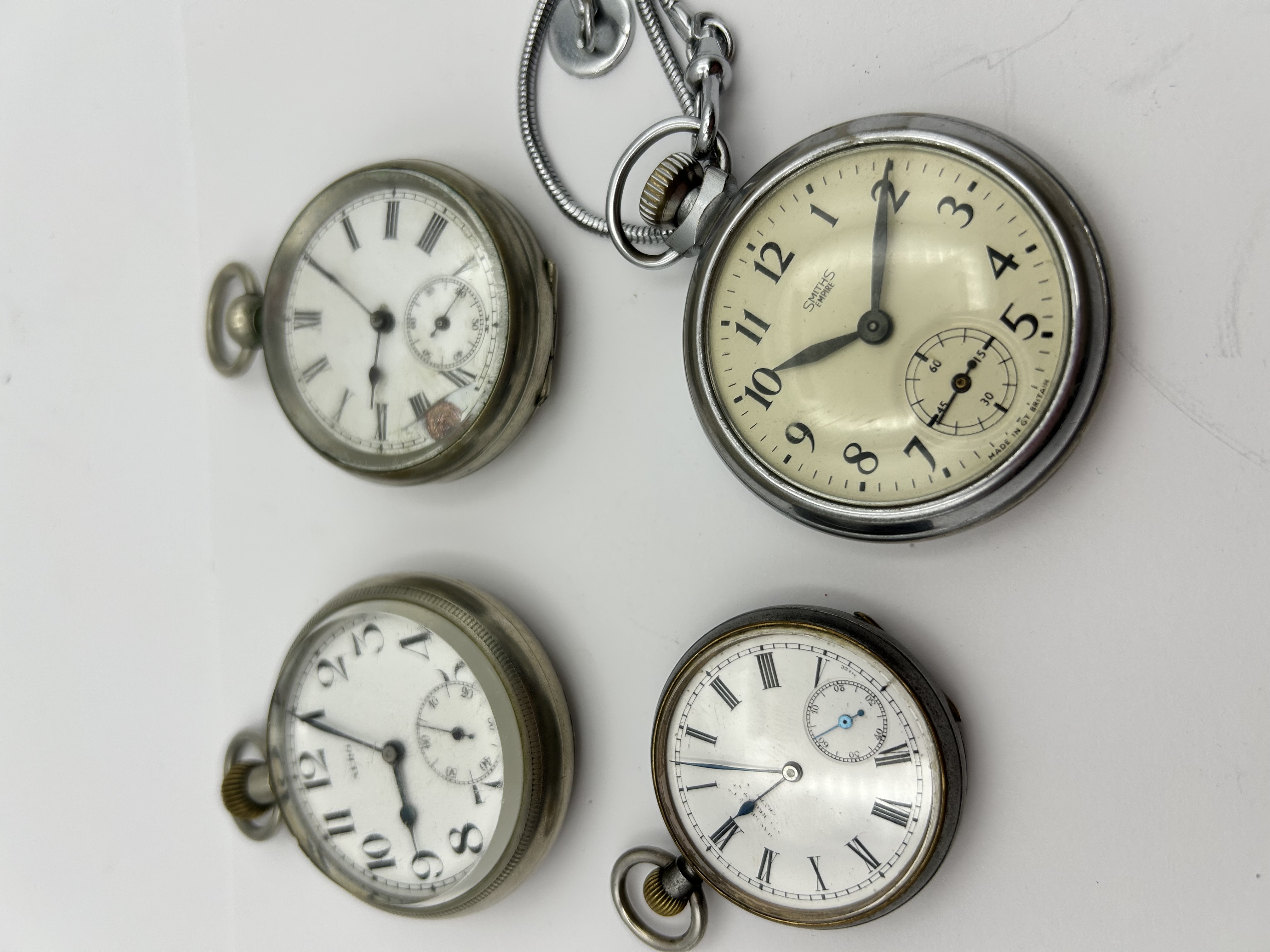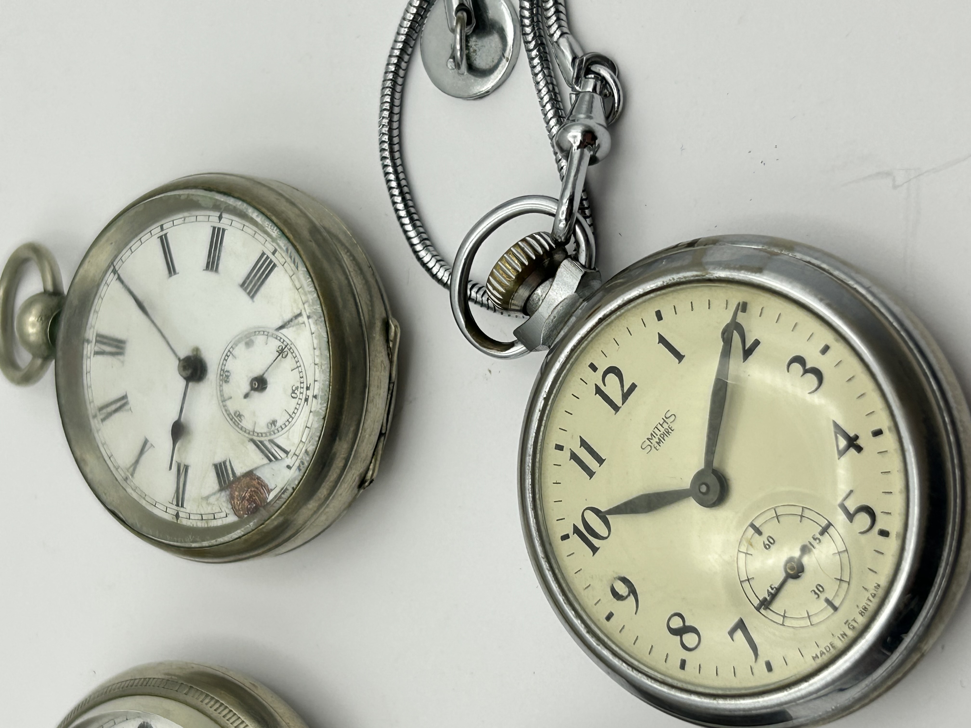 A collection of vintage open face pocket watches of various designs and origins. The group includes a British made Smiths Empire model featuring an off white dial with Arabic numerals and a subsidiary seconds dial at the six o clock position, attached to a silver tone metal snake chain. Also included is a watch marked AERO with bold Arabic numerals and a subsidiary seconds dial. Two additional watches feature white dials with Roman numerals and subsidiary seconds dials. The cases are constructed from silver tone metals. One watch features a hinged case back revealing two winding apertures, while another includes an inner case cover marked with the gold tone initials EJA.
