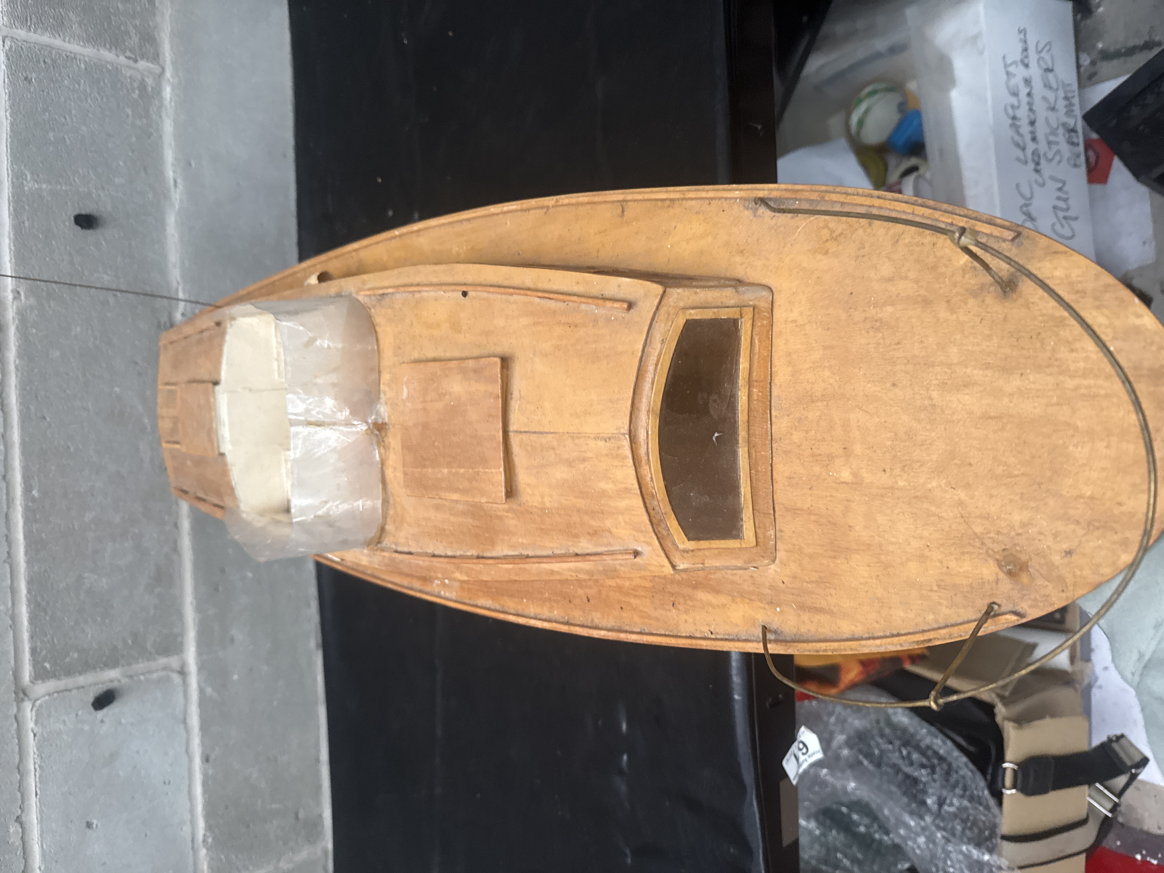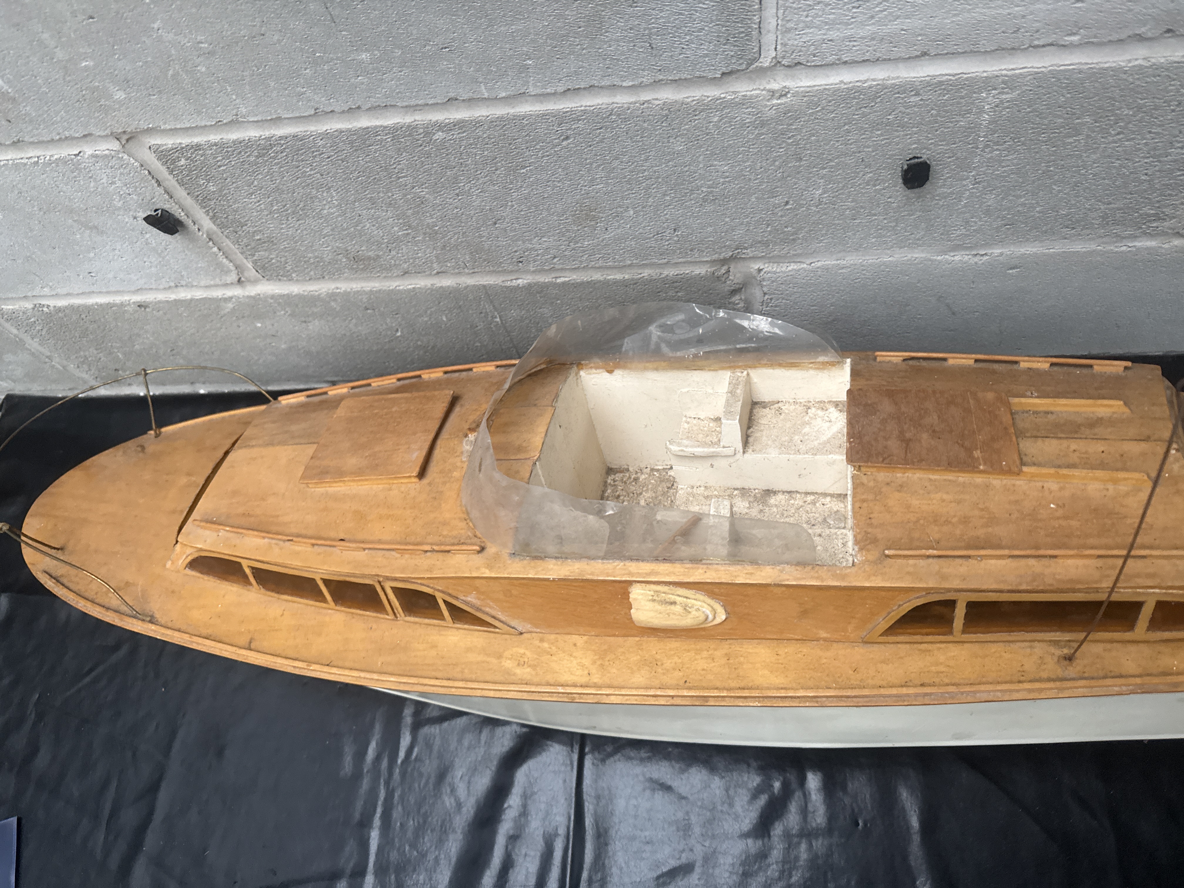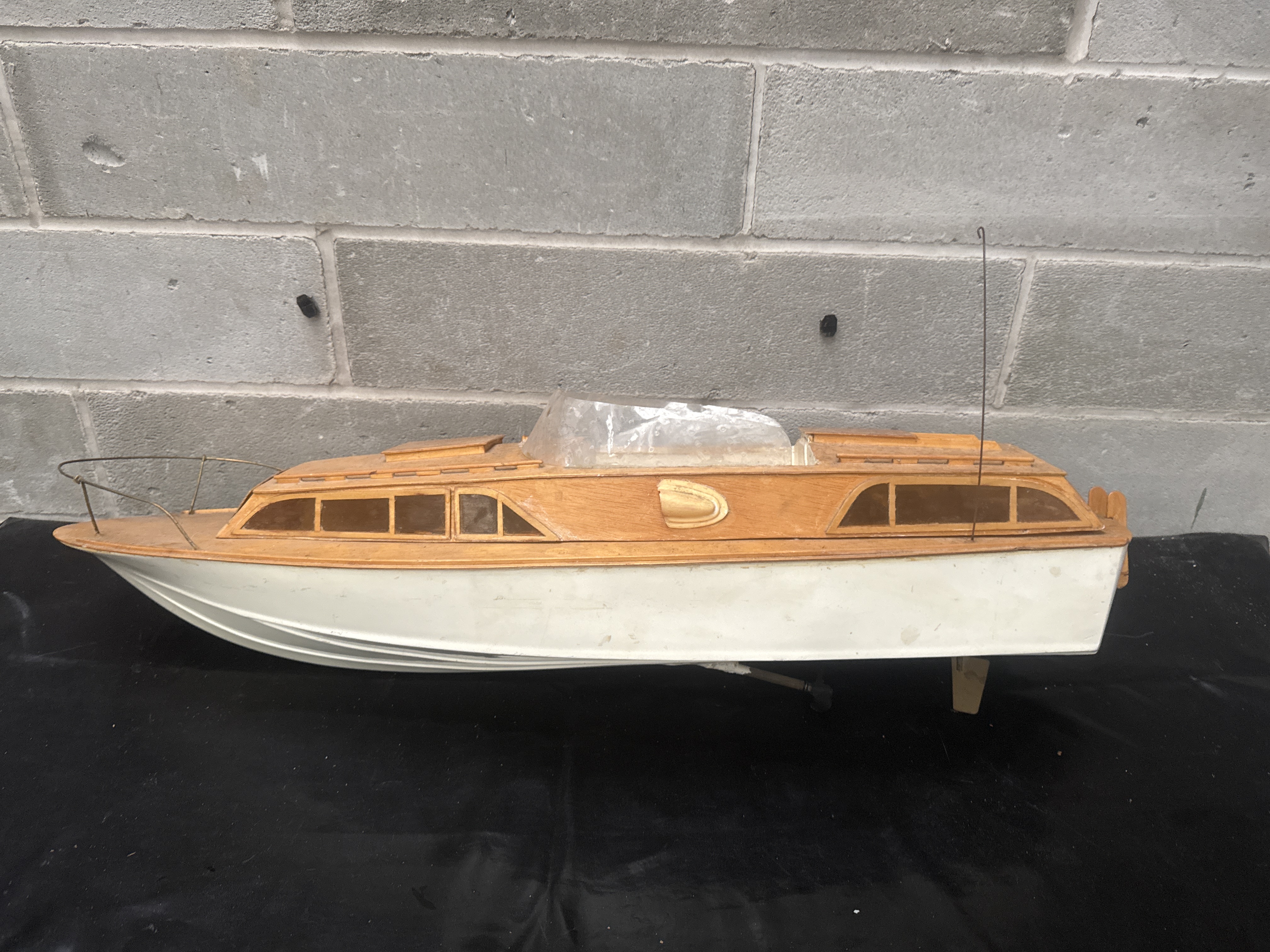 A 1/12 scale wooden model of a 1954 Chris-Craft Commander Express Cruiser. The model features a natural-finish wooden upper deck and cabin structure set upon a white painted hull. Design elements include a wire bow railing, a tall rear-mounted antenna, and multiple inset cabin windows. The central open cockpit area contains a clear plastic windshield. Below the hull, mechanical components including a propeller shaft and a rudder are visible. This 35 inch long model reflects mid-20th-century nautical design and is consistent with kits produced by Dumas.
